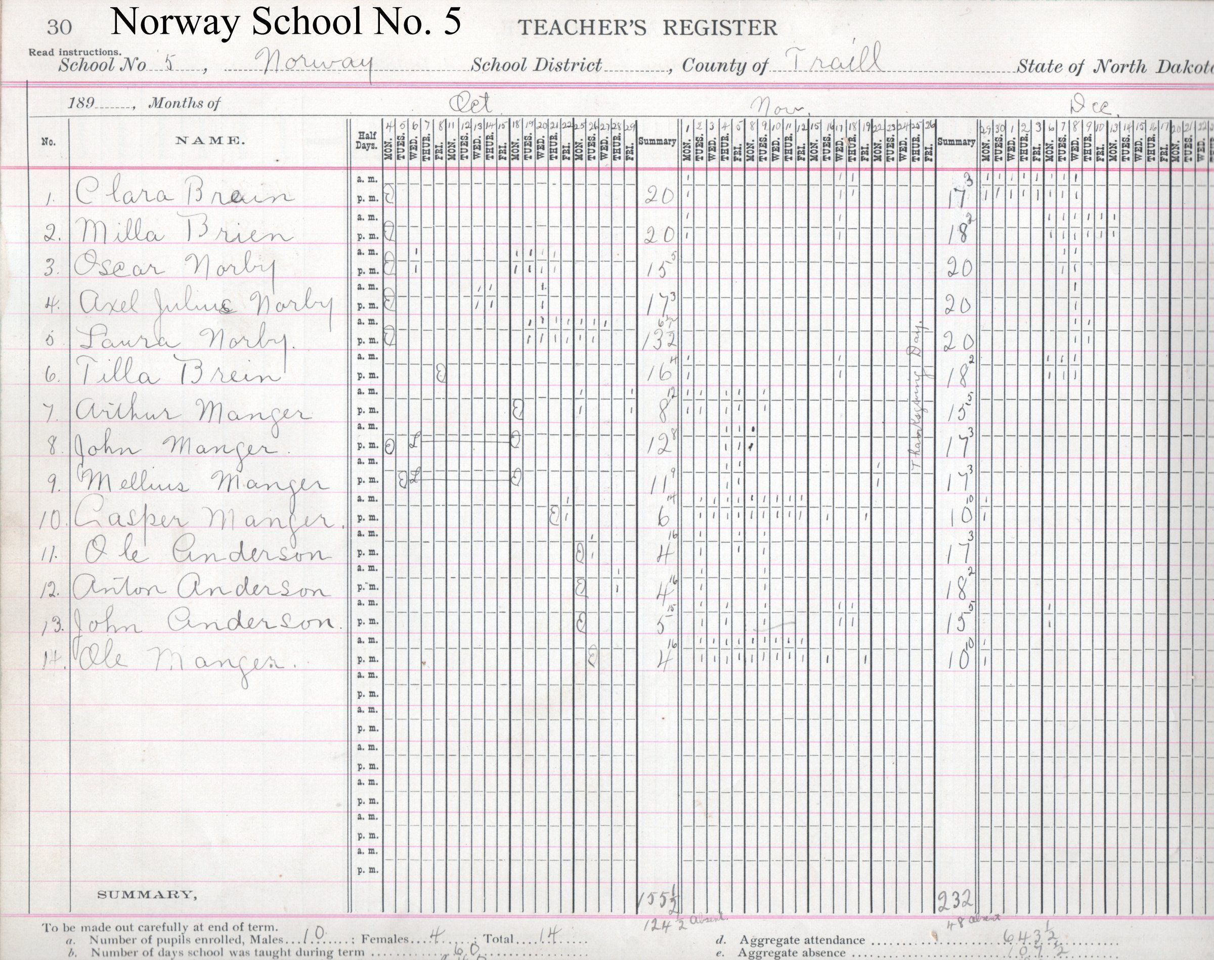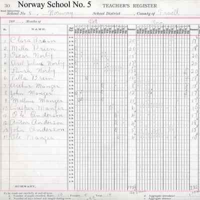 On the Teacher’s Register pages for October, November & December 1897, Helen Quamme kept attendance records for 14 students including Anton Anderson, John Anderson, Ole Anderson, Clara Brien, Milla Brien, Tilla Brien, Arthur Manger, Casper Manger, John Manger, Mellius Manger, Ole Manger, Axel Julius Norby, Laura Norby, Oscar Norby.