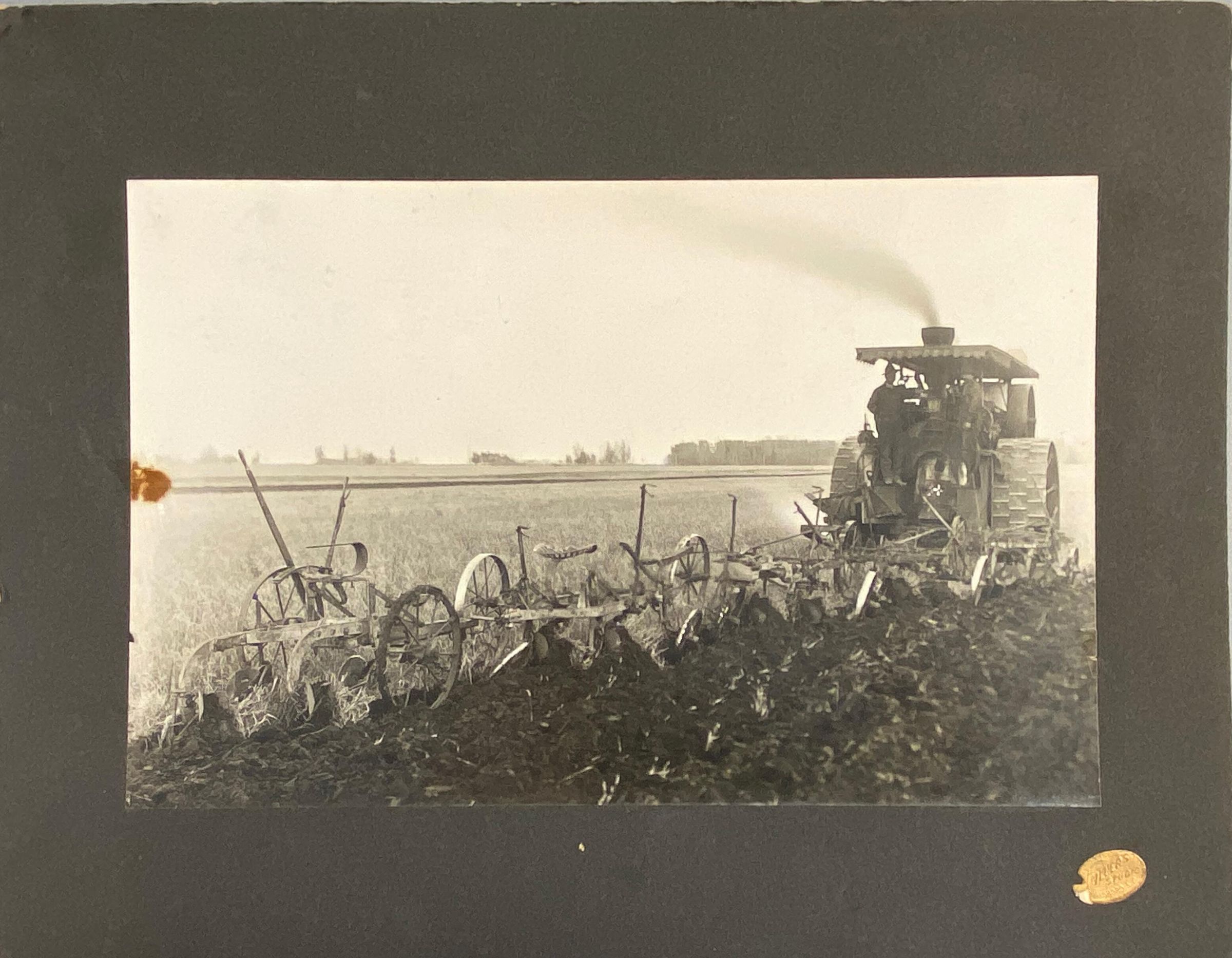Steam-powered tractor pulling five plowsCataloged By