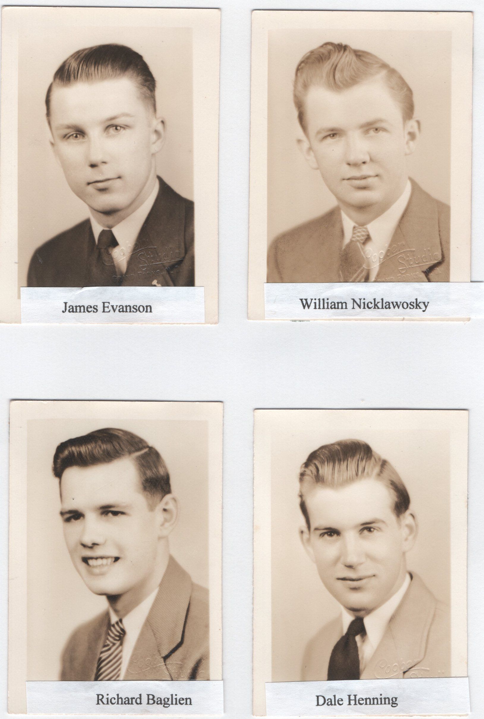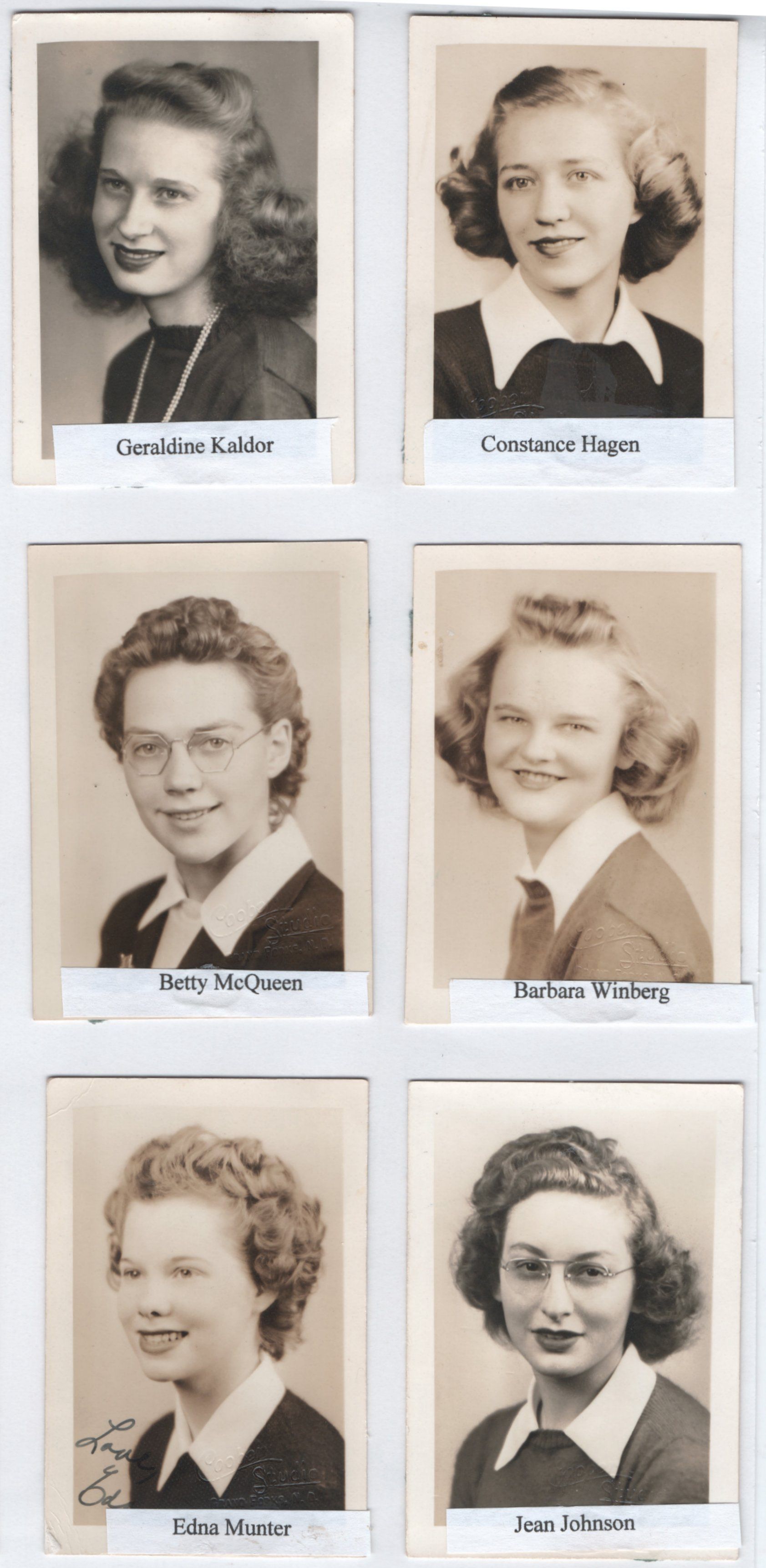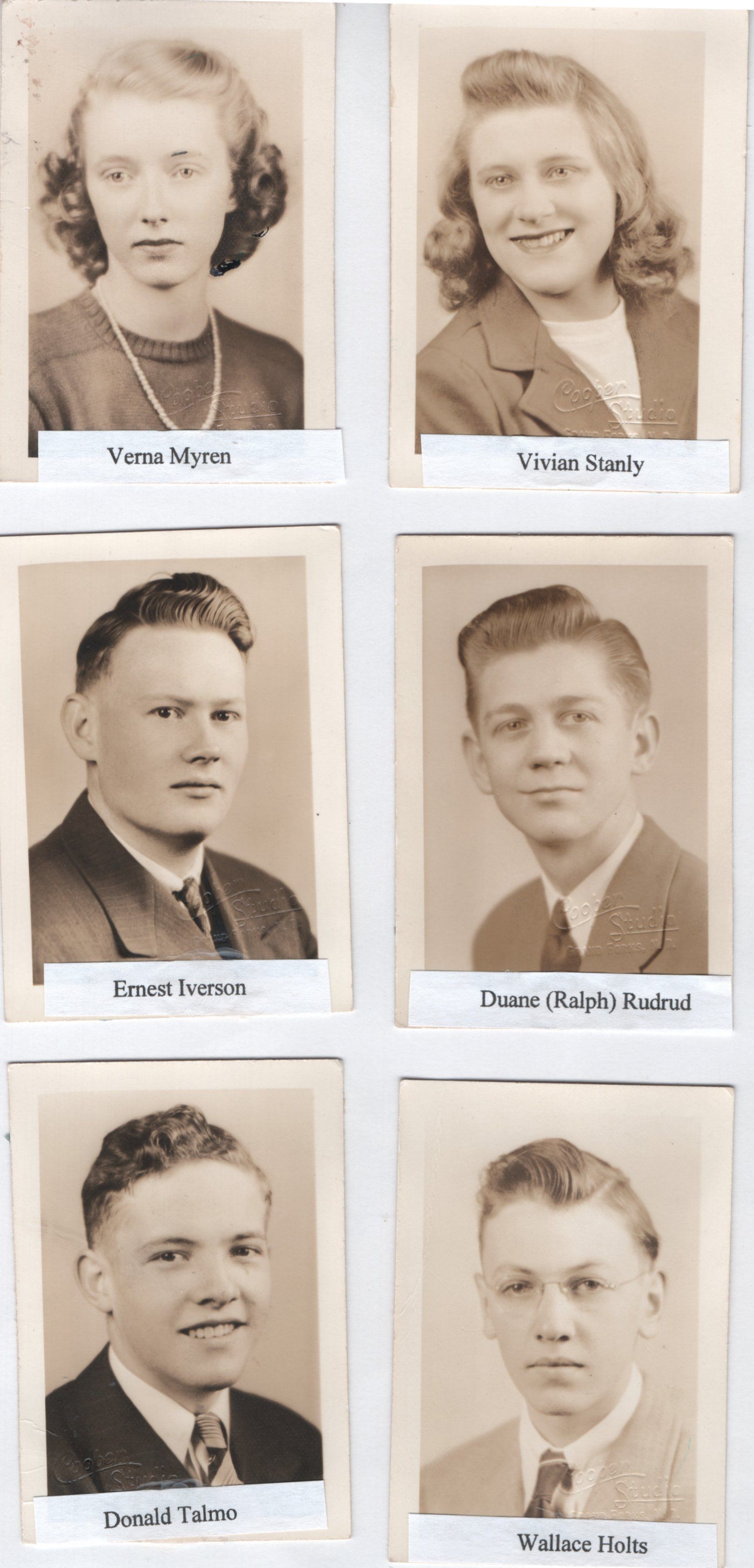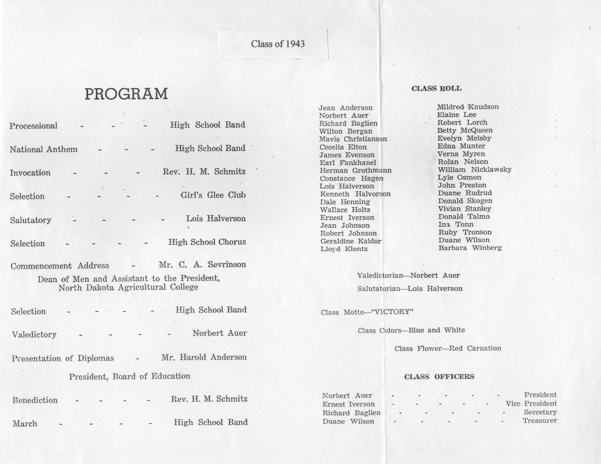 Included in this Catalogit entry 2023.457.1 are a commencement program and eight pages of photographs of Class of 1943 Seniors, including Jean Anderson Norbert Auer, Richard Baglien, Mavis Christenson, James Evenson, Earl Fankhanel, Herman Grothmann, Constance Hagen, Kenneth Halvorson, Dale Henning, Wallace Holtz, Ernest Iverson, Jean Johnson, Geraldine Kaldor, Lloyd Klontz, Mildred Knudson, Betty McQueen, Evelyn Melsby, Edna Munter, Verna Myren, Rolan Nelson, William Nicklawsky, Lyle Osmon, John Preston, Duane (Ralph) Rudrud, Vivian Stanley, Donald Talmo, Ina Tonn, Ruby Tronson, Duane Wilson, and Barbara Winberg.