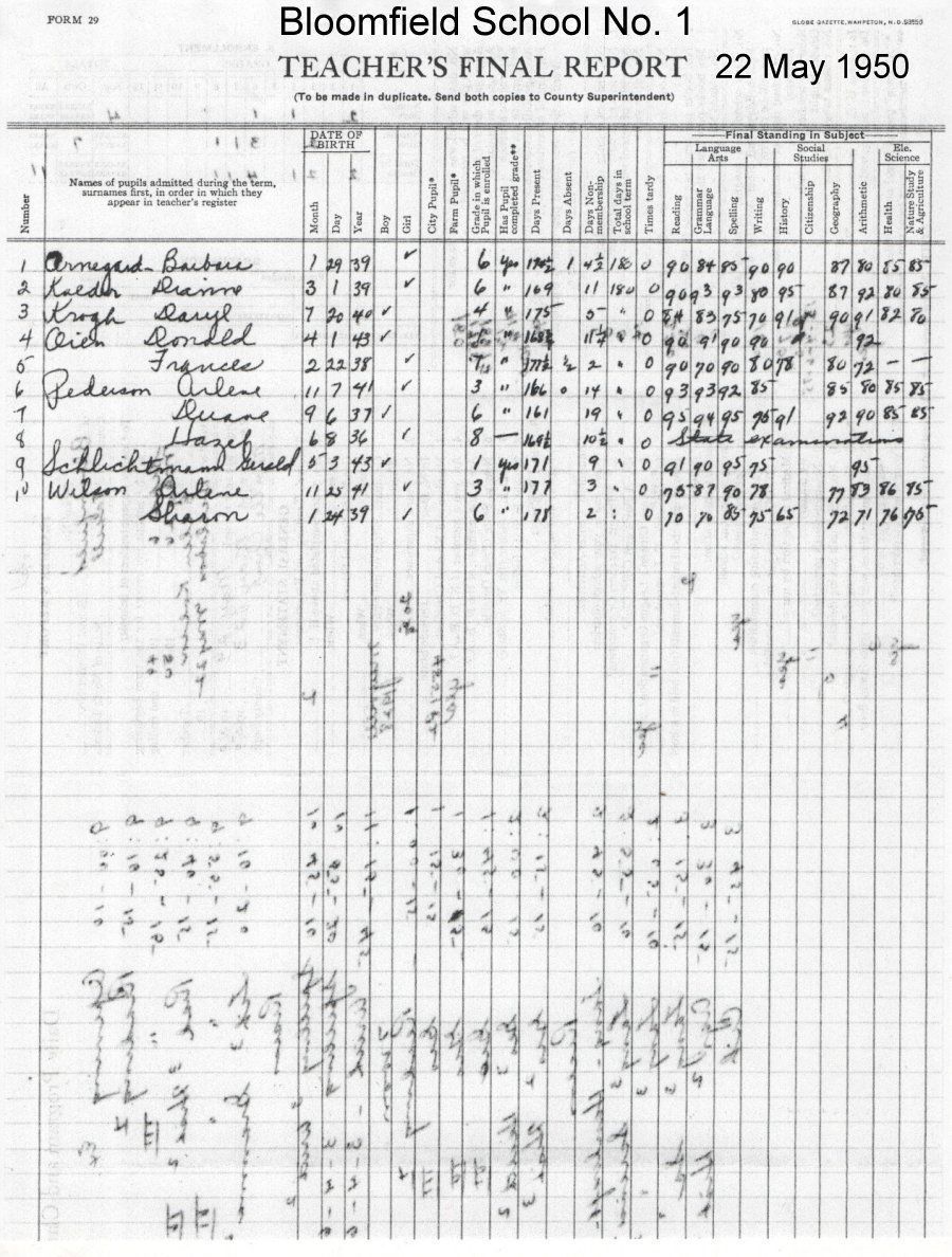 On 22 May 1950, Bloomfield School No. 1 teacher Ellen Kaldor reported attendances and standings in studies pursued for 11 students, including Barbara Arnegard, Dianne Kaldor, Daryl Krogh, Donald Oien, Frances Oien, Arlene Pederson, Duane Pederson, Hazel Pederson, Gerald Schlichtmann, Arlene Wilson, and Sharon Wilson.