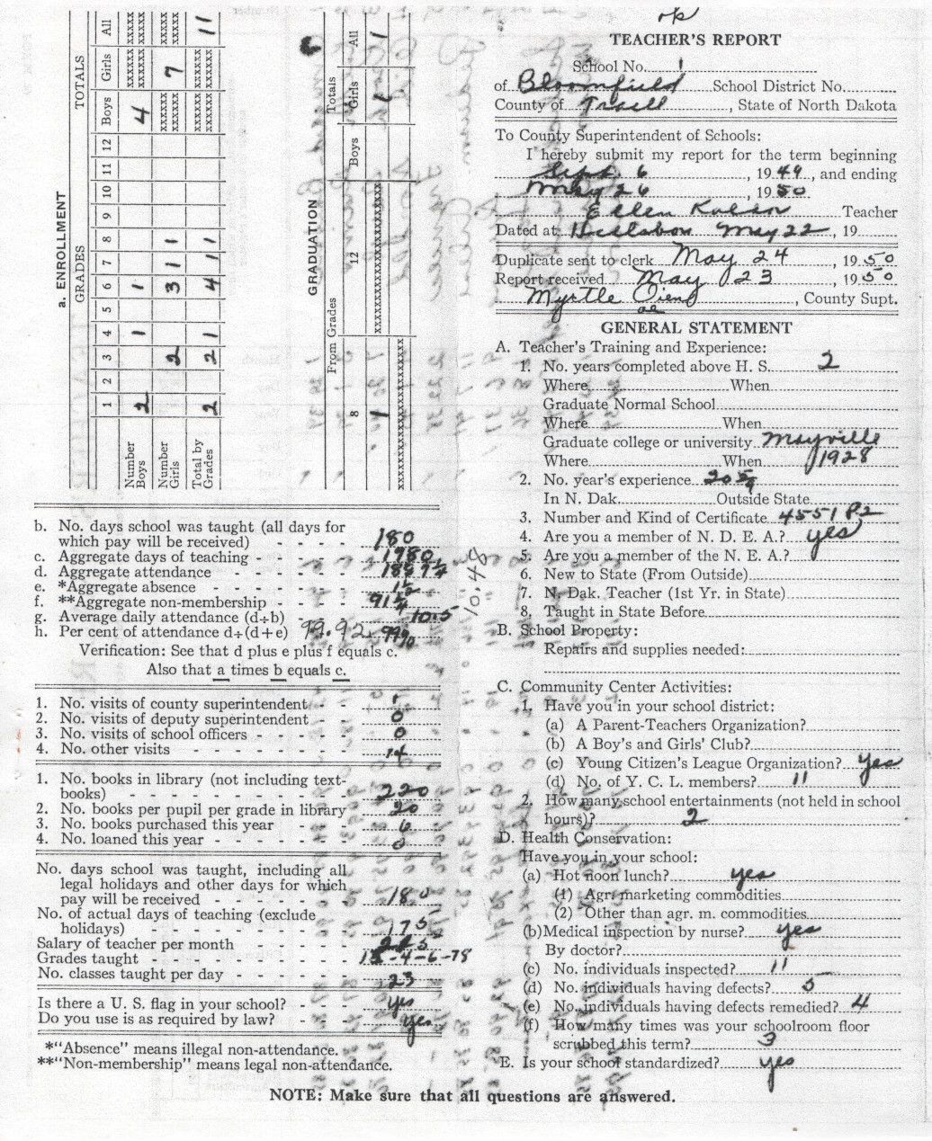 Bloomfield School No. 1, 1950 Teacher's ReportEntry/Object ID