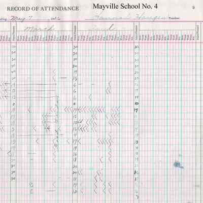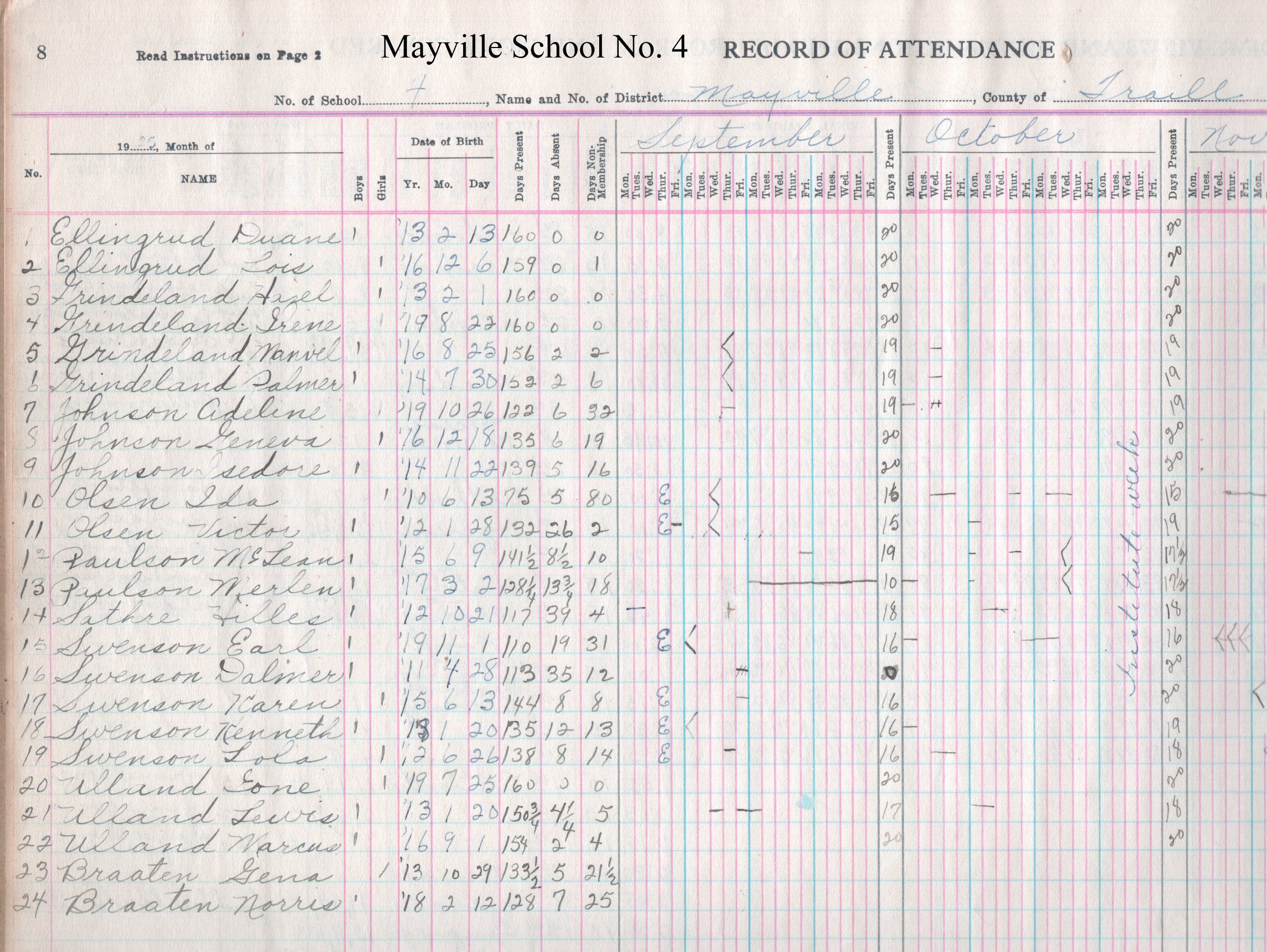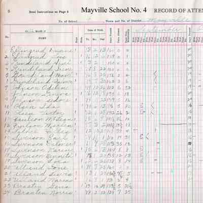 During the 1925-1926 school year, Mayville School No. 4 teacher, Hannah Haugen, kept attendance records for 24 students including Gena Braaten, Norris Braaten, Duane Ellingrud, Lois Ellingrud, Hazel Grindeland, Irene Grindeland, Manvel Grindeland, Palmer Grindeland, Adeline Johnson, Geneva Johnson, Isadore Johnson, Ida Olsen, Victor Olsen, McLean Paulson, Merlen Paulson, Hillis Sathre, Earl Swenson, Delmer Swenson, Karen Swenson, Kenneth Swenson, Lola Swenson, Ione Ulland, Louis Ulland, and Marcus Ulland.Acquisition