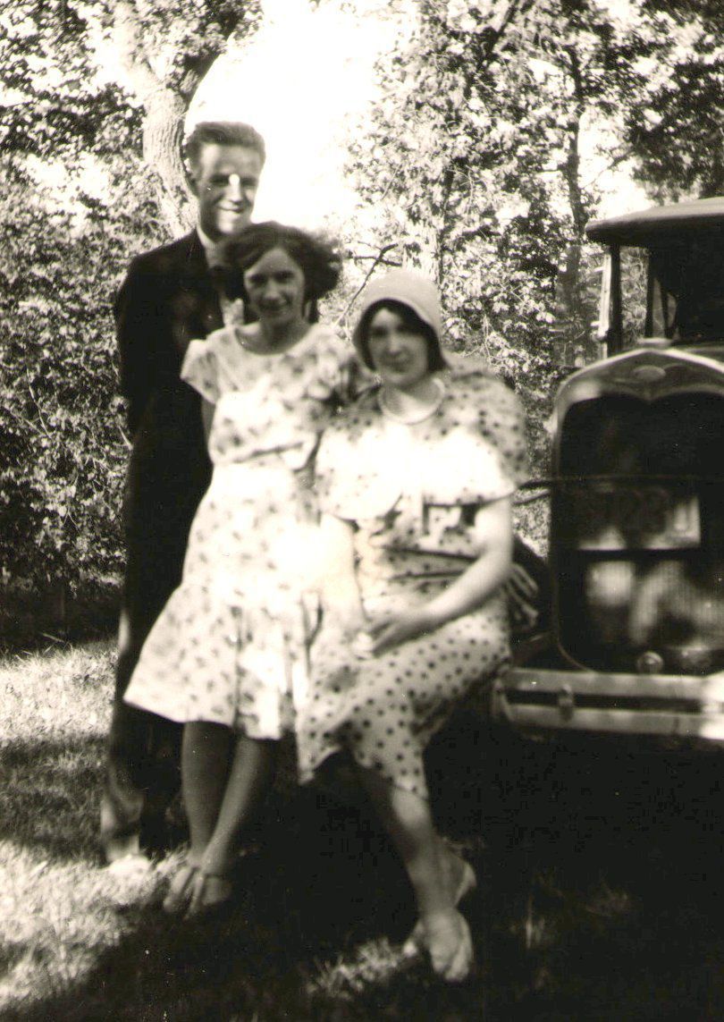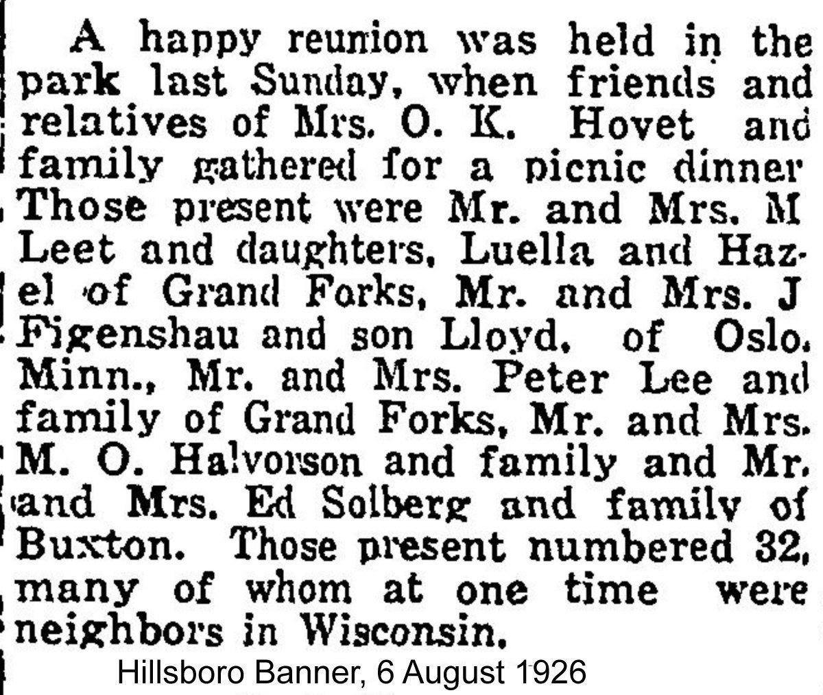 Another relative of Stina Hovet's attending the reunion was "Mr. and Mrs. M. Leet and daughters, Luella and Hazel of Grand Forks". Stina and Sarah, Mrs. M. Leet, were first cousins. Stina (Halvorson) Hovet's mother was Ingeborg Rognstad (b. 1827 in Norway). Ingeborg's brother was Anders Rognstad (b. 1830 in Norway), who married Goro Olson. Anders and Goro had a daughter, Sarah Rognstad (b. 4 Apr 1879 in Lillehammer, Norway), who therefore was Stina's first cousin. Sarah Rognstad married Martin Larssen Leet (b. Jan 1872 in Tynset, Norway) on 20 January 1906 in the Holden Lutheran Church by Colfax, WI. After they married, Martin and Sarah Leet farmed land in Springfield Township in southern Towner County, ND, which borders Benson County to the south (1910, 1920 census data). Their farm was near Leeds in Benson County, where they had two daughters: Luella 'Lula' Alice Leet (b. 22 Mar 1908; m. Helmer Moe in 1933; div. by 1940; d. age 86, 14 Aug 1994 in Minneapolis, MN) and Hazel Leet (b. 20 Feb 1907; m. Alvin Gransberg; d. age 98, 18 Dec 2005 in Grand Forks). By 1923, Martin, Sarah and girls left the farm and lived on Cherry St. in Grand Forks (City Dir. data). At the 1927 reunion, Lula was 19 and Hazel was 20. In 1930, Martin, Sarah, Hazel and Lula continued to reside in Grand Forks (census data), although life may have been difficult because Martin, age 58, was listed with occupation "None" in this 1930 Census. Hazel, age 23, and Lula, age 22", were also listed with occupation "None". By 1934, Martin and Sarah Leet, and daughter Lula (Mrs. Moe; divorced), had left Grand Forks and moved to a house on 18th Avenue South in Minneapolis, MN (City Dir. data). Although living in Minneapolis, in the 1940 US Census, Martin Leet's occupation was listed as "Farmer, Manager, Own Farm". It is unclear where this farm was located, perhaps back in Towner County, ND. Martin Leet passed away in Minneapolis, age 73, on 6 May 1945, but was interred in the Finnish Cemetery in Towner, ND, part of which was known as the North Prairie Lutheran Cemetery (US Find-a-Grave). In 1950 (census data), Sarah, age 69, continued to reside on 18th Ave. S. in Minneapolis with her daughter, Lula (Leet) Moe, age 42, and her grandson (Donald Leet Moe), age 16). Sarah (Rognstad) Leet passed away, age 78, on 6 Jun 1957 in Minneapolis and was interred next to husband Martin Leet in the North Prairie Lutheran Cemetery in Towner, ND. Also buried in this Towner cemetery were John and Clara (Skeie) Fosen, old friends of Martin and Sarah Leet from back in Wisconsin and then neighbors in Springfield Township in Towner County, ND (plat map data). Martin and Sarah Leet farmed in Section 9, and John and Clara (Skeie) Fosen farmed land two miles south in Sections 22, 27 and 28. Other Fosen and Skeie families also farmed near Martin and Sarah Leet.