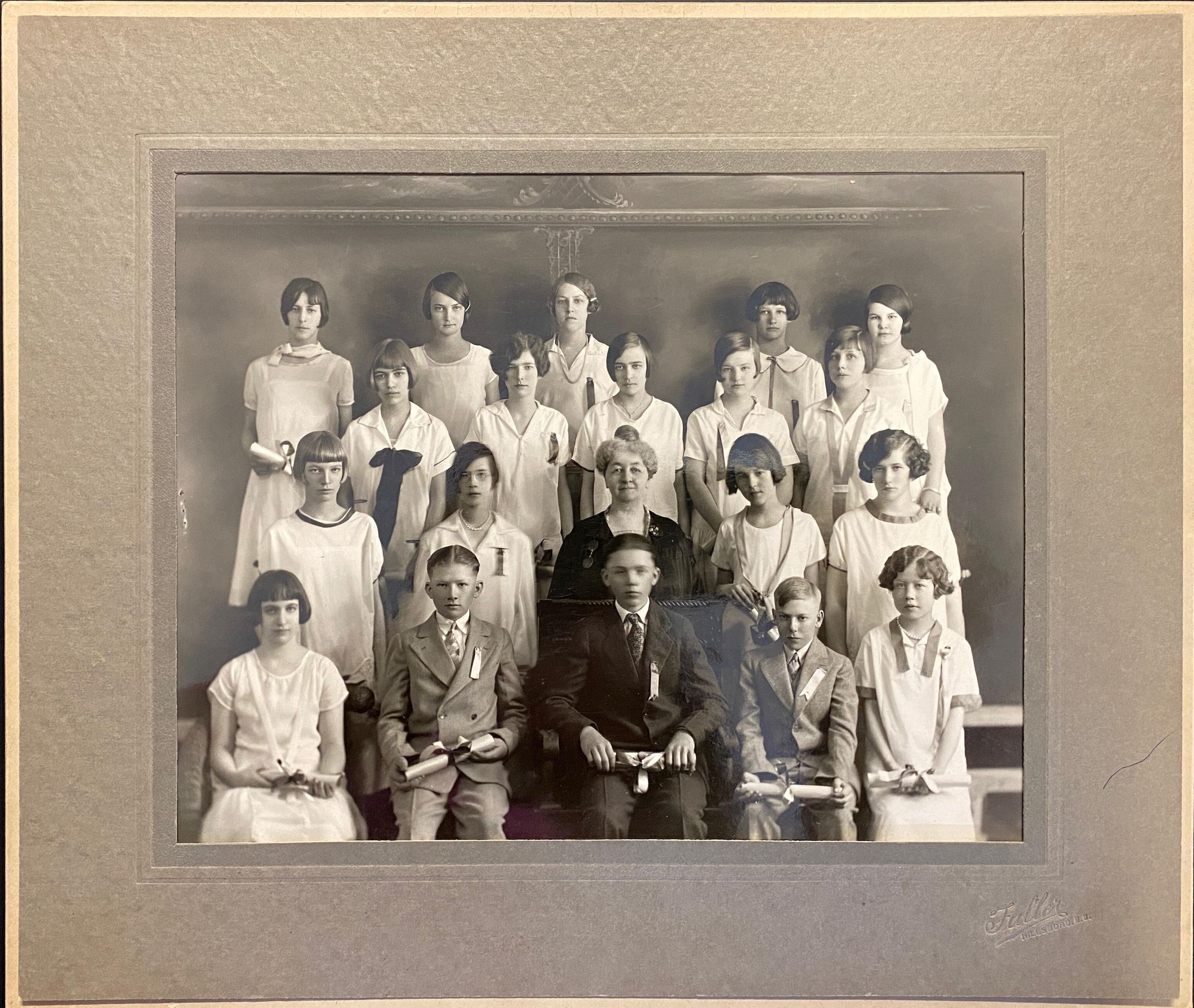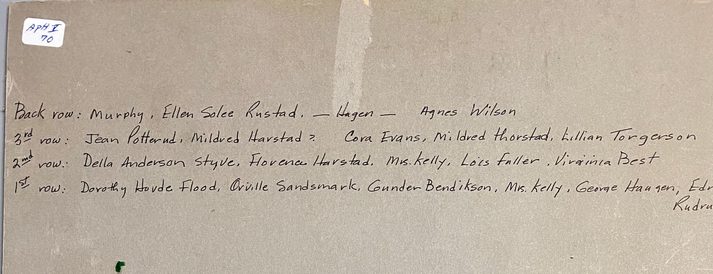 Mildred Thorstad, Murphy, Ellen Sarles Rustad, Jean Potterud, Agnes Wilson, Gunder Bendekson, George Haugen, Dorothy Hovde Flood, Hagen, Della Anderson Styve, Cora Evans, Orville Sandsmark, Mildred Harstad, E. Rudrud, Lillian Torgerson, Florence Harstad, Lois Fuller, Virginia Best, Lizzie Kelly