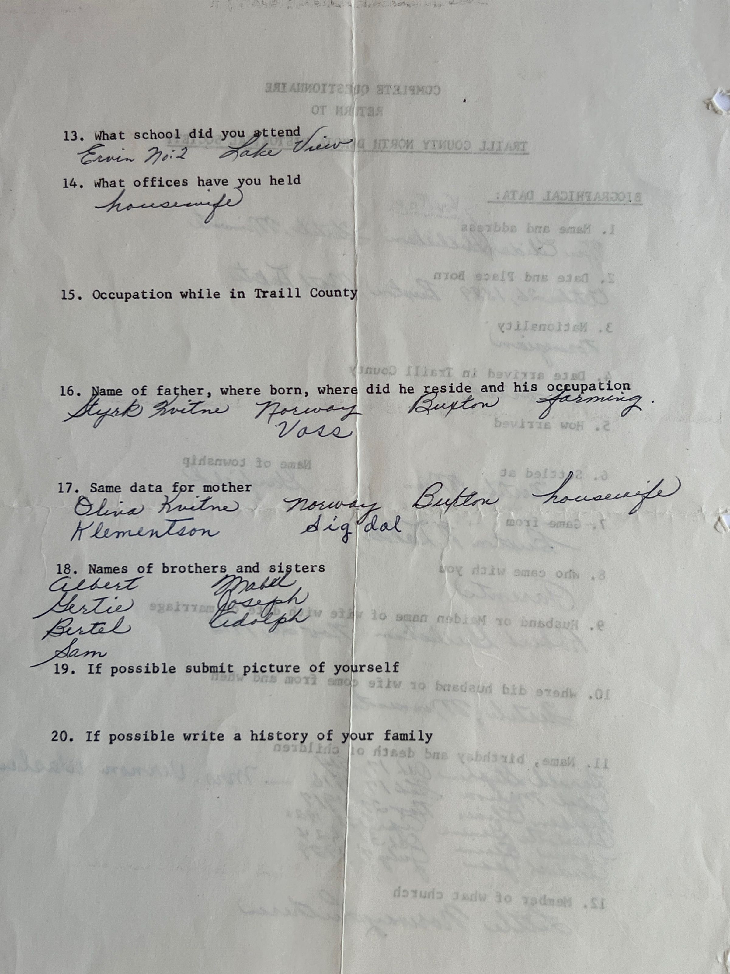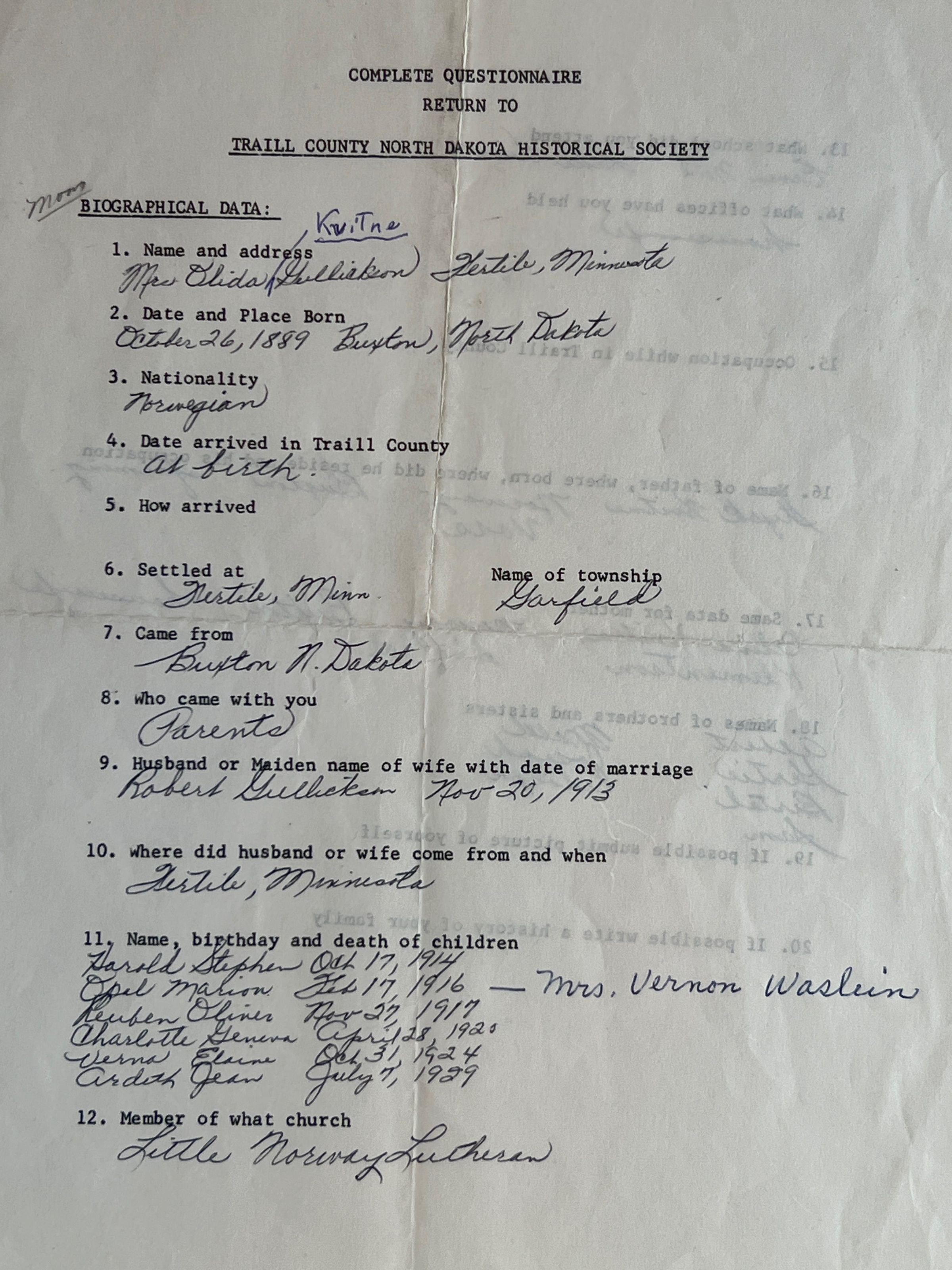 This family history file contains a two-page questionnaire completed by Olida Kvitne, wife of Robert Gullickson. Olida was the daughter of Buxton Township pioneers, Styrk Kvitne and his wife Olivia (Klementson) Knvitne.