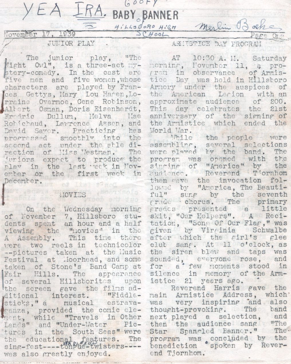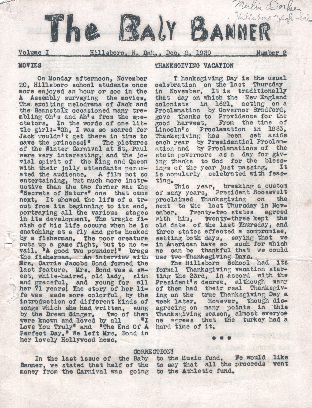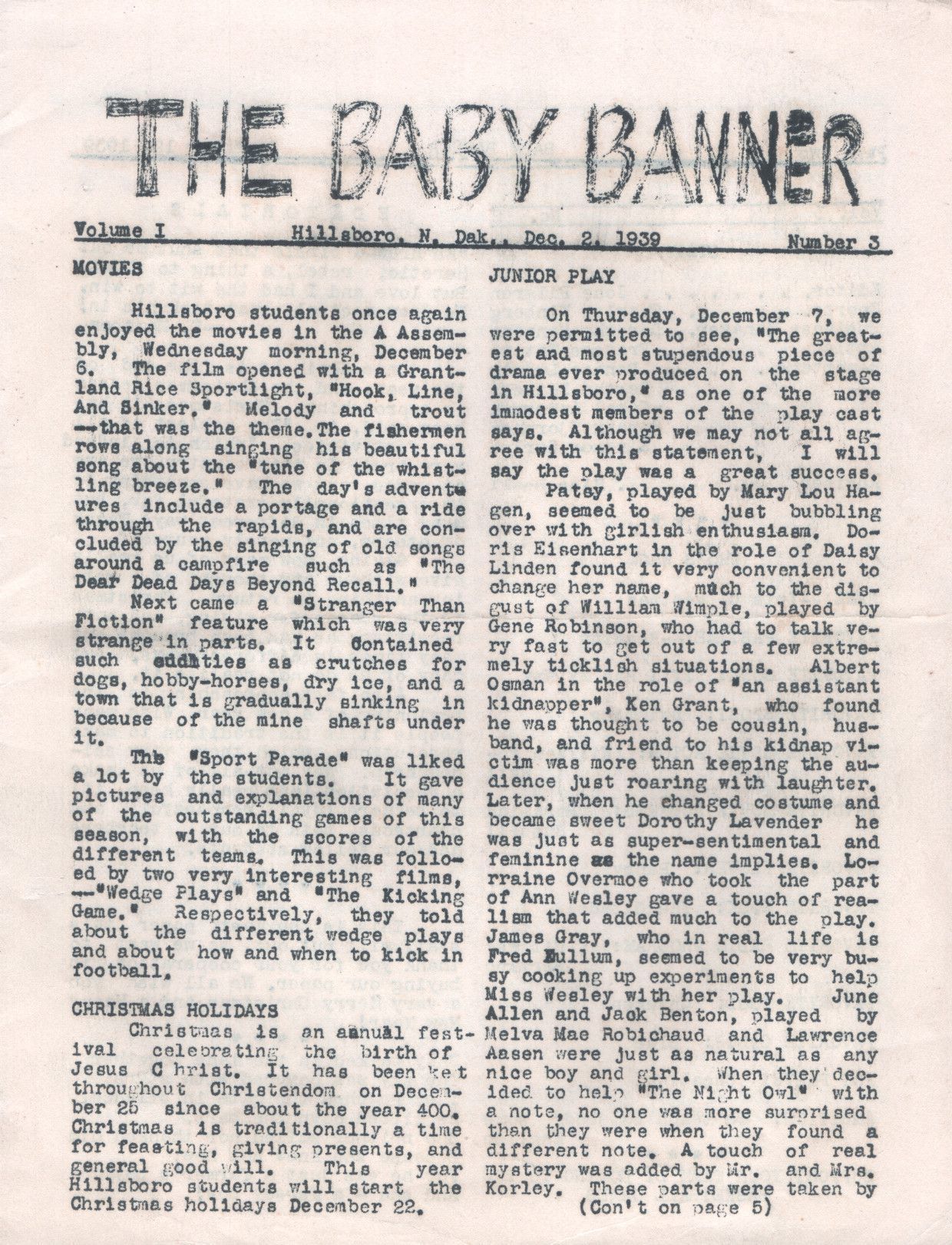 In 1939, from November to December, the Hillsboro High School students published a newspaper titled "The Baby Banner". The newspaper staff included Ione Pilgren, Editor; Charles Winberg, Sports; Dorothy Henning, Business Managers; Frances Waters, Artist; and Reporters Carol Anderson, Bertha Letnes, Deneze Ludwig, Eleanor Sarles and Susann Tjornhom.