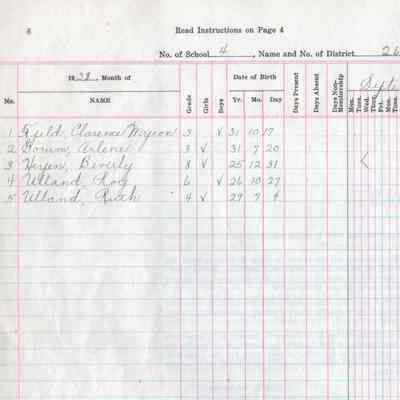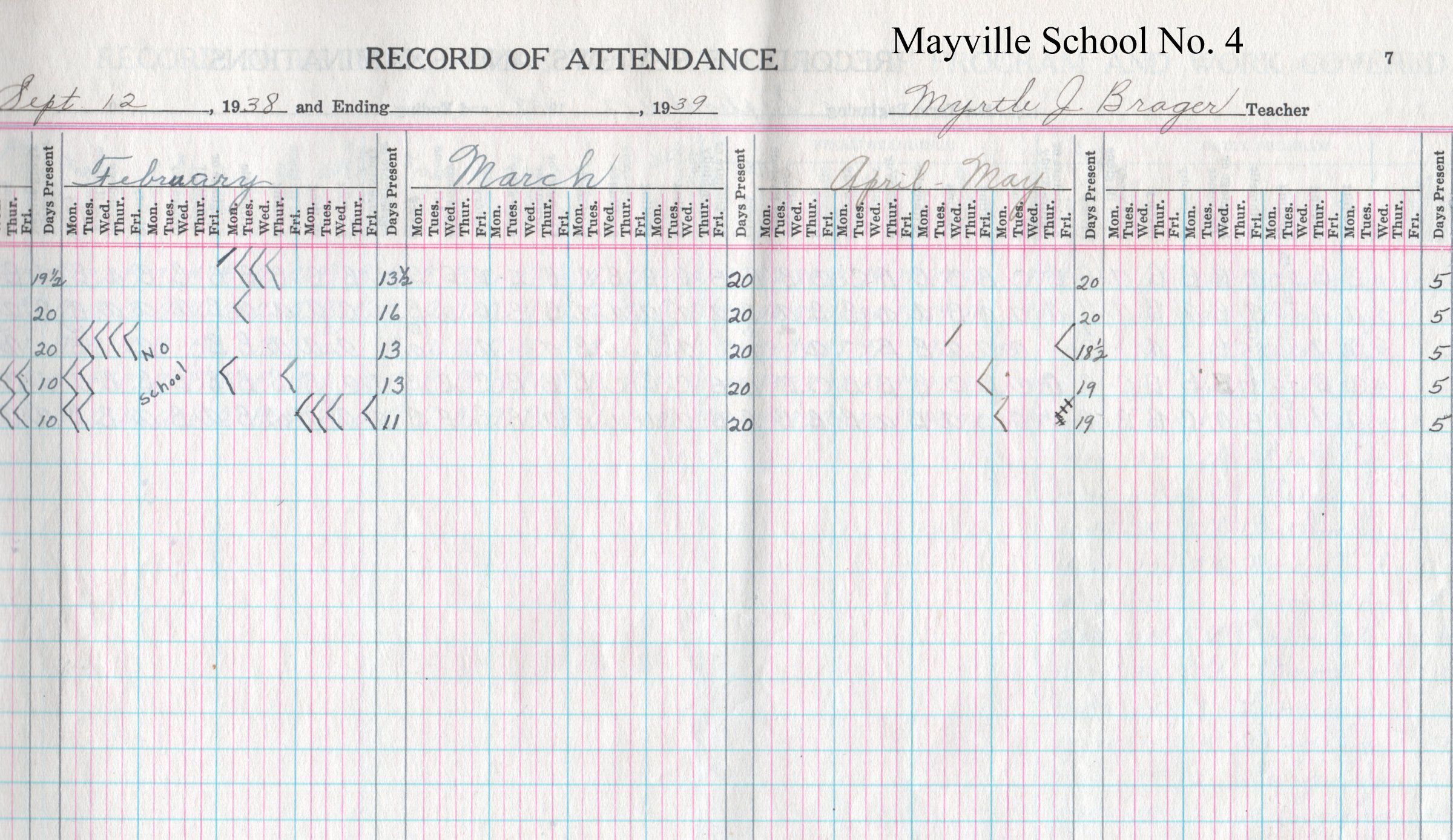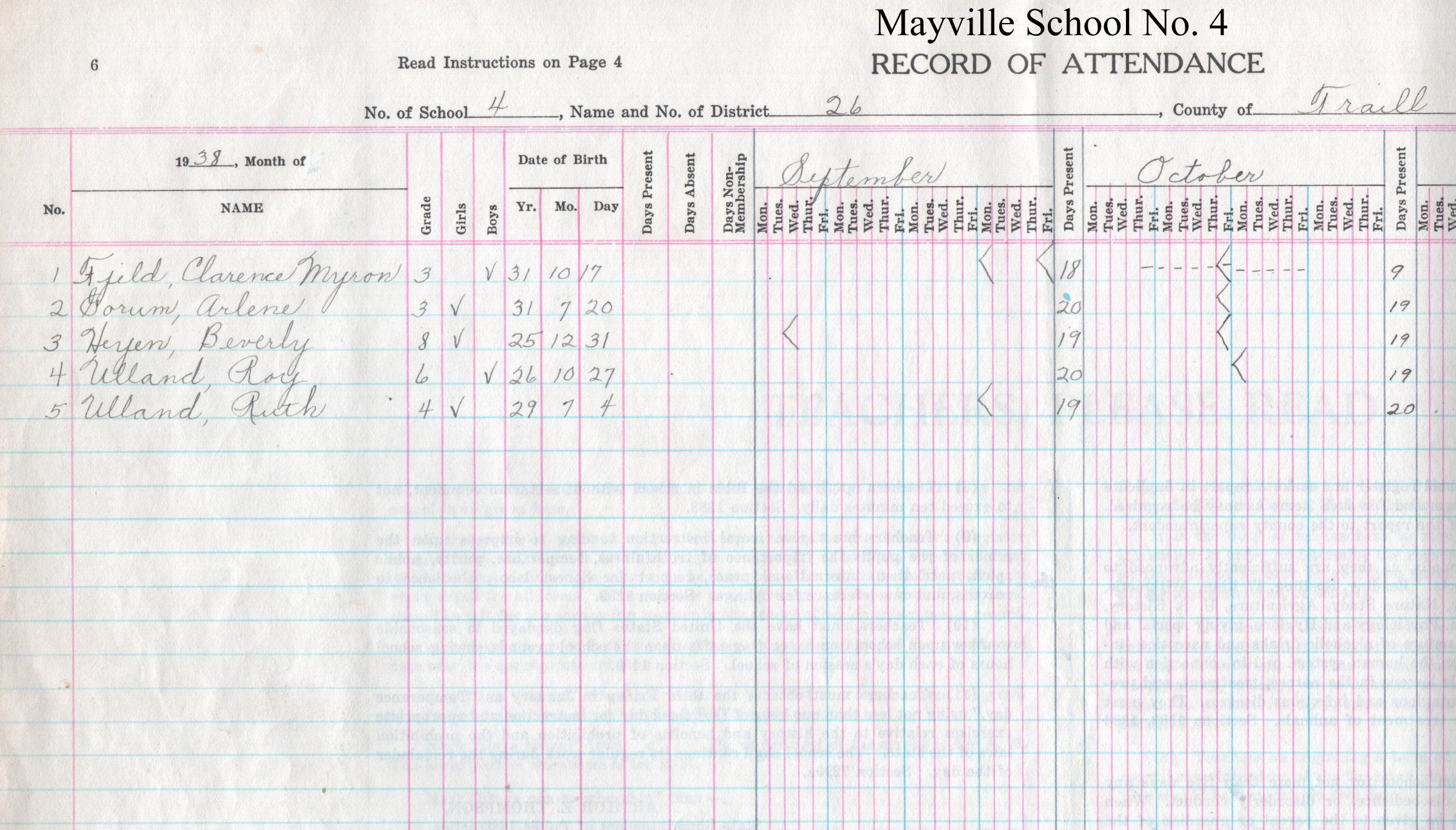 During the 1938-1939 school year, Mayville School No. 4 teacher, Myrtle Brager, kept attendance records for 5 students including Clarence Fjeld, Arlene Gorum, Beverly Heyen, Roy Ulland, and Ruth Ulland.Acquisition