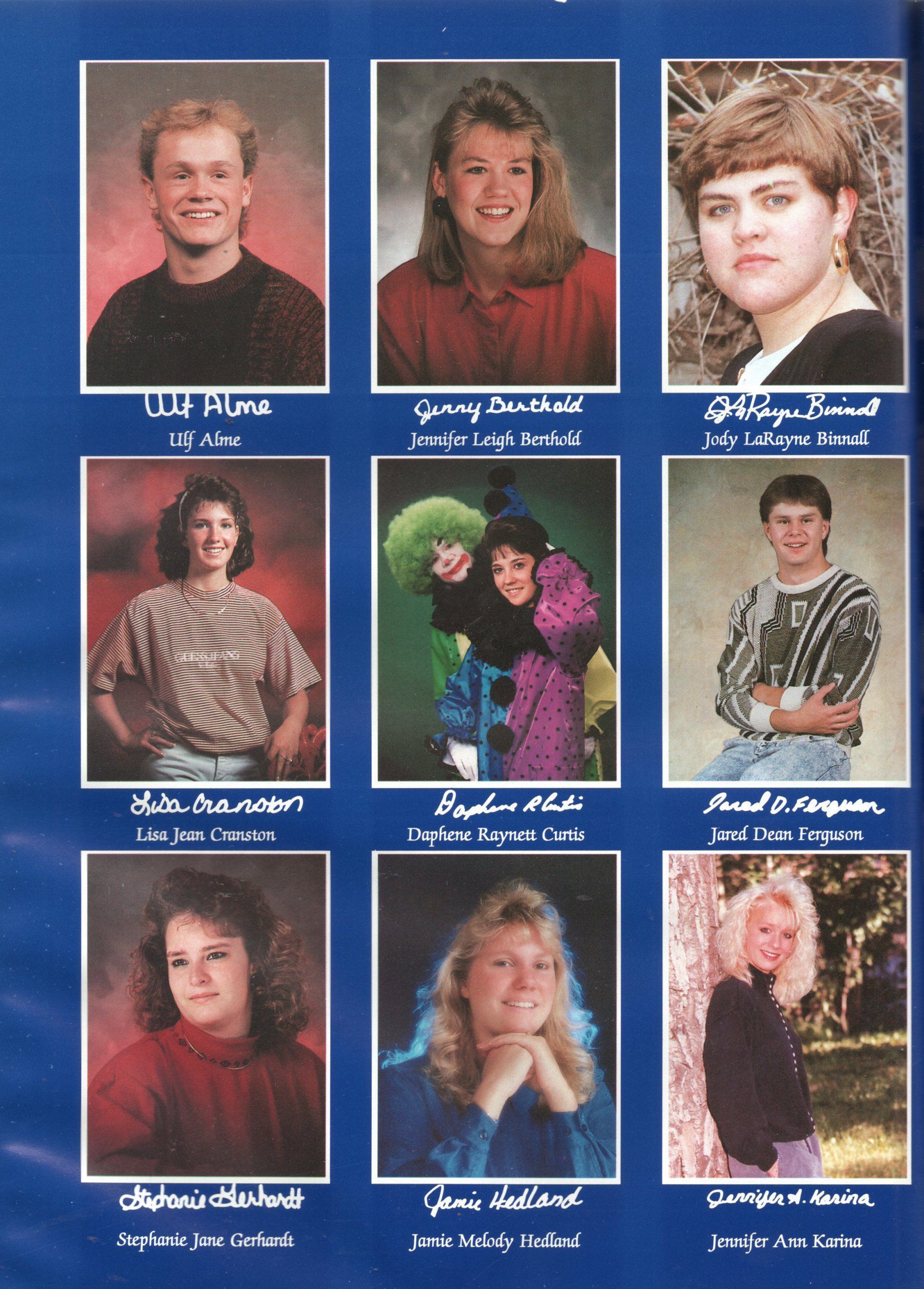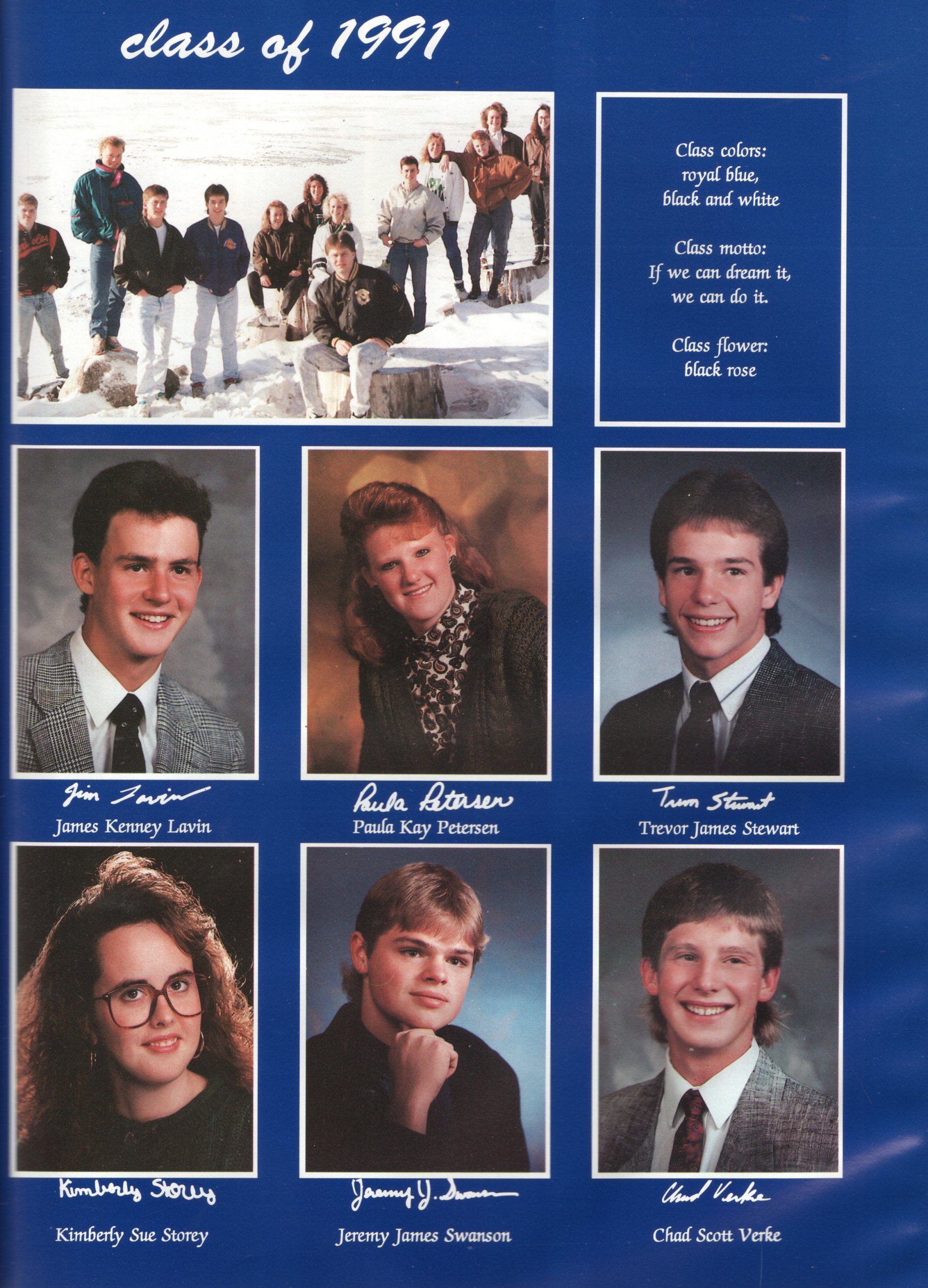 The 1991 yearbook includes two pages of Senior student photographs for: Ulf Alme, Jennifer Berthold, Jody LaRayne Binnall, Lisa Cranston, Jared Ferguson, Stephanie Gerhardt, Jamie Hedland, Jennifer Karina, James Lavin, Trevor Stewart, Kimberley Storey, Jeremy Swanson, and Chad Verke. Not pictured: Daphne Raynett Curtis, Paula Winsand.