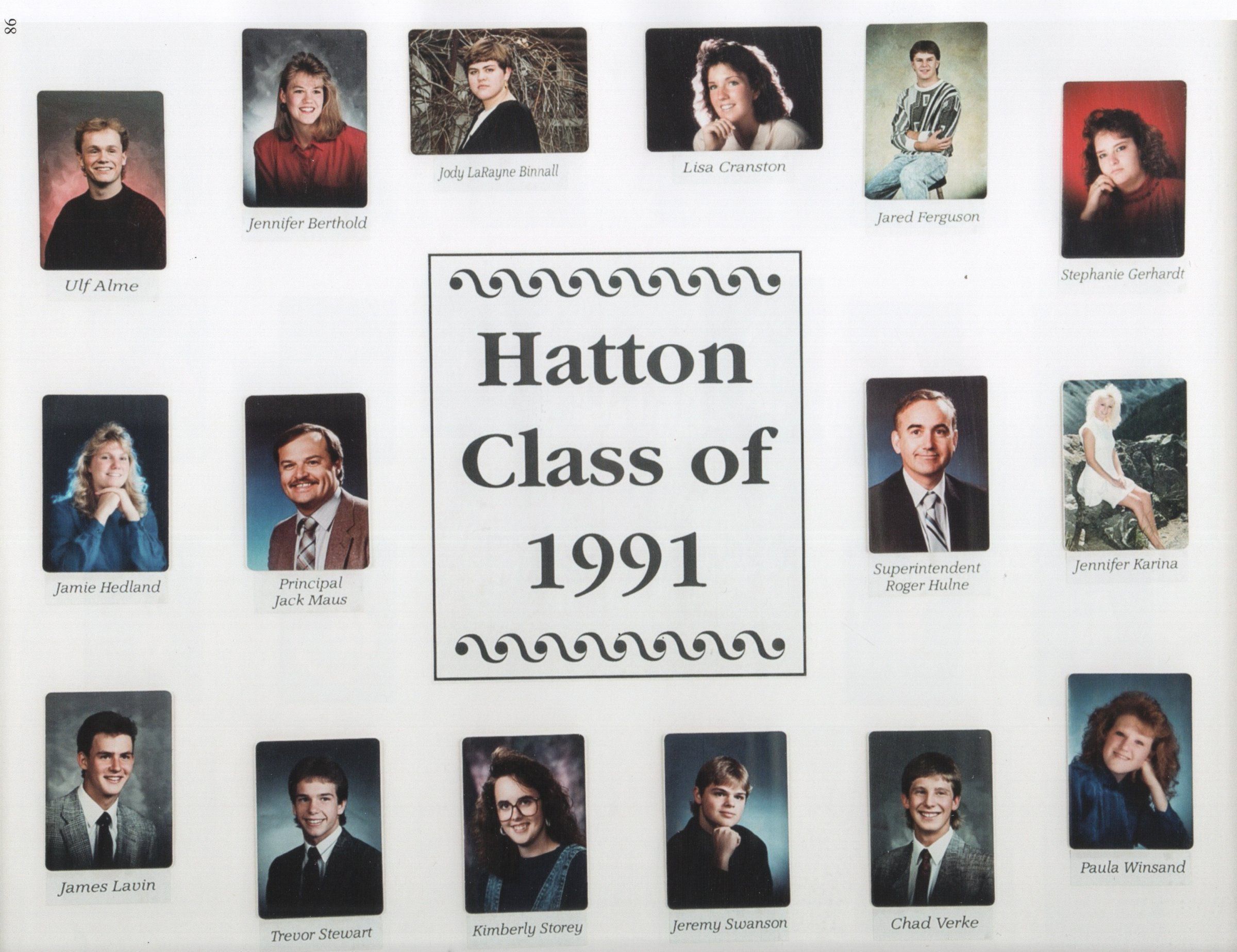 A photograph of the Hatton High School Class of 1991 is included on page 98 in the All School Reunion book, "Hatton Flyers", which is on display at the Hatton-Eielson Museum.