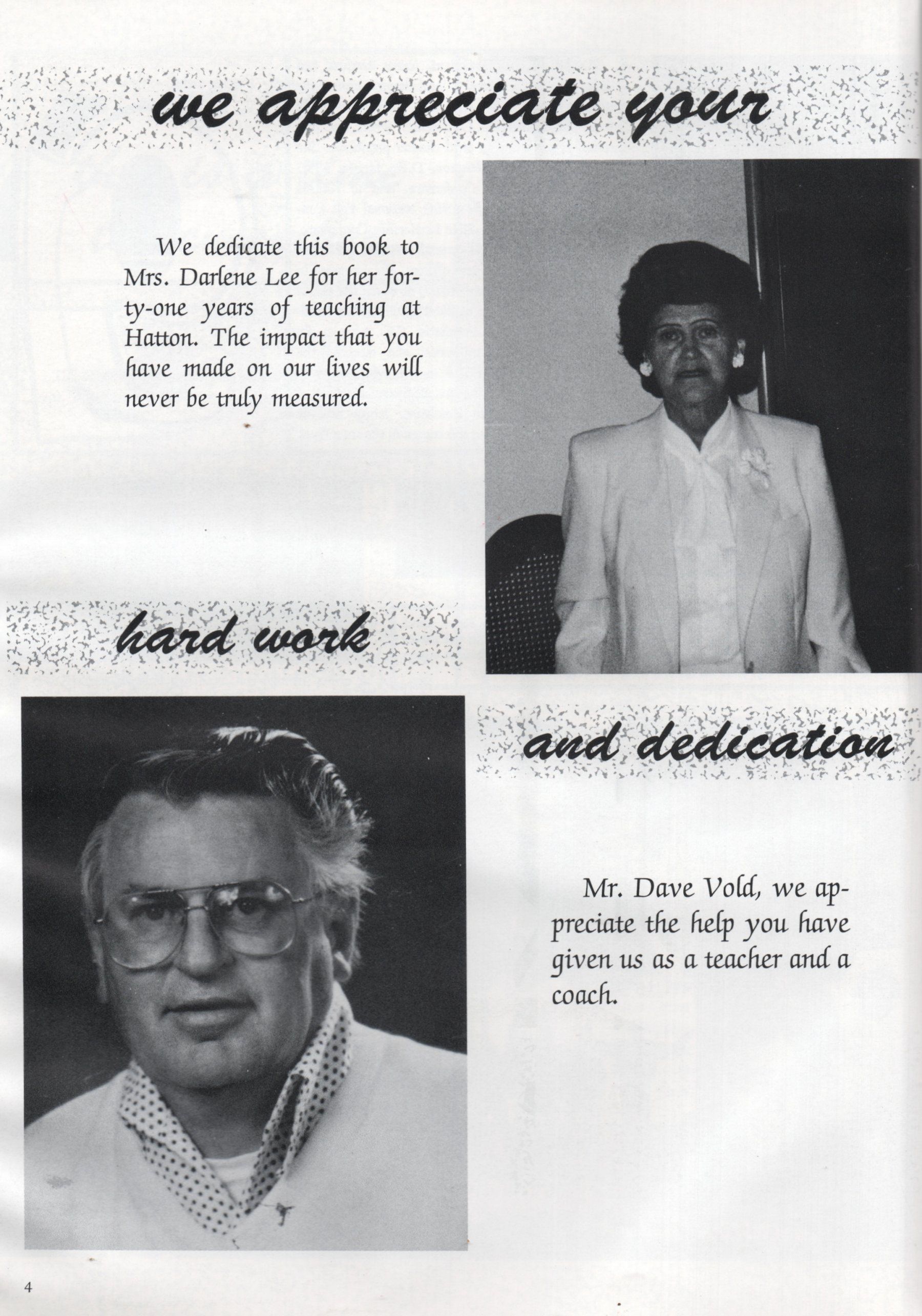 The Class of 1991 Hatton High School Yearbook, titled "Hattonian '91", was dedicated to Mrs. Darlene Lee and Mr. Dave Vold.