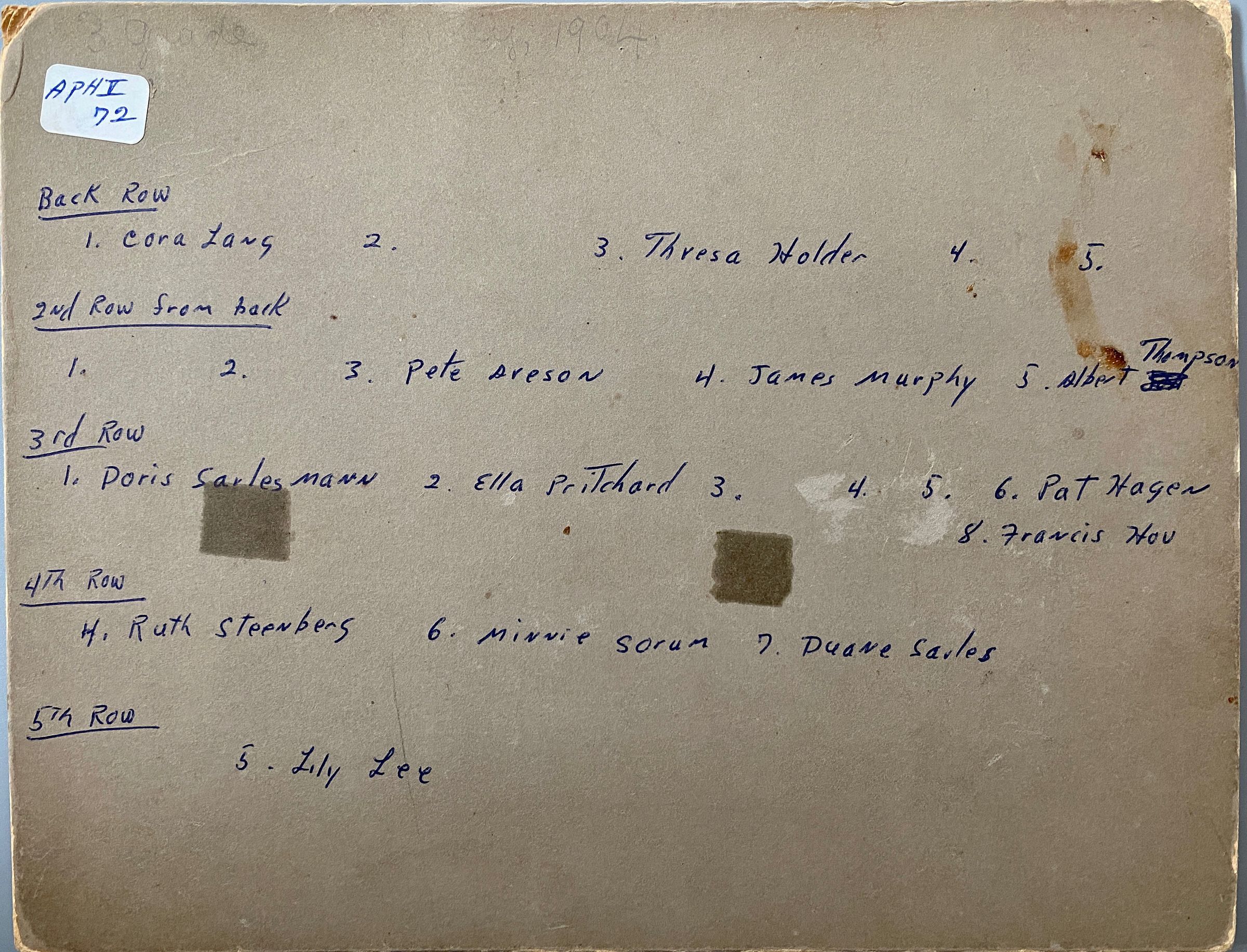 Cora Lang, Thresa Holder, Pete Dreson, James Murphy, Albert Thompson, Doris Sarles, Ella Pritchard, Pat Hagen, Francis Hov, Ruth Stenberg, Minnie Sorum, Duane Sarles, Lily Lee