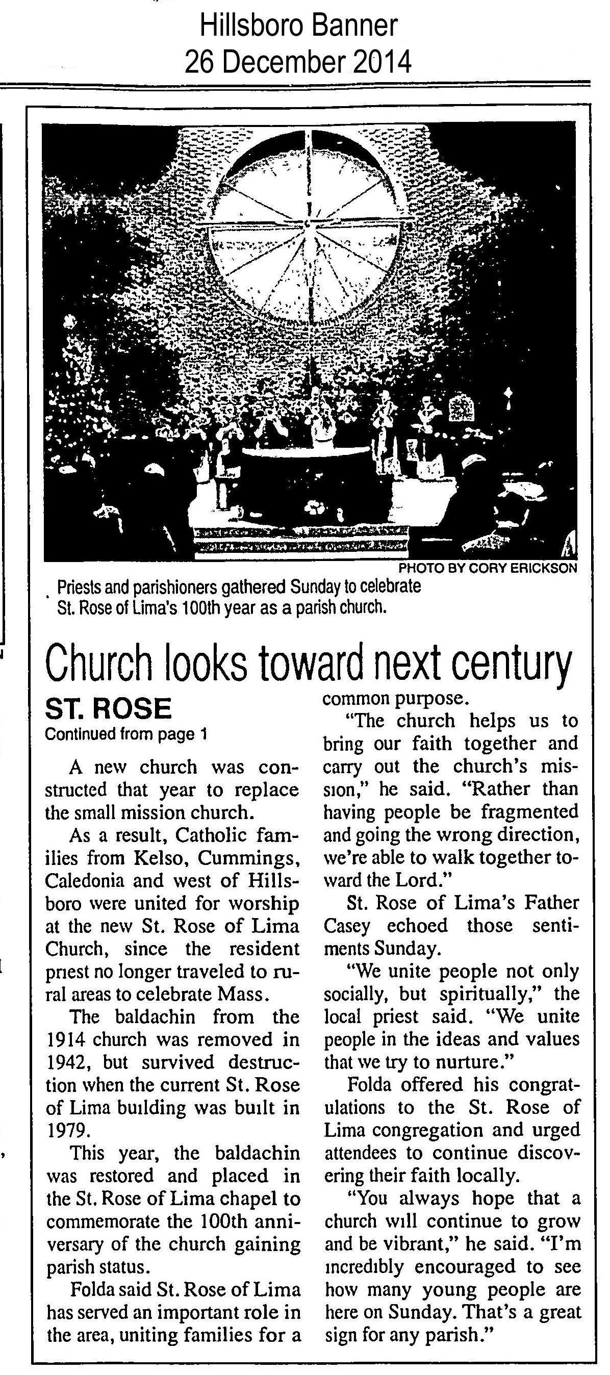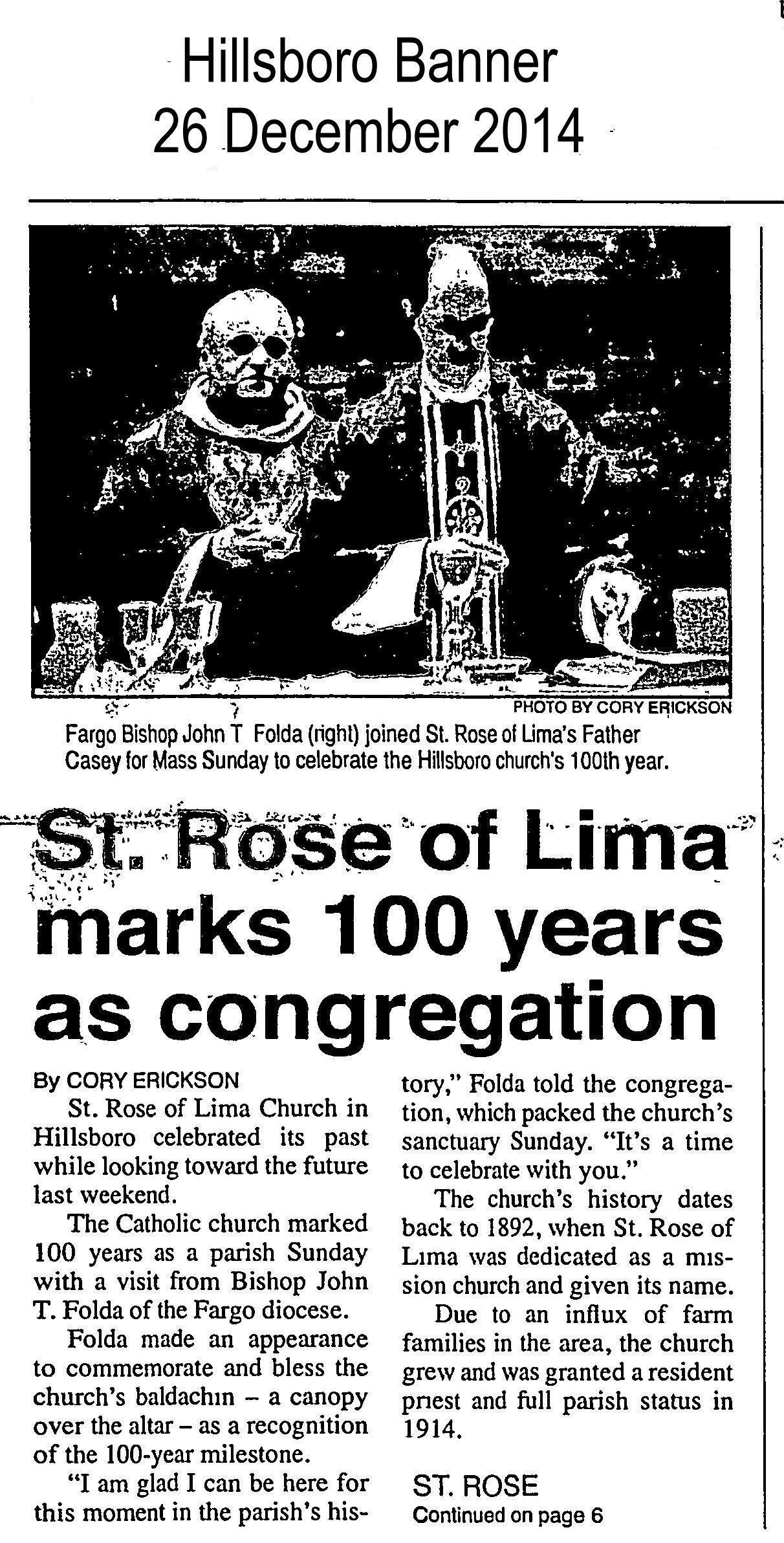 Photo of dignitaries celebrating 10Oth Anniversary of St. Rose of Lima Catholic Church in Hillsboro, ND, as Full Parish, which was reported in the 26 December 2014 issue of the Hillsboro Banner.Cataloged By