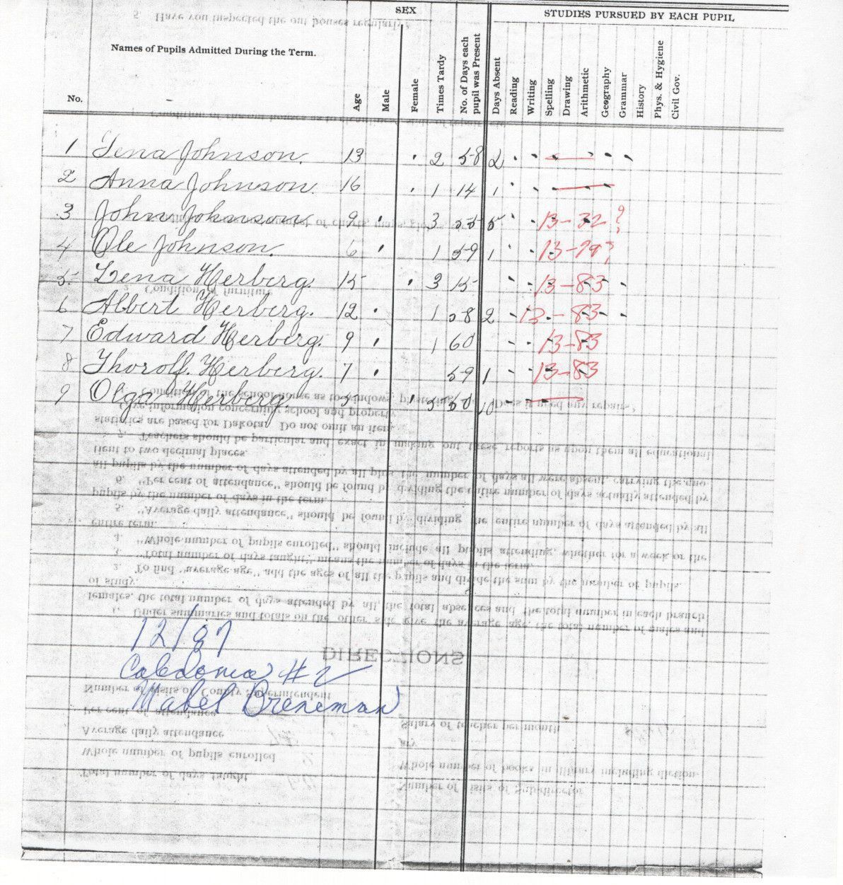 In December 1887, Caledonia School No. 2 teacher Mabel Breneman reported attendances and studies pursued for 9 students, including Albert Herberg, Edward Herberg, Lena Herberg, Olga Herberg, Thorolf Herberg, Anna Johnson, John Johnson, Ole Johnson, and Tina Johnson.