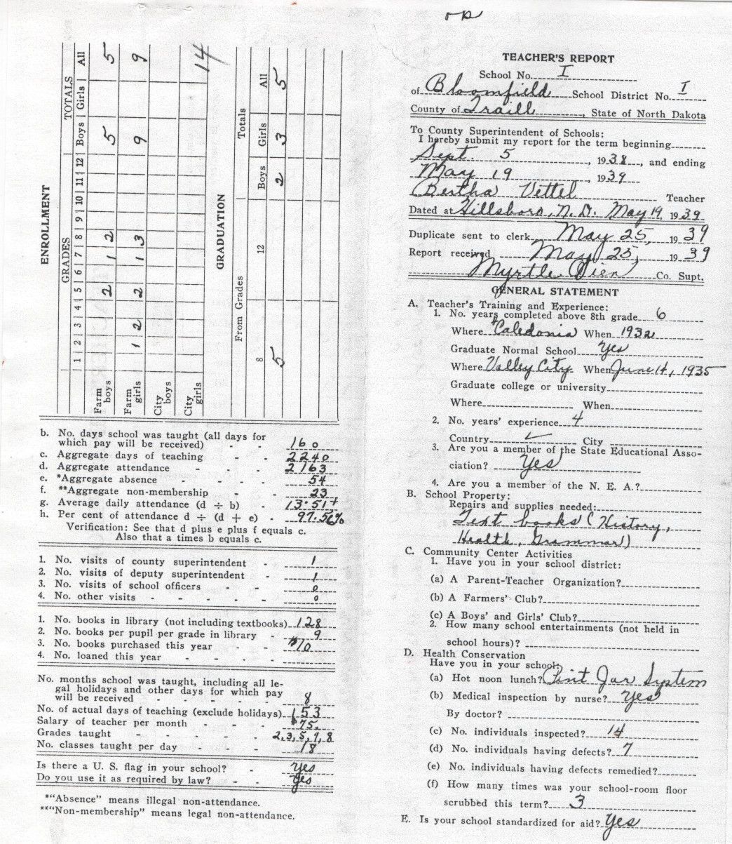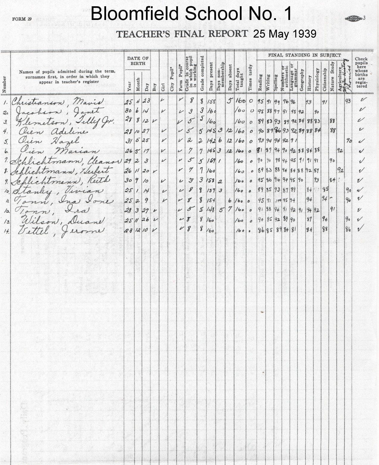 On 25 May 1939, Bloomfield School No. 1 teacher Bertha Vettel reported attendances and standings in studies pursued for 14 students, including Mavis Christianson, Janet Jacobson, Tellef Klemetson, Adeline Oien, Hazel Oien, Marian Oien, Eleanor Schlichtmann, Herbert Schlichtmann, Ruth Schlichtmann, Vivian Stanley, Ina Ione Tonn, Ira Tonn, Duane Wilson, and Jerome Vettel.
