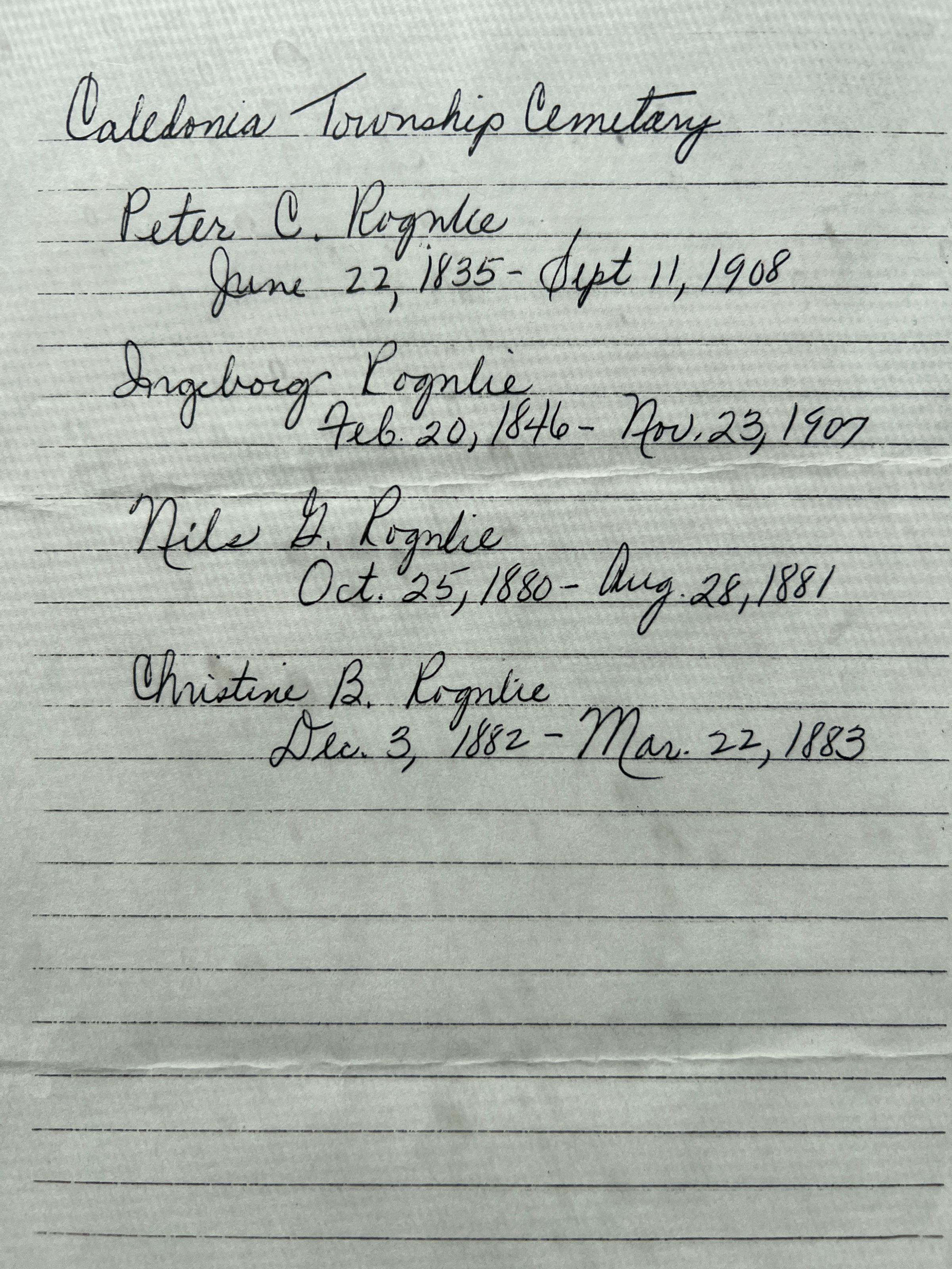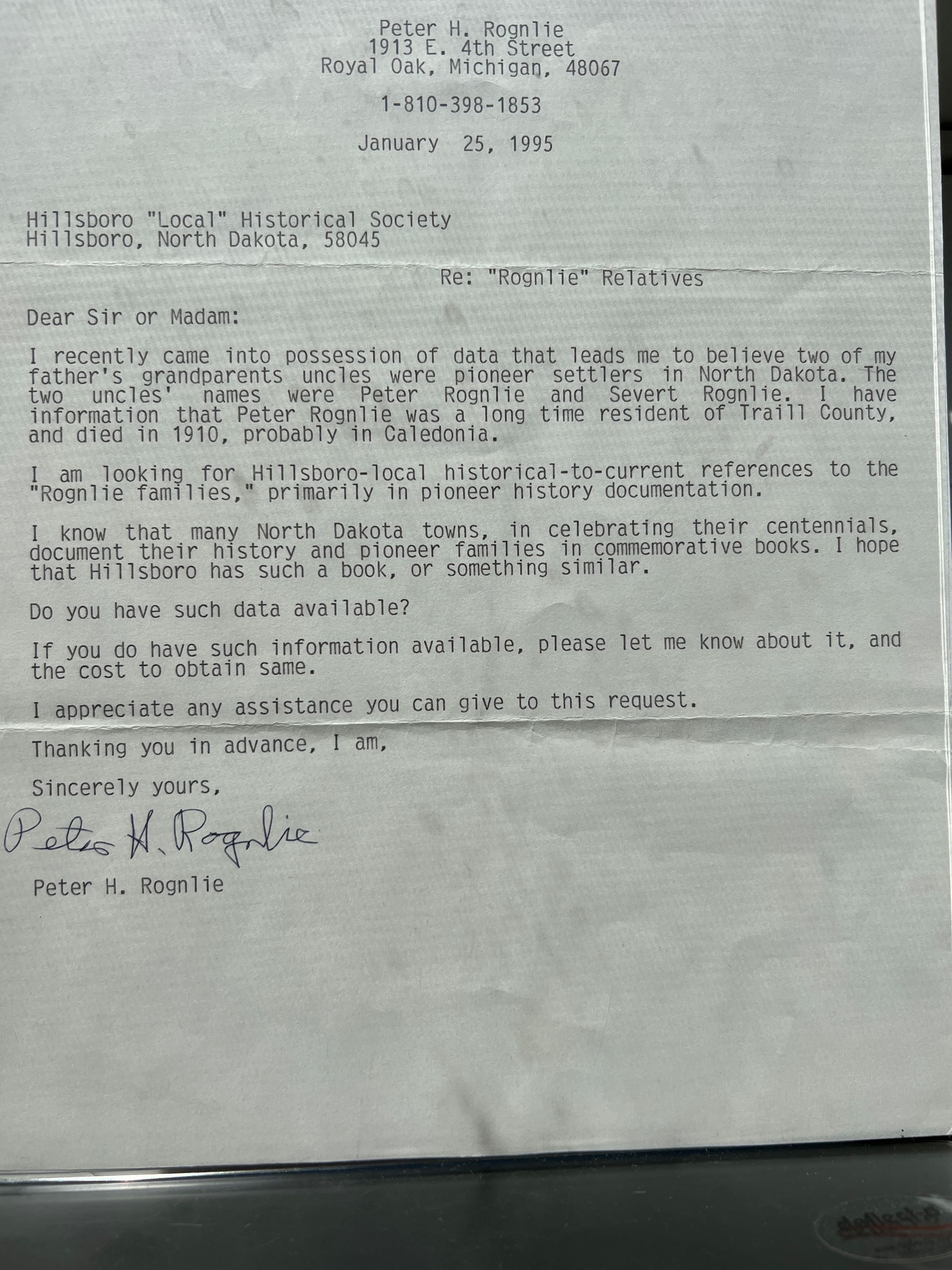 This folder contains 1995 letters between Peter H Rognlie and Mary Ann Boedeker about Peter C. Rognlie and wife Ingeborg (Vigen) who were early settlers by Caledonia in Traill County, Dakota Territory, and are buried in the Caledonia Township cemetery. This folder also has atlas information about Rognlie owned land in Herberg and Caledonia Townships, and a short history of Ole J. Rognlie.Cataloged By