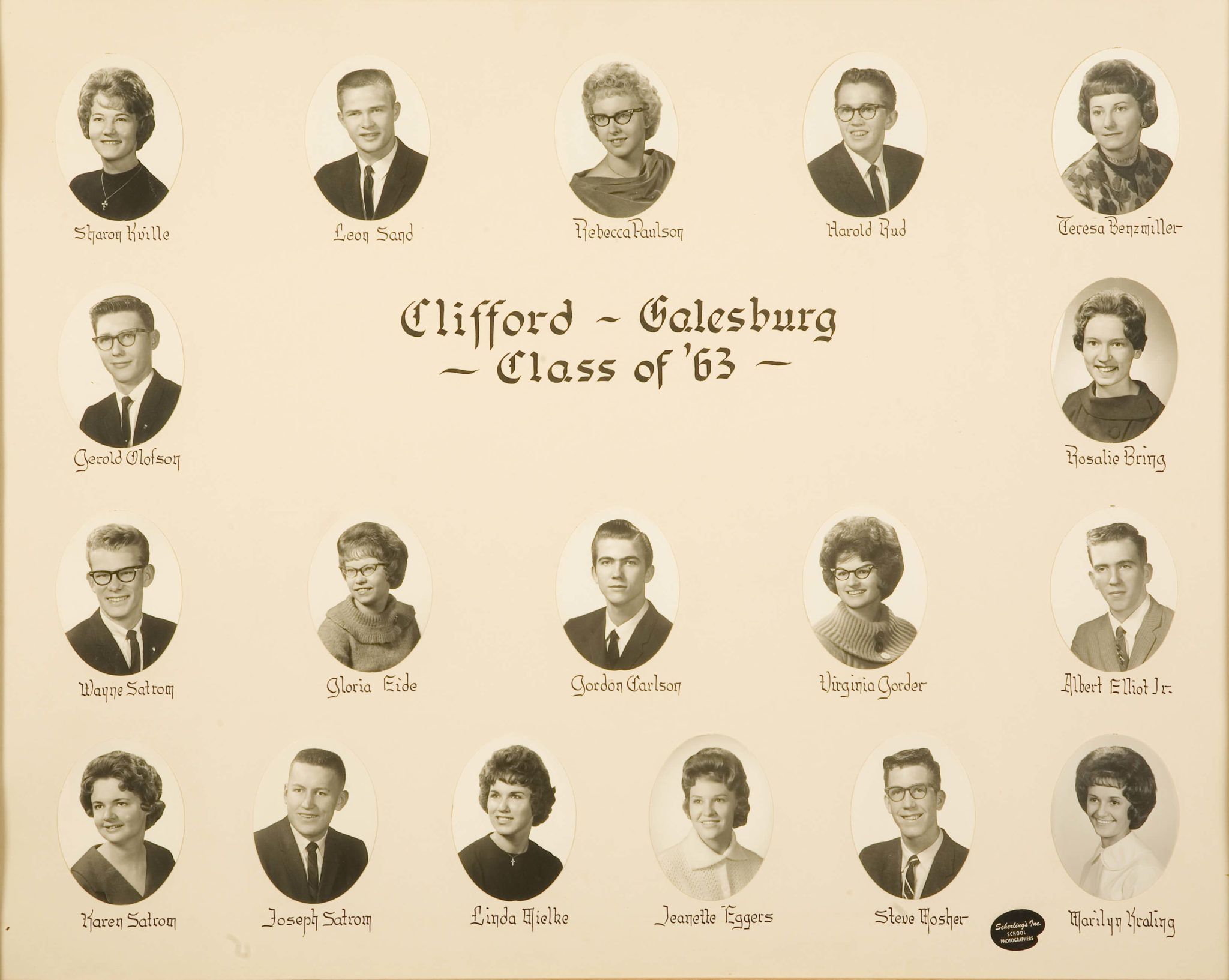 A photograph of the Clifford-Galesburg High School Class of 1963 included photos of 18 graduating seniors: Teresa Benzmiller, Rosalie Bring, Gordon Carlson, Jeanette Eggers, Gloria Eide, Albert Elliot Jr., Virginia Gorder, Marilyn Kraling, Sharon Kville, Linda Mielke, Steve Mosher, Gerald Olofson, Rebecca Paulson, Harold Rud, Leon Sand, Joseph Satrom, Karen Satrom, and Wayne Satrom.