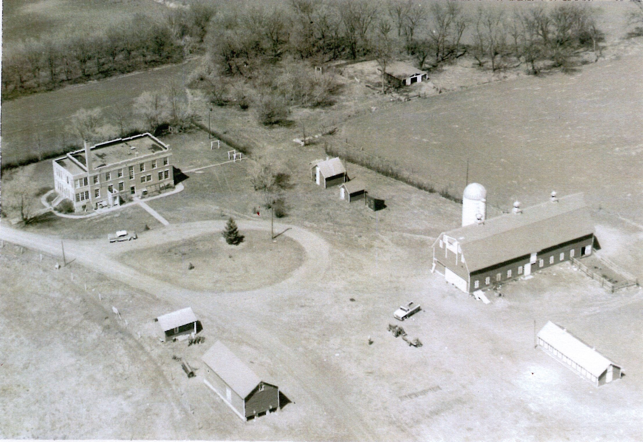 The aerial photograph shows the Traill County Poor Farm circa 1950s (note style of car and pickup in photo). The second residence building, which was constructed in 1930 (see Catalogit entry 2020.37.6), after the first residence building was destroyed by fire in 1929. The photograph also shows a barn and other buildings. The Traill County Poor Farm was located in Section 2 in Caledonia Township, about two miles north of the Village of Caledonia.