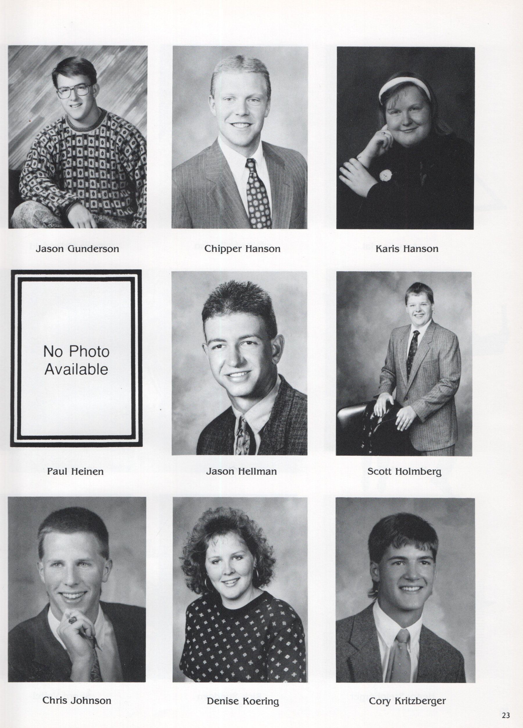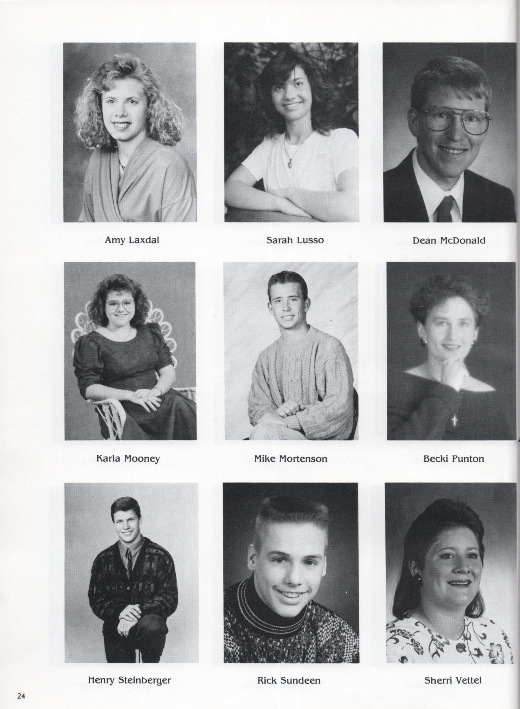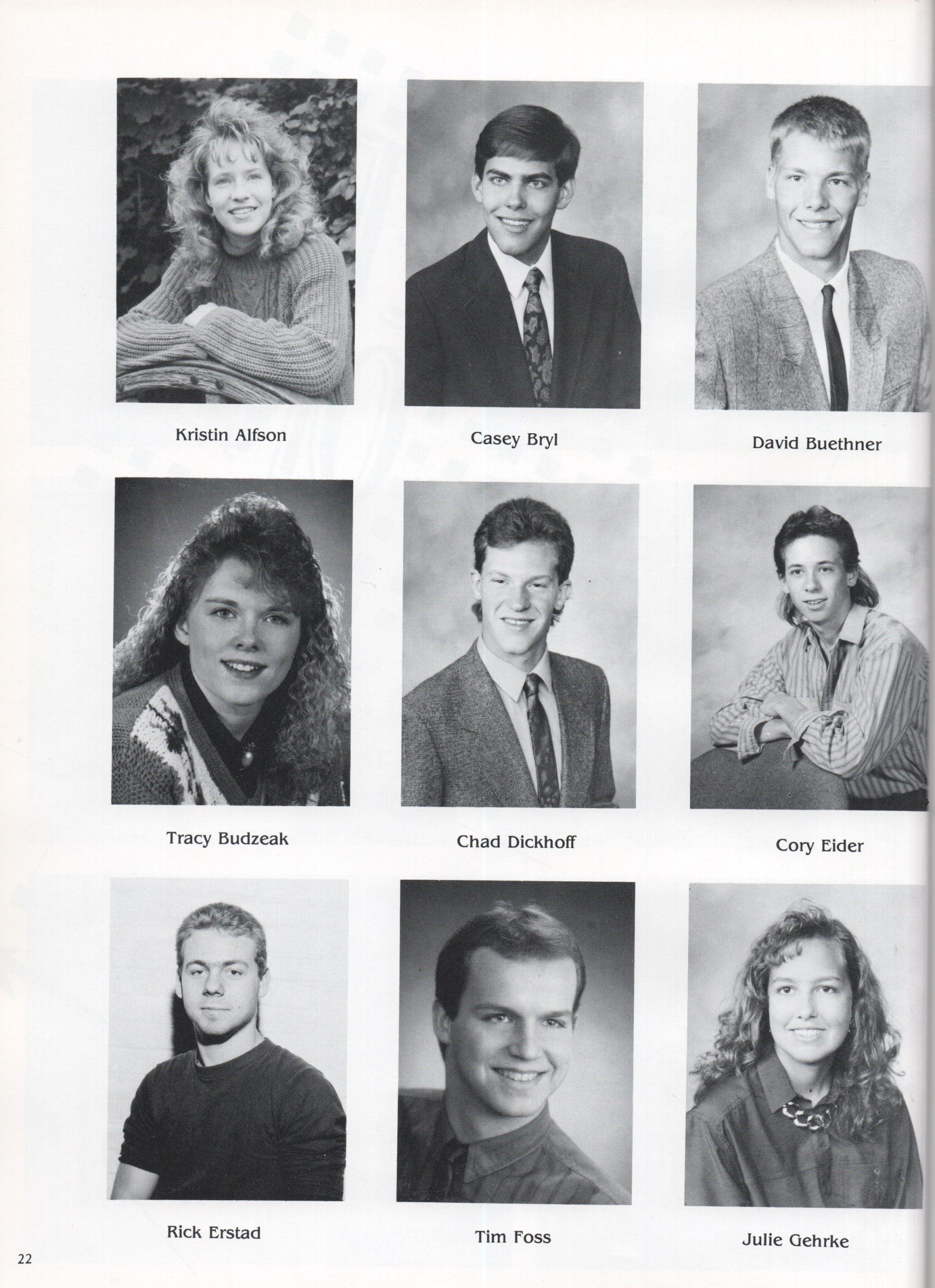 The 1991 Yearbook includes four pages of Class of 1991 Senior student photographs for: Kristin Alfson, Casey Bryl, David Buethner, Tracy Budzeak, Chad Dickhoff, Cory Eider, Rich Erstad, Tim Foss, Julie Gehrke, Jason Gunderson, Chipper Hanson, Karis Hanson, Jason Hellman, Scott Holmberg, Chris Johnson, Denise Koering, Cory Kritzberger, Amy Laxdal, Sarah Lusso, Dean McDonald, Karla Mooney, Mike Mortenson, Becki Punton, Henry Steinberger, Rick Sundeen, Sherri Vettel, Annette Warner, and Cindy Weka. Not pictured: Paul Heinen.