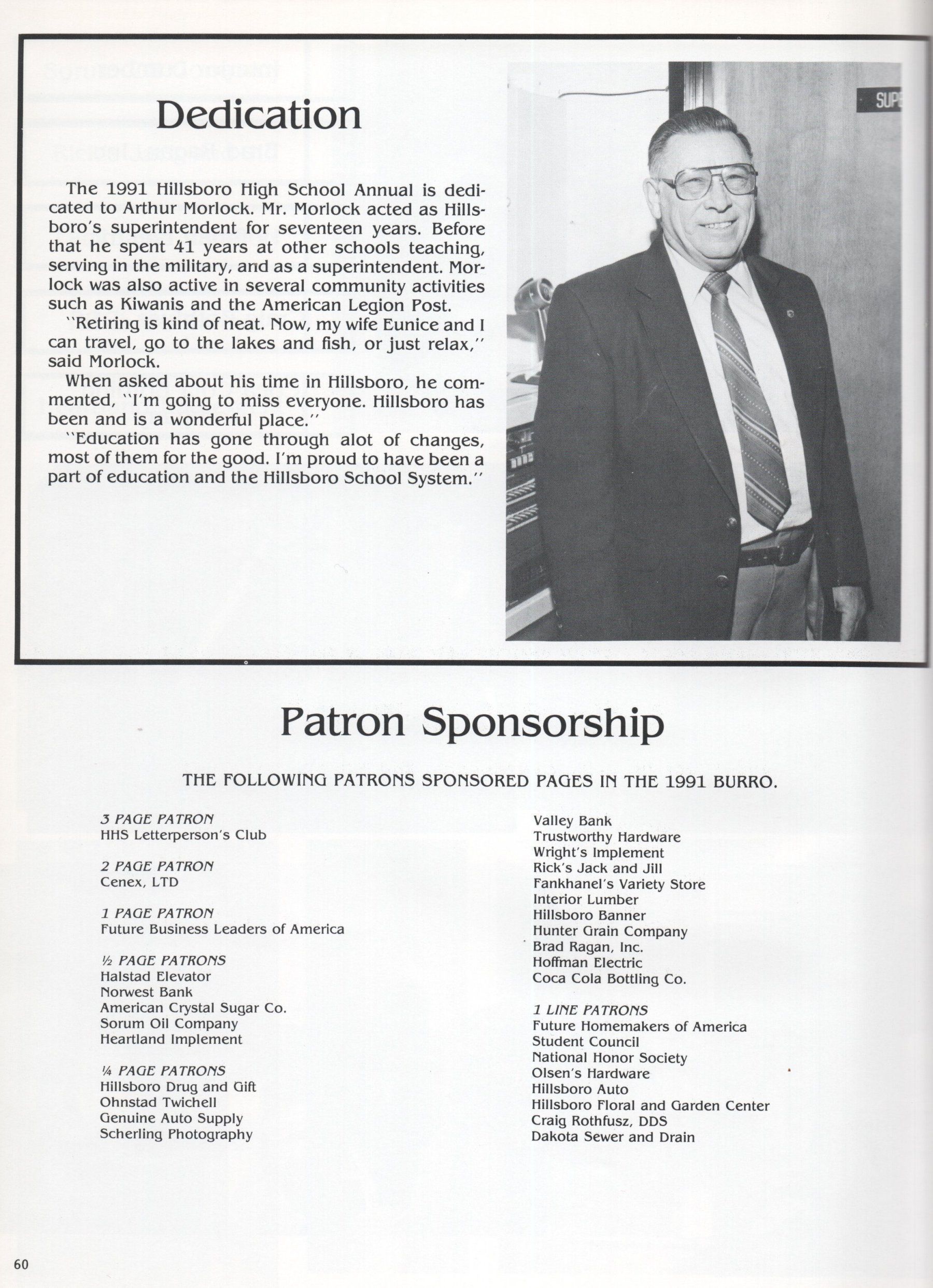 The Class of 1991 Hillsboro High School Yearbook, titled: Nineth One Burro, was dedicated to Mr. Arthur Morlock, superintendent.