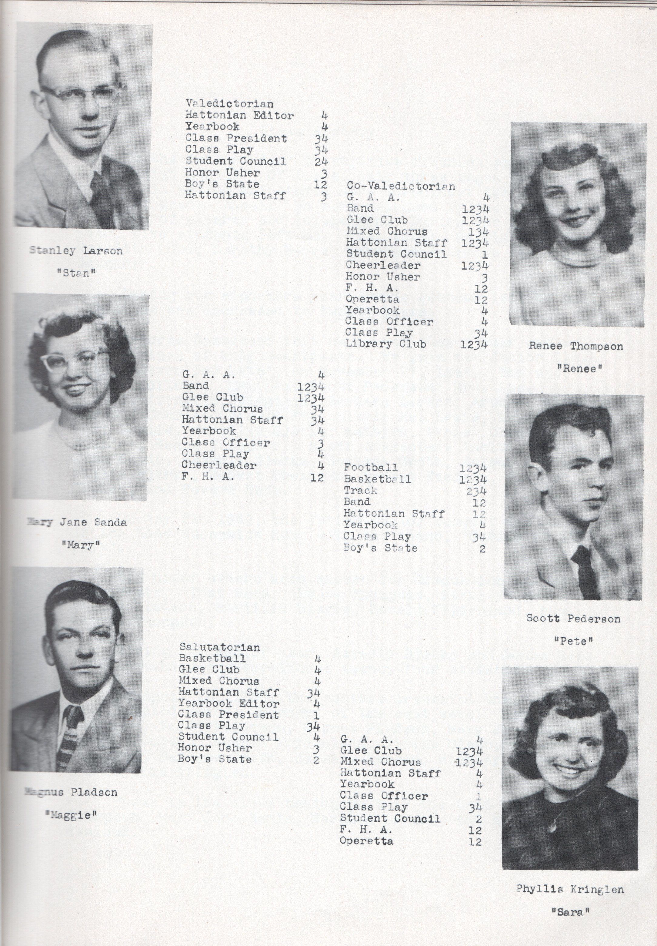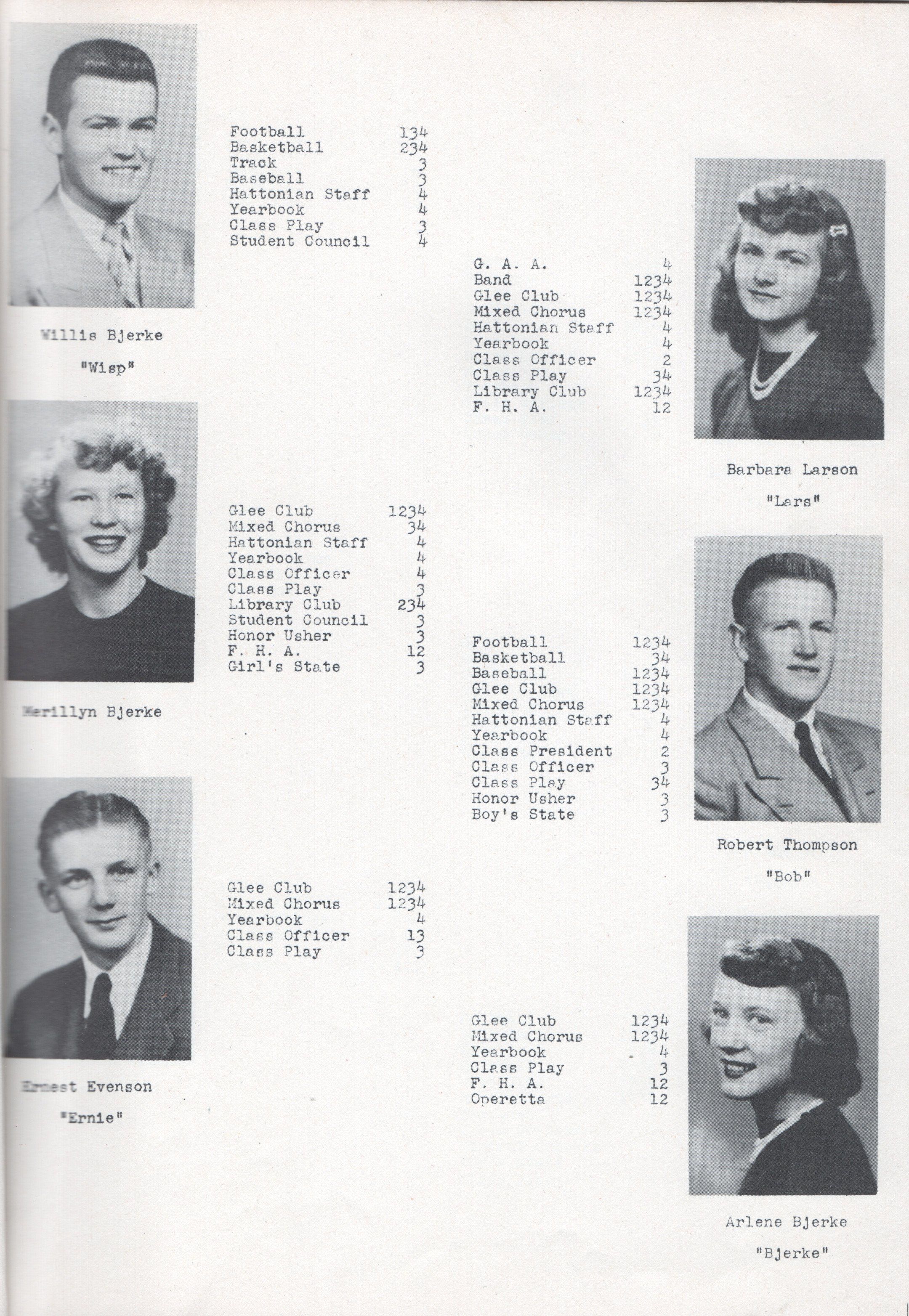 The 1950 yearbook includes four pages of Senior student photographs for: Arlene Bjerke, Merillyn Bjerke, Willis Bjerke, Bonnie Brooks, Curtis Dokken, Donna Enger, Ernest Evenson, Ronald Frydenlund, Darlene Groth, Doris Jacobson, Phyllis Kringlen, Barbara Larson, Stanley Larson, Norma Lenz, Howard Ness, Violet Olson, Scott Pederson, Magnus Pladson, Mary Jane Sanda, Beverly Stavens, Elsie Stavens, Jean Thompson, Robert Thompson, and Renee Thompson. Not pictured: Beverly Bjerke, Myron Gaughnour, and Donna Ness.