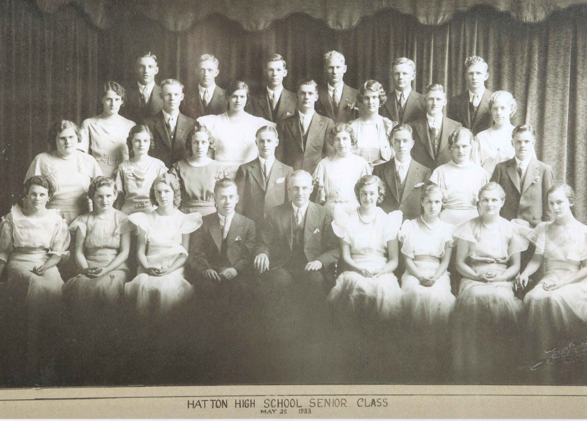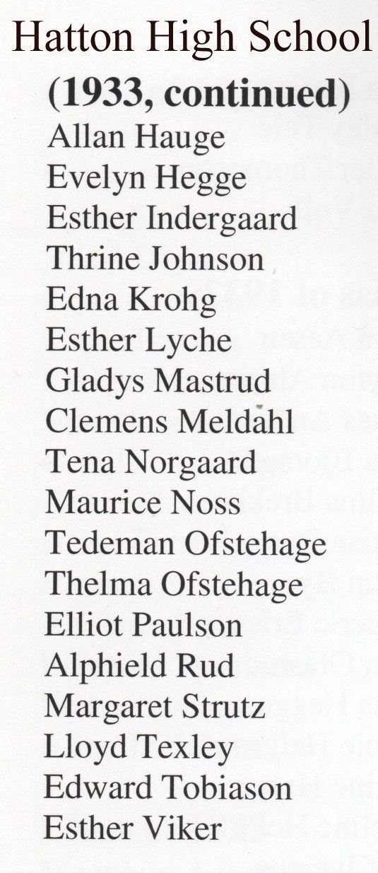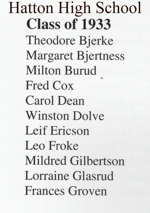 Hatton High School Class of 1933 seniors included: Theodore Bjerke, Margaret Bjertness, Milton Burud, Fred Cox, Carol Dean, Winston Dolve, Leif Ericson, Leo Froke, Mildred Gilbertson, Lorraine Glasrud, Grances Groven, Allan Hauge, Evelyn Hegge, Esther Indergaard, Thrine Johnson, Edna Krohg, Ester Lyche, Gladys Mastrud, Clemens Meldahl, Tena Norgaard, Maurice Noss, Tedeman Ofstehage, Thelma Ofstehage, Elliot Paulson, Alphield Rud, Margaret Strutz, Lloyd Texley, Edward Tobiason, and Esther Viker.