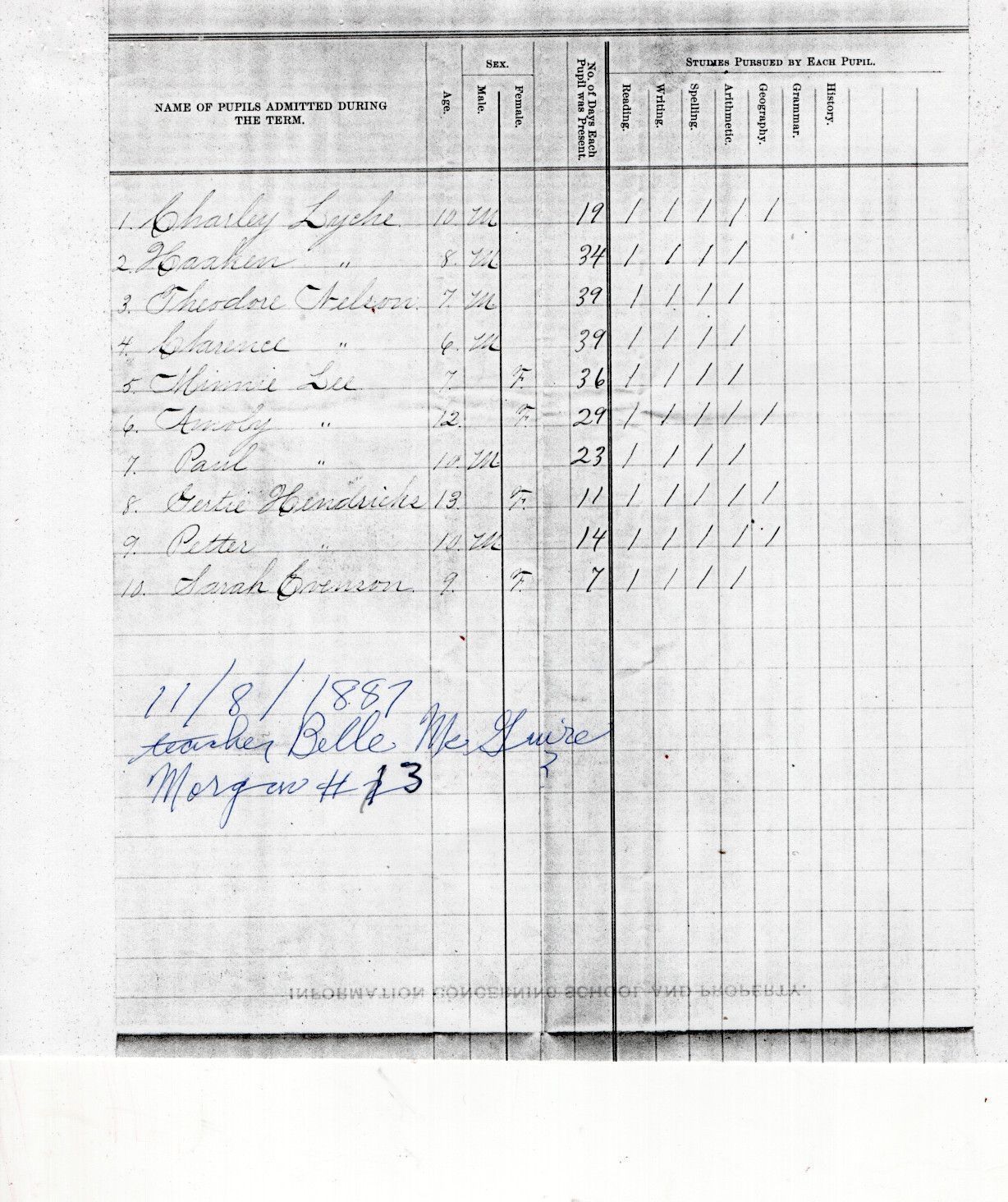 On 8 November 1887, Morgan School No. 3 teacher, Belle McGuire, reported the attendance of 10 students: Sarah Evenson, Gertie Hendricks, Peter Hendricks, Amoly Lee, Minnie Lee, Paul Lee, Charley Lyche, Haaken Lyche, Clarence Nelson, and Theodore Nelson.