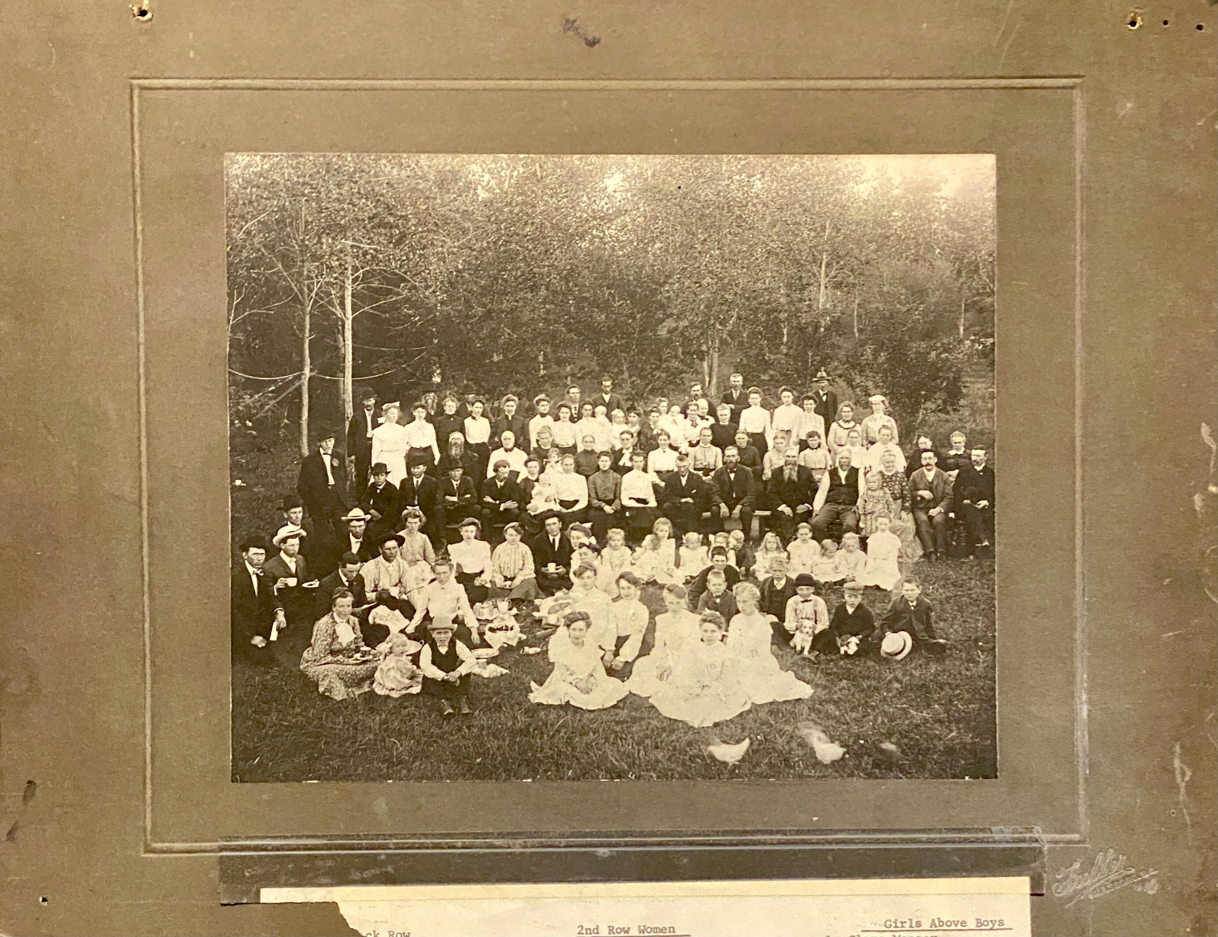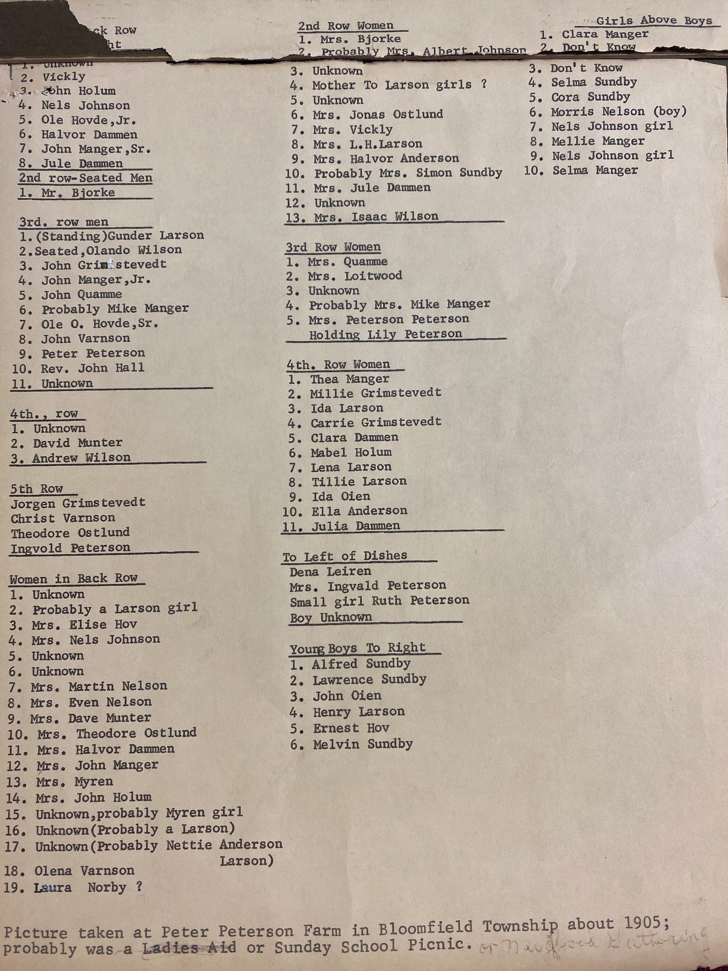 Group photo on the Peter Peterson Farm in Bloomfield Township around 1905. List of names on second photo. Possibly Ladies Aid or Sunday School Picnic