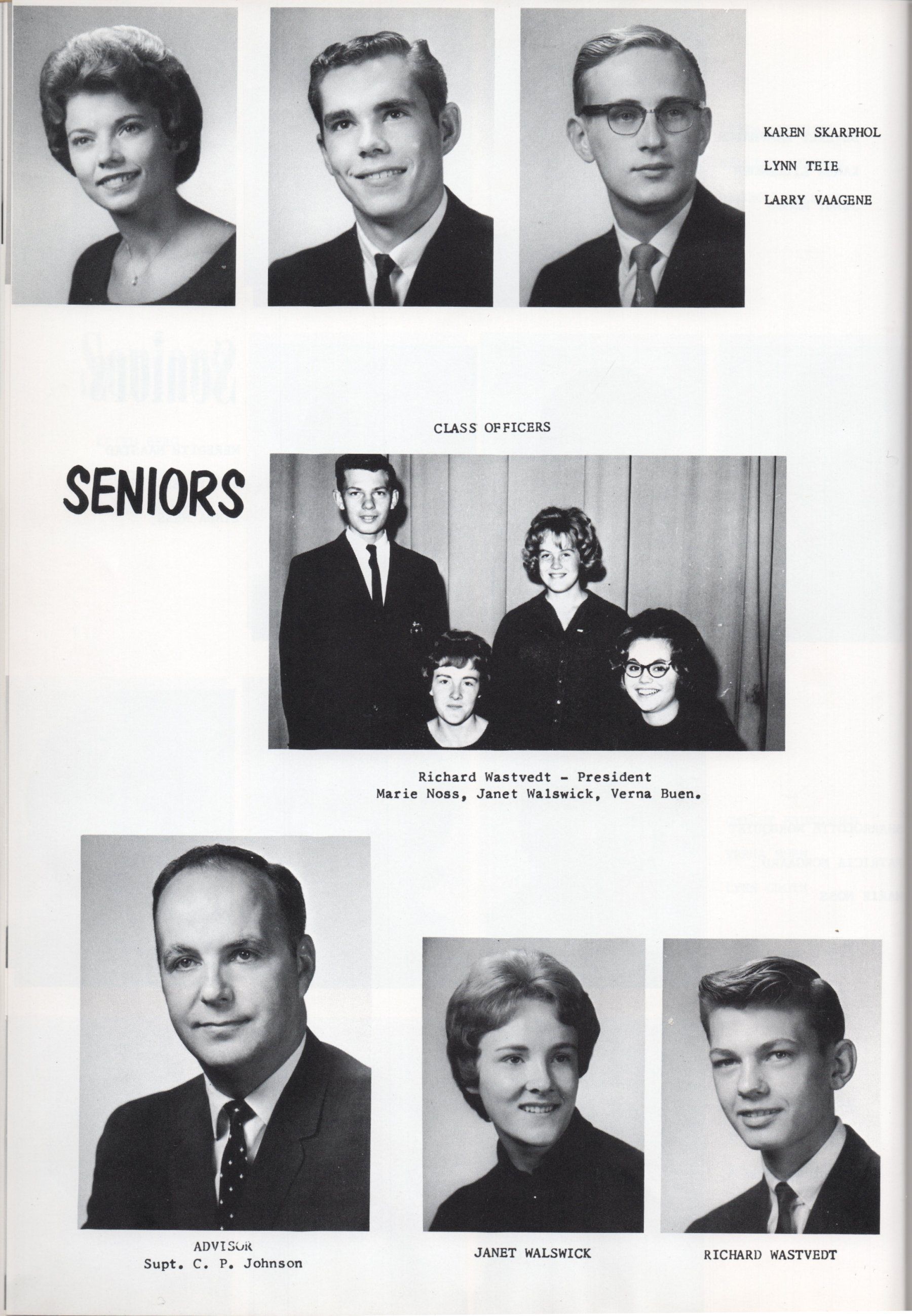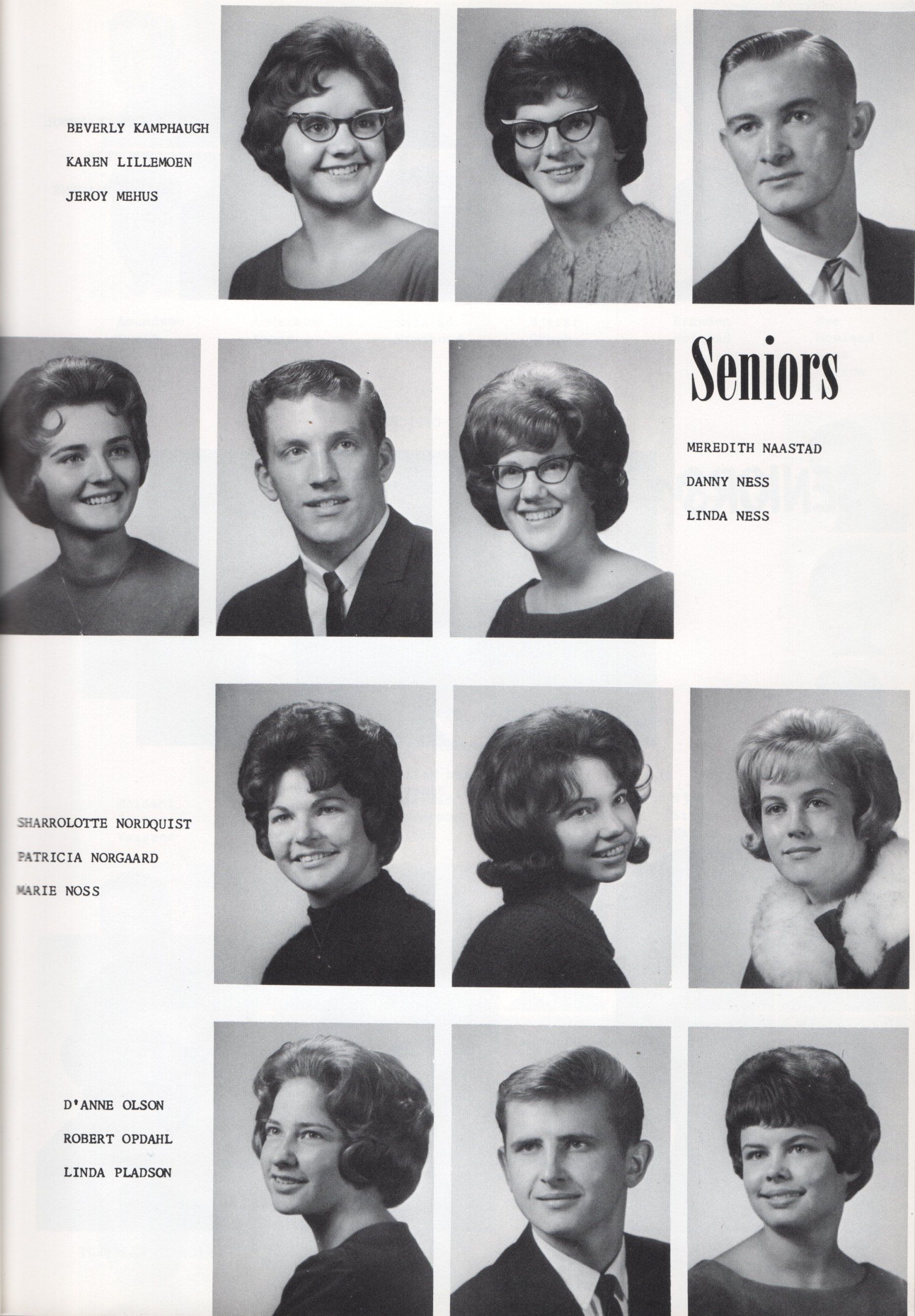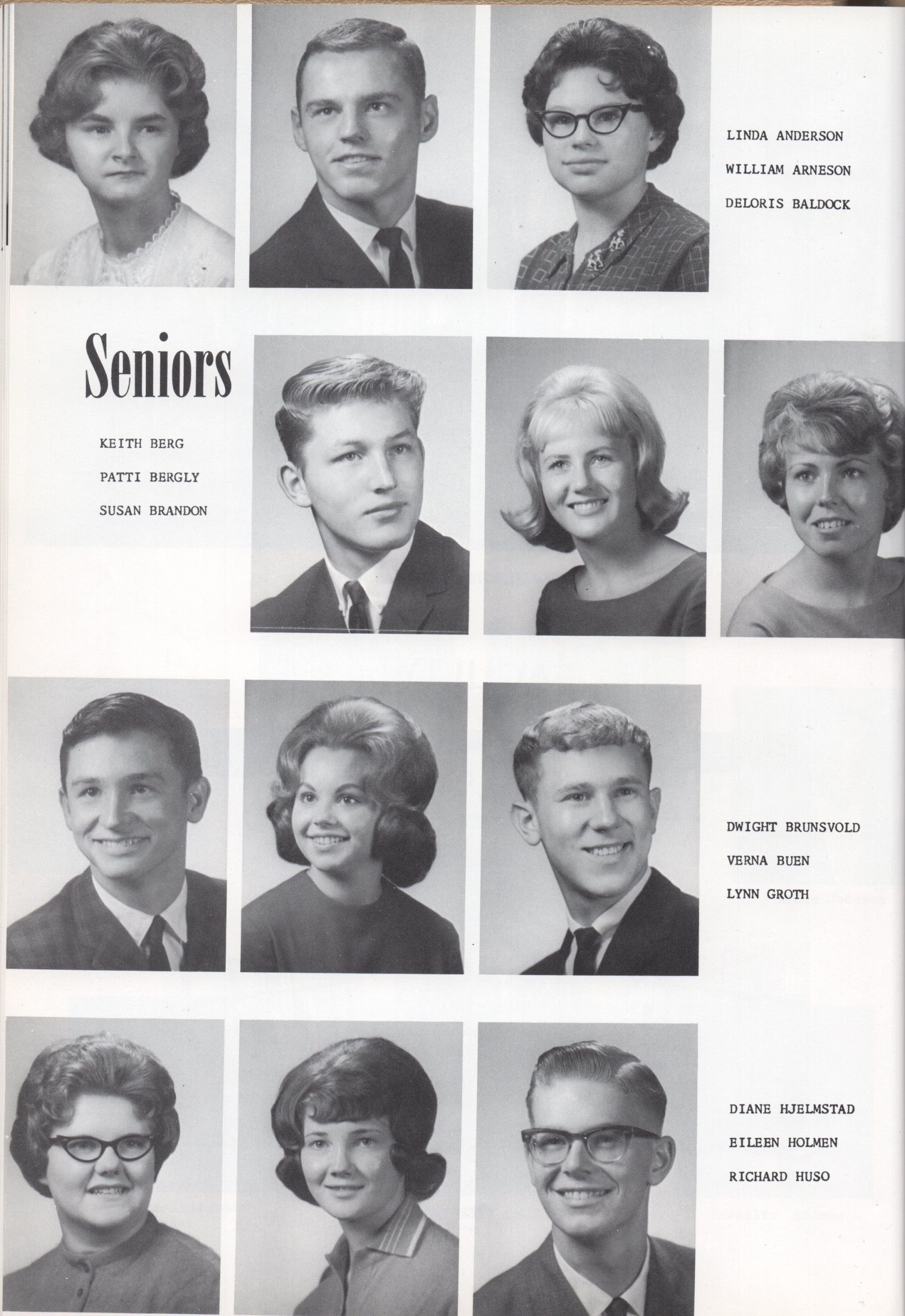 The 1964 yearbook includes three pages of Senior student photographs for: Linda Anderson, William Arneson, Deloris Baldock, Keith Berg, Patti Bergly, Susan Brandon, Dwight Brunsvold, Verna Buen, Lynn Groth, Diane Hjelmstad, Eileen Holmen, Richard Huso, Beverley Kamphaugh, Karen Lillemoen, Jeroy Mehus, Meredith Naastad, Dan Ness, Linda Ness, Sharrolotte Nordquist, Patricia Norgaard, Marie Noss, D'Anne Olson, Robert Opdahl, Linda Pladson, Karen Skarphol, Lynn Teie, Larry Vaagene, Janet Walswick, and Richard Wastvedt.