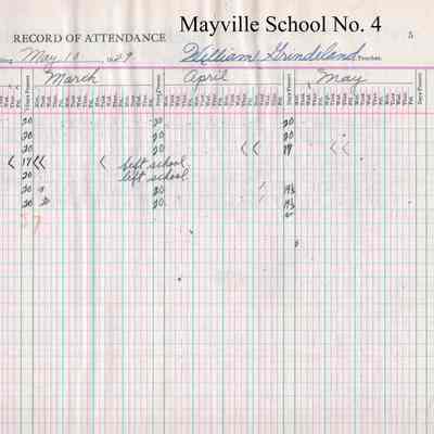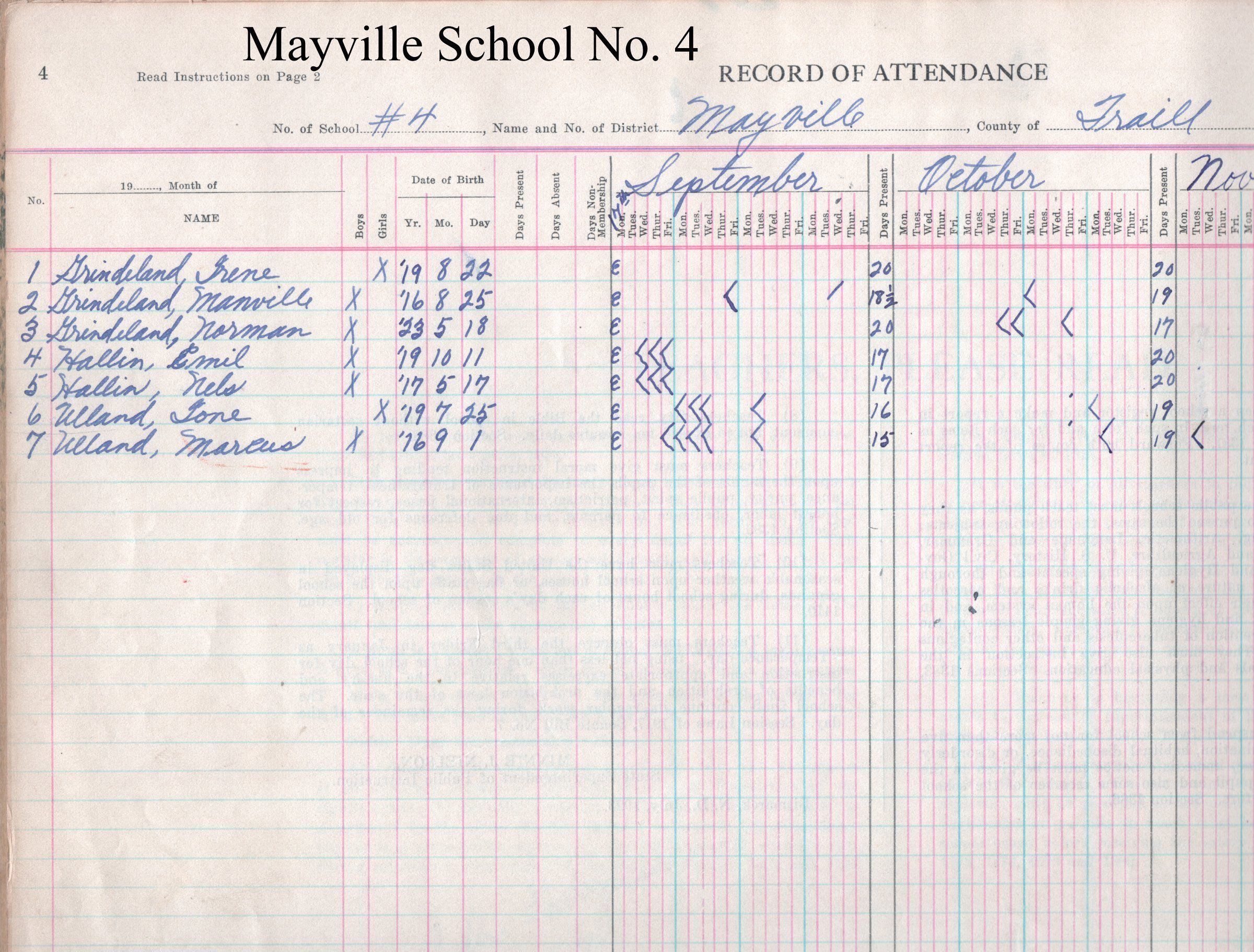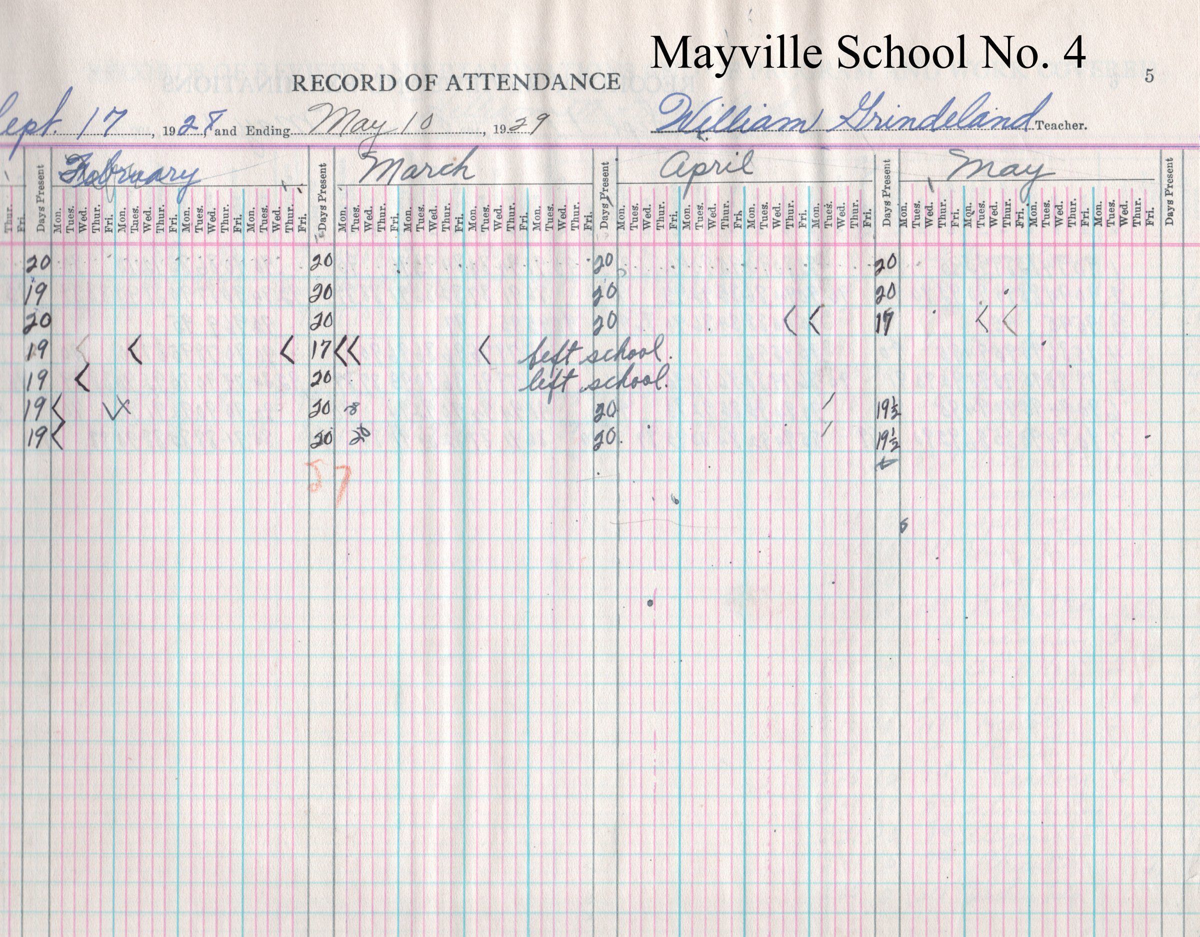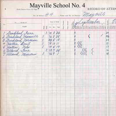 During the 1928-1929 school year, Mayville School No. 4 teacher, William Grindeland, kept attendance records for 7 students including Irene Grindeland, Manville Grindeland, Norman Grindeland, Emil Hallin, Nels Hallen, Ione Ulland and Marcus Ulland.Acquisition