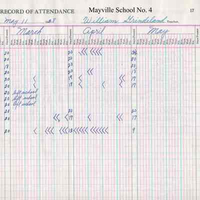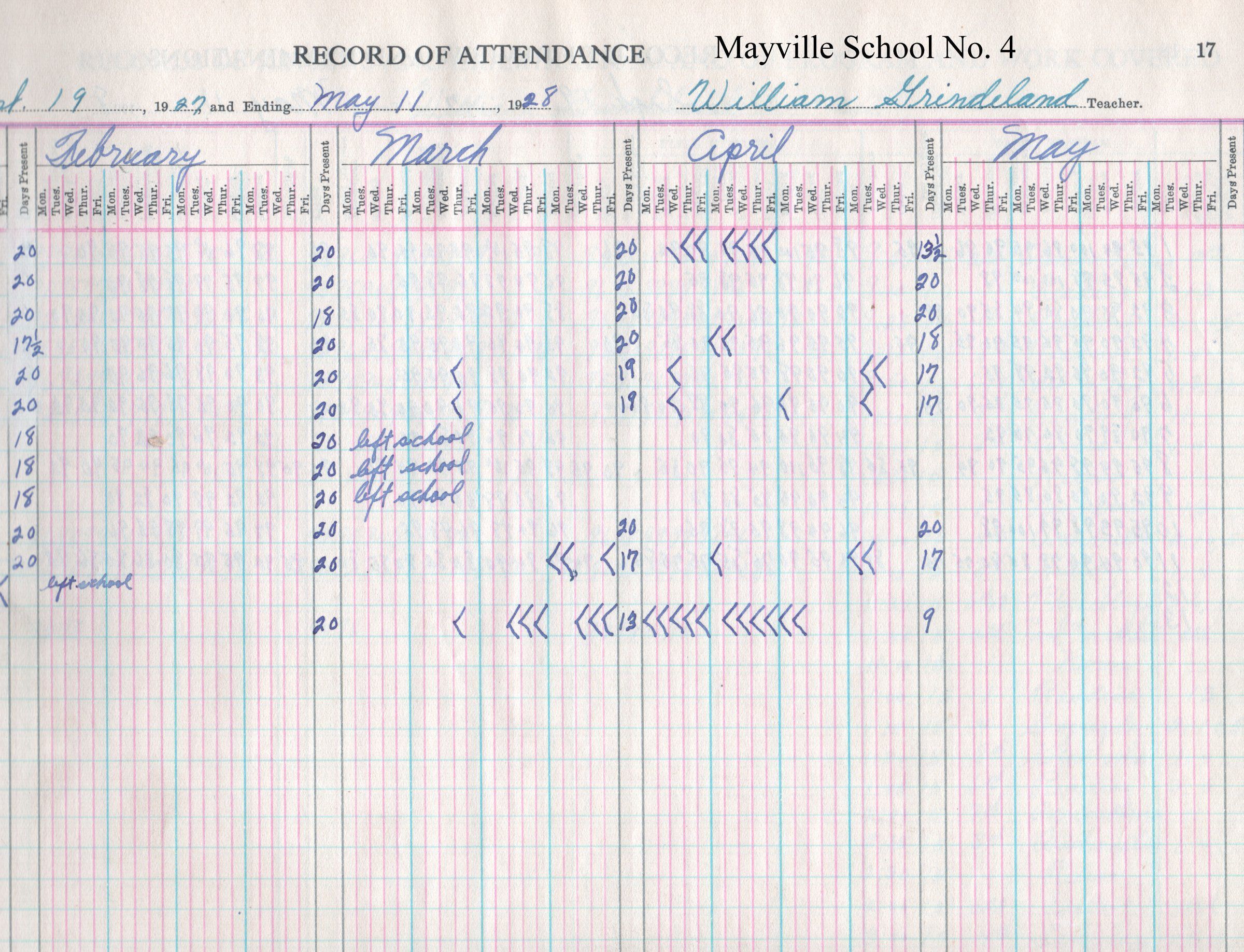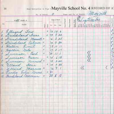 During the 1927-1928 school year, Mayville School No. 4 teacher, William Grindeland, kept attendance records for 13 students including Lois Ellingrud, Irene Grindeland, Manvel Grindeland, Norman Grindeland, Palmer Grindeland, Emil Hallin, Nels Hallin, Evlyn Norma Renden, Earl Swenson, Karen Swenson, Kenneth Swenson, Ione Ulland, and Marcus Ulland.Acquisition