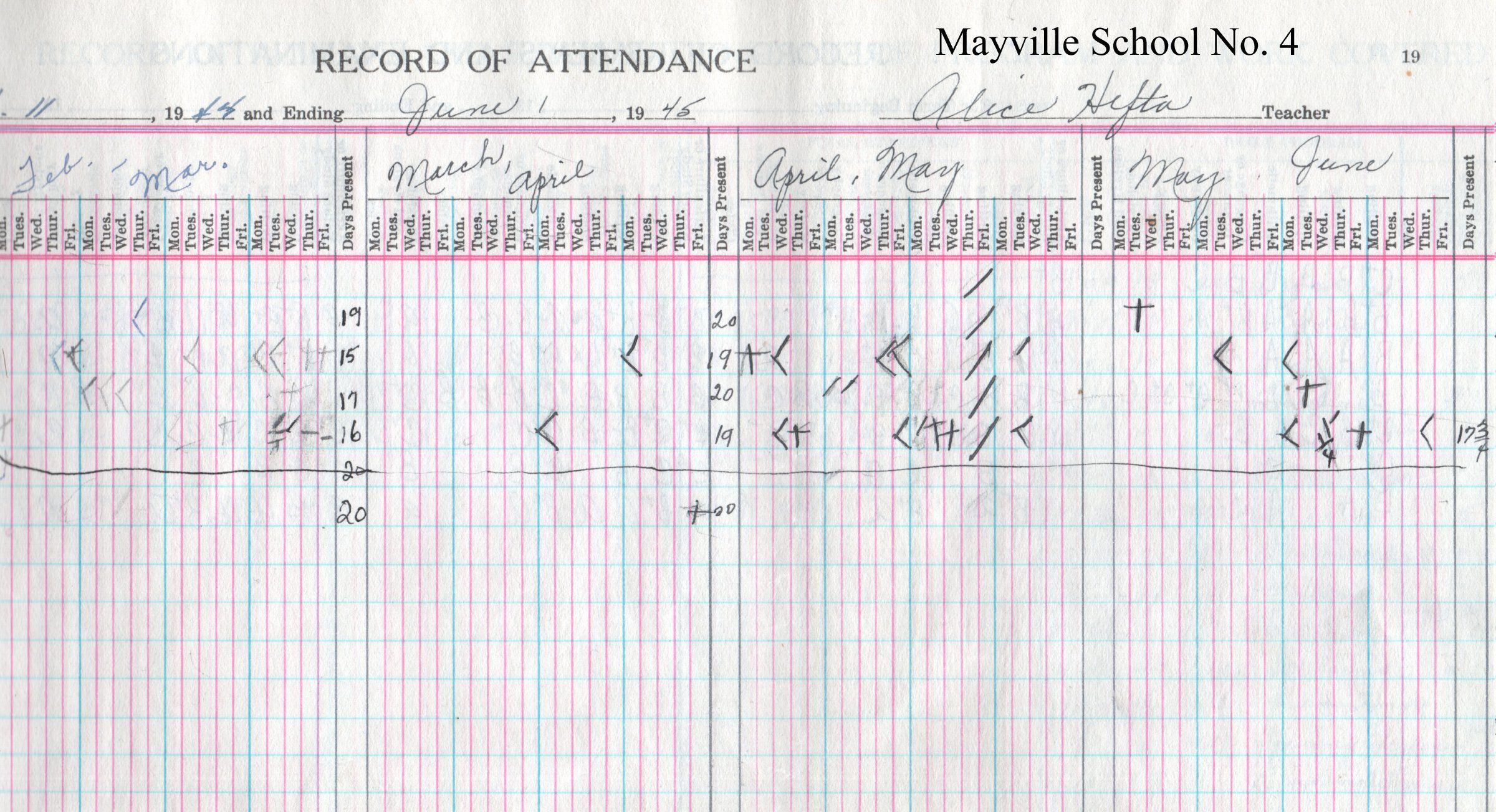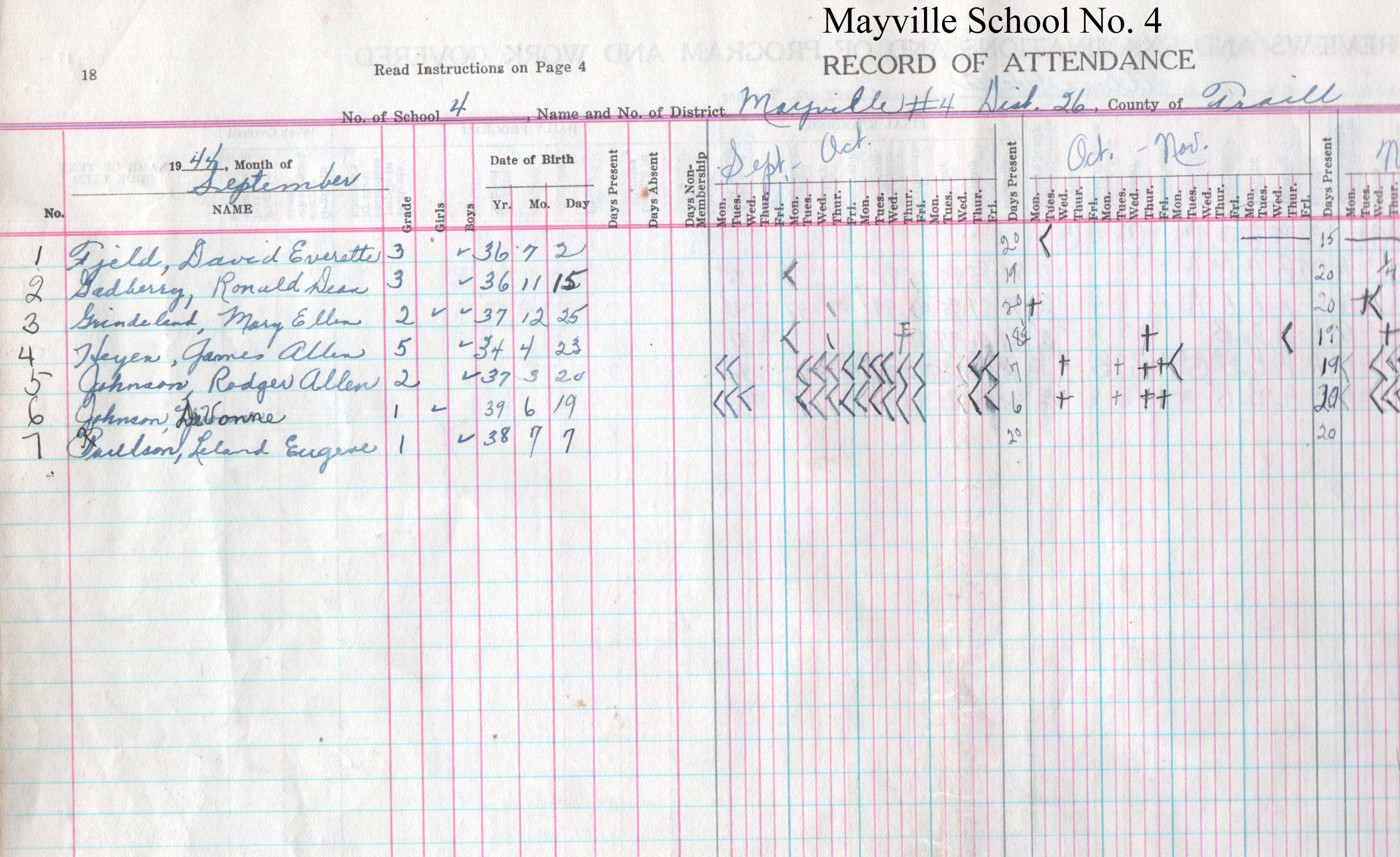 During the 1944-1945 school year, Mayville School No. 4 teacher, Alice Hefta, kept attendance records for 7 students including David Fjeld, Ronald Gadberry, Mary Ellen Grindeland, James Heyen, LaVonne Johnson, Rodger Johnson, and Leland Paulson.Acquisition