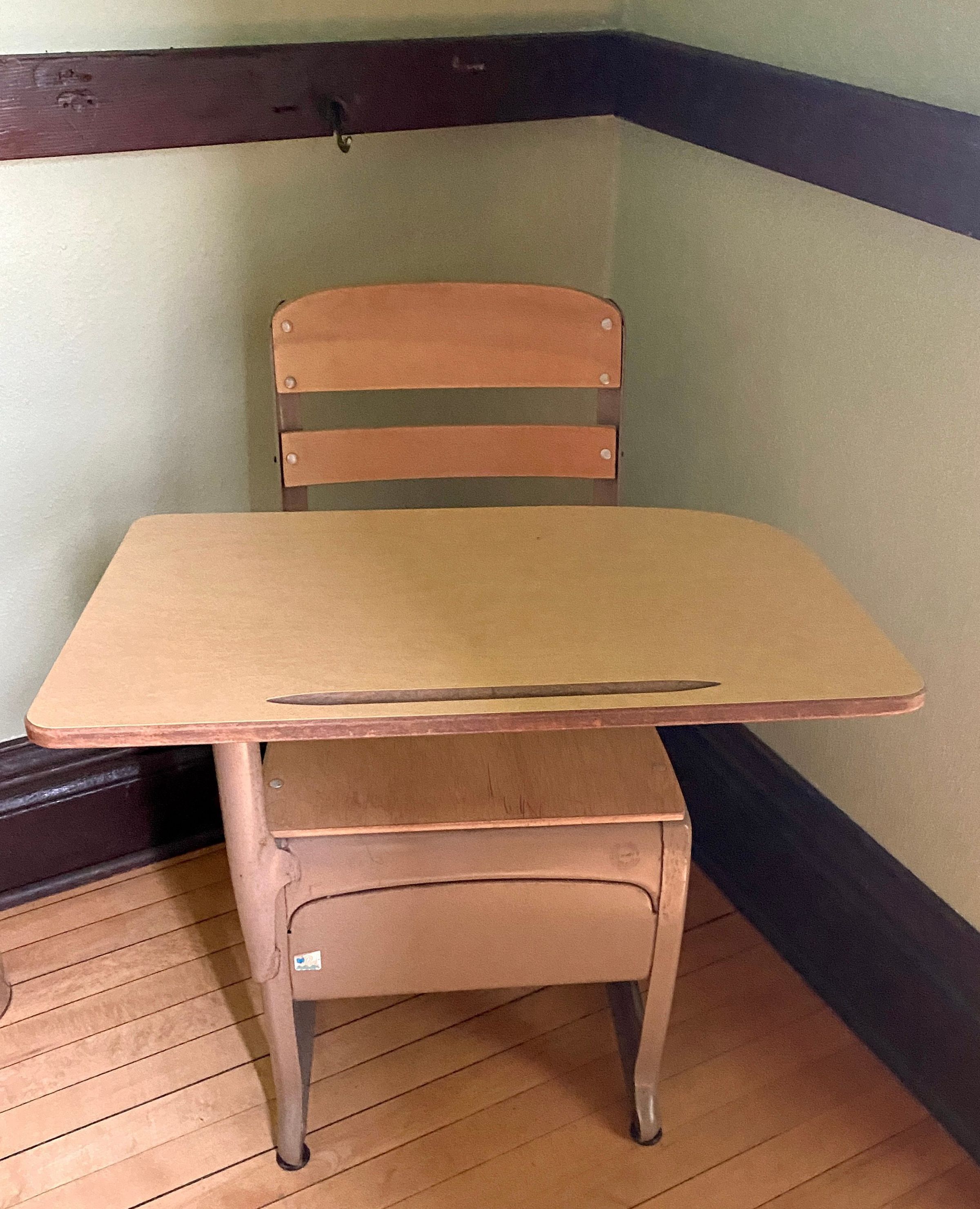 Last type of school desk used in Bloomfield School #1. Given to the Ken Svaleson family by Tony Klemetson who was the owner of the Bloomfield School.Cataloged By