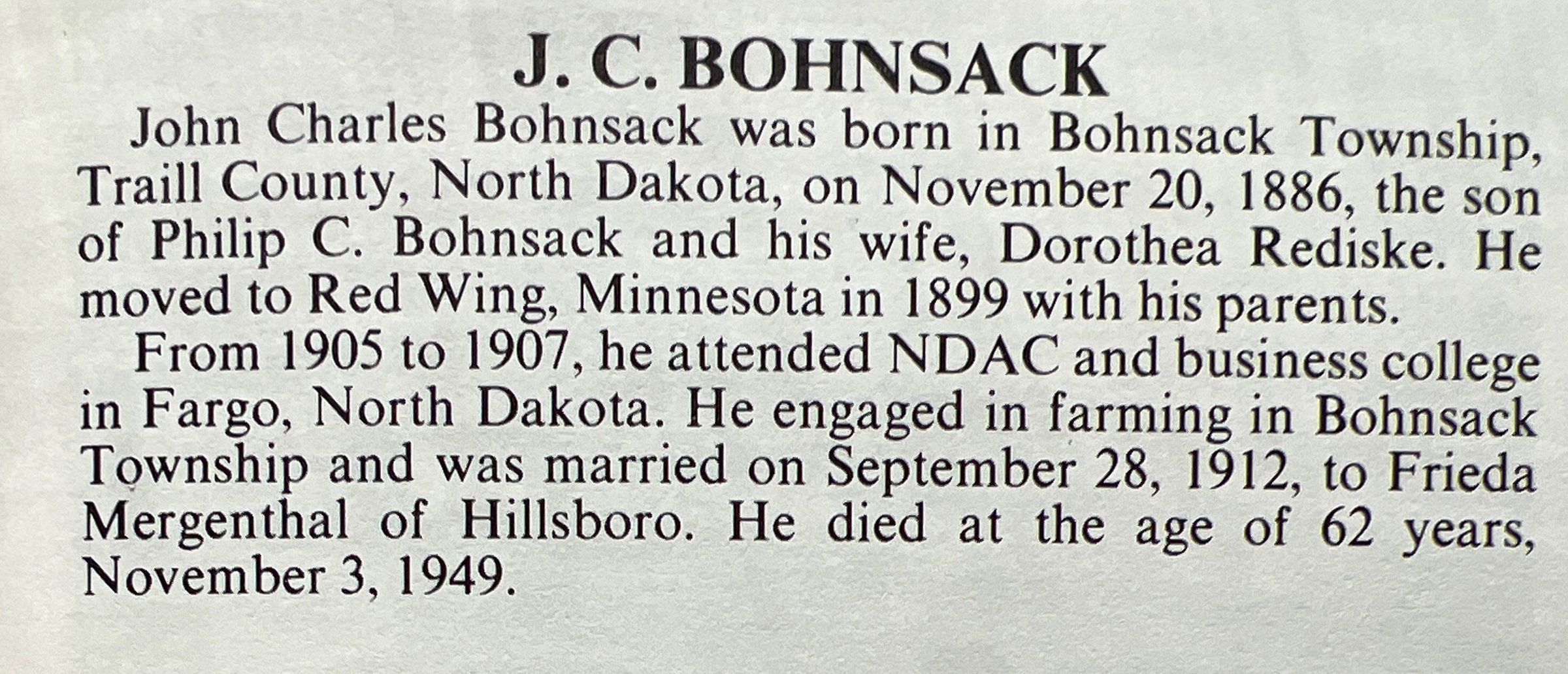 This file contains images of the John Charles (J.C.) and Frieda (Mergenthal) Bohnsack family. J.C. was born on 20 November 1886 to parents Phillip and Dorothea (Rediske) Bohnsack. For a time, J.C. lived with his parents in Red Wing, MN, and then as a young man, attended ND Agricultural College and Business College in Fargo. On 28 September 1912, J.C. Bohnsack married Frieda Mergenthal of Hillsboro. JC. and Frieda farmed and raised their family in Section 10 in Bohnsack Township. J.C. Bohnsack lived to the age of 62, passing away on 3 November 1949.Cataloged By