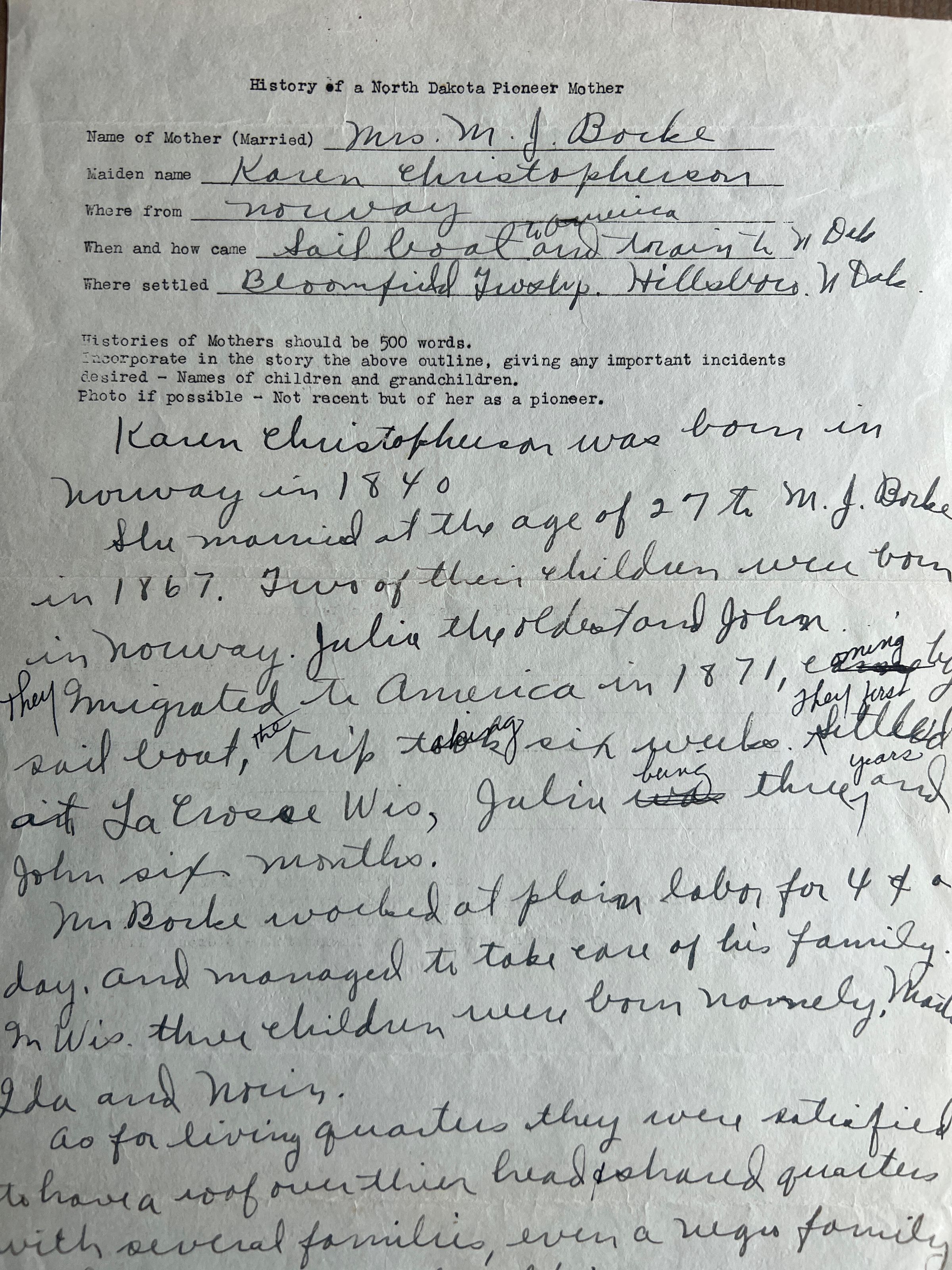 This file is a history of a North Dakota Pioneer Mother, Karen Borke (nee Christopherson). It includes the original hand-written account, and a typed transcript by Ida Hausmann.Cataloged By