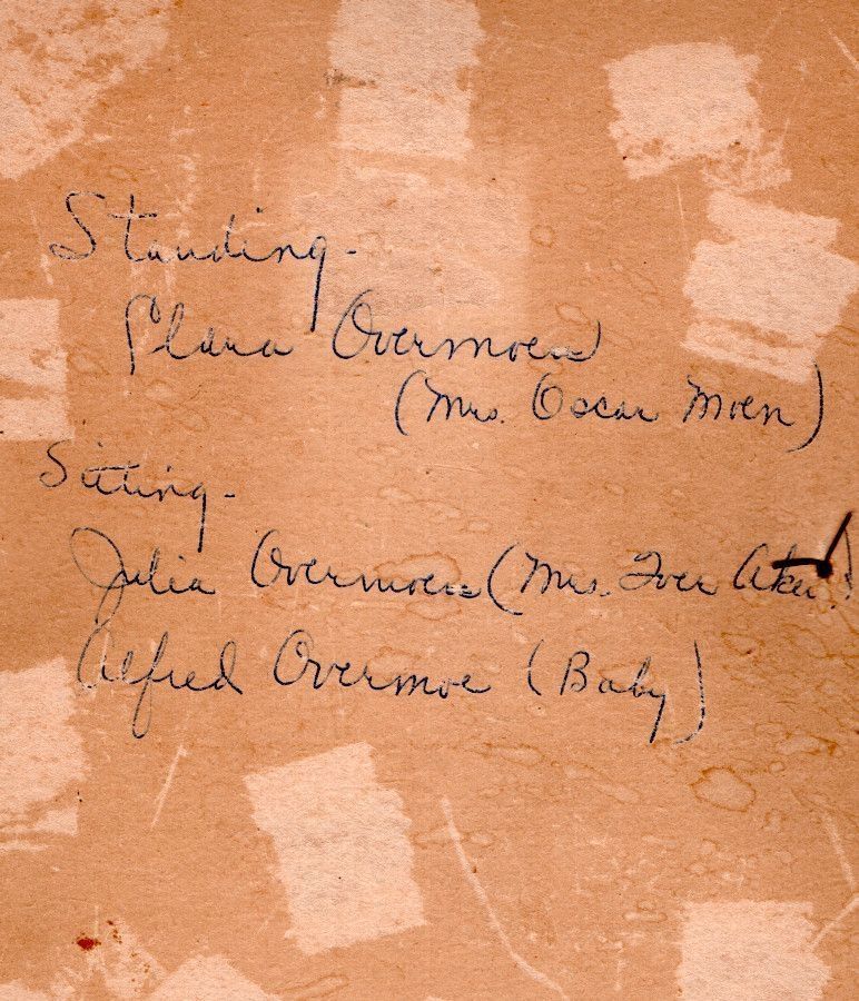 This photograph of three Overmoe children, Clara, Julia, and Alfred, was taken at the C. E. Fuller Studio in Hillsboro, ND. They are identified by notations on the back of the photo frame (below).