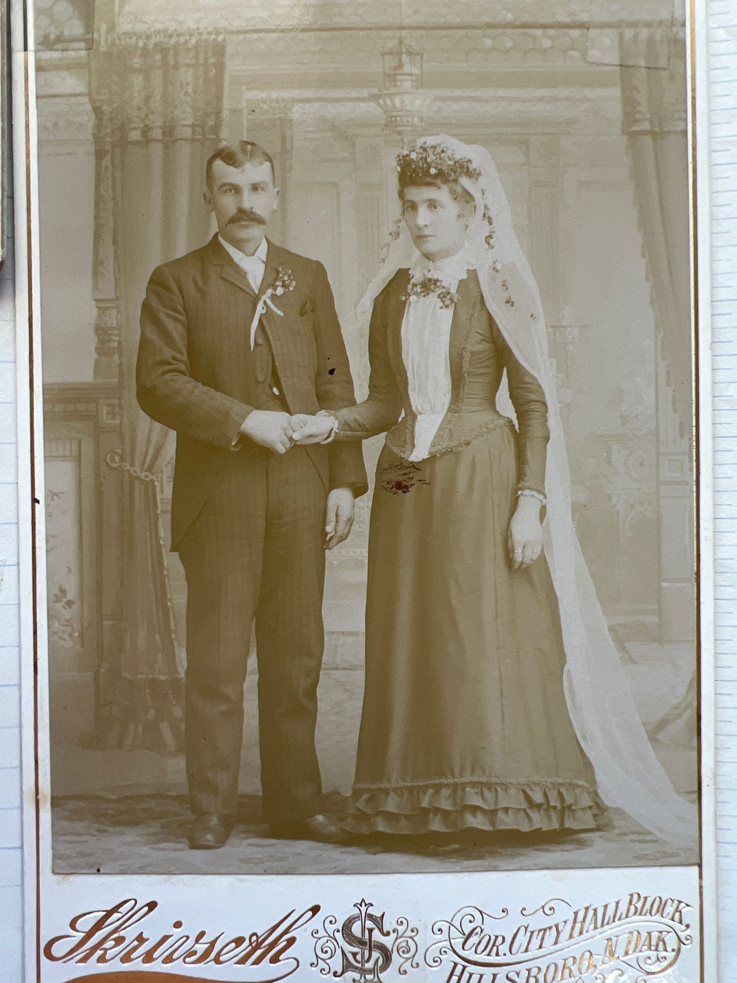 This wedding photo of Fred Rediske & Sophia Reider taken in 1892 in the Skrivseth Studio in Hillsboro, ND. Fred Rediske was a brother to Dorothea Rediske (Mrs. Philip Bohnsack).Acquisition
