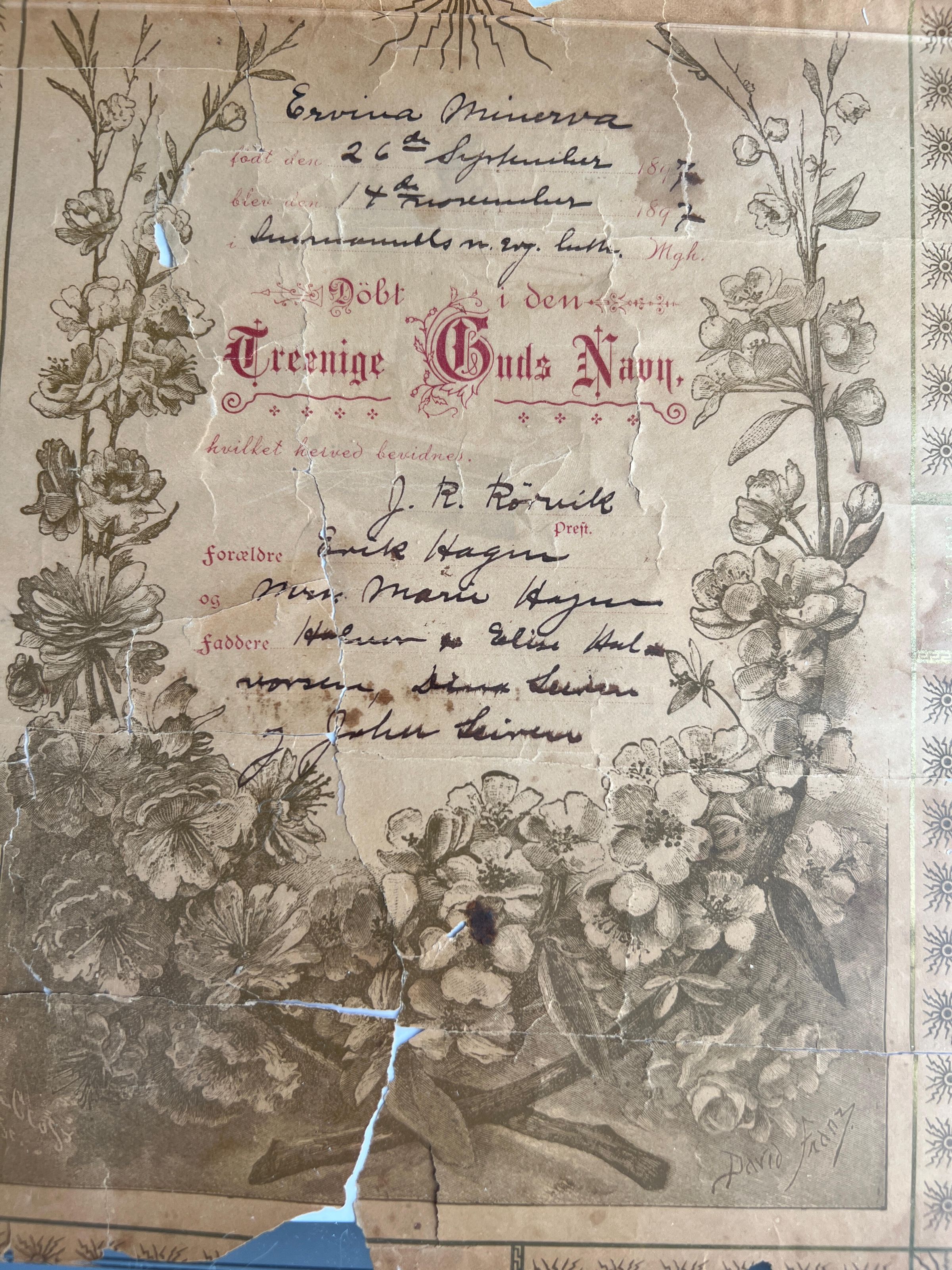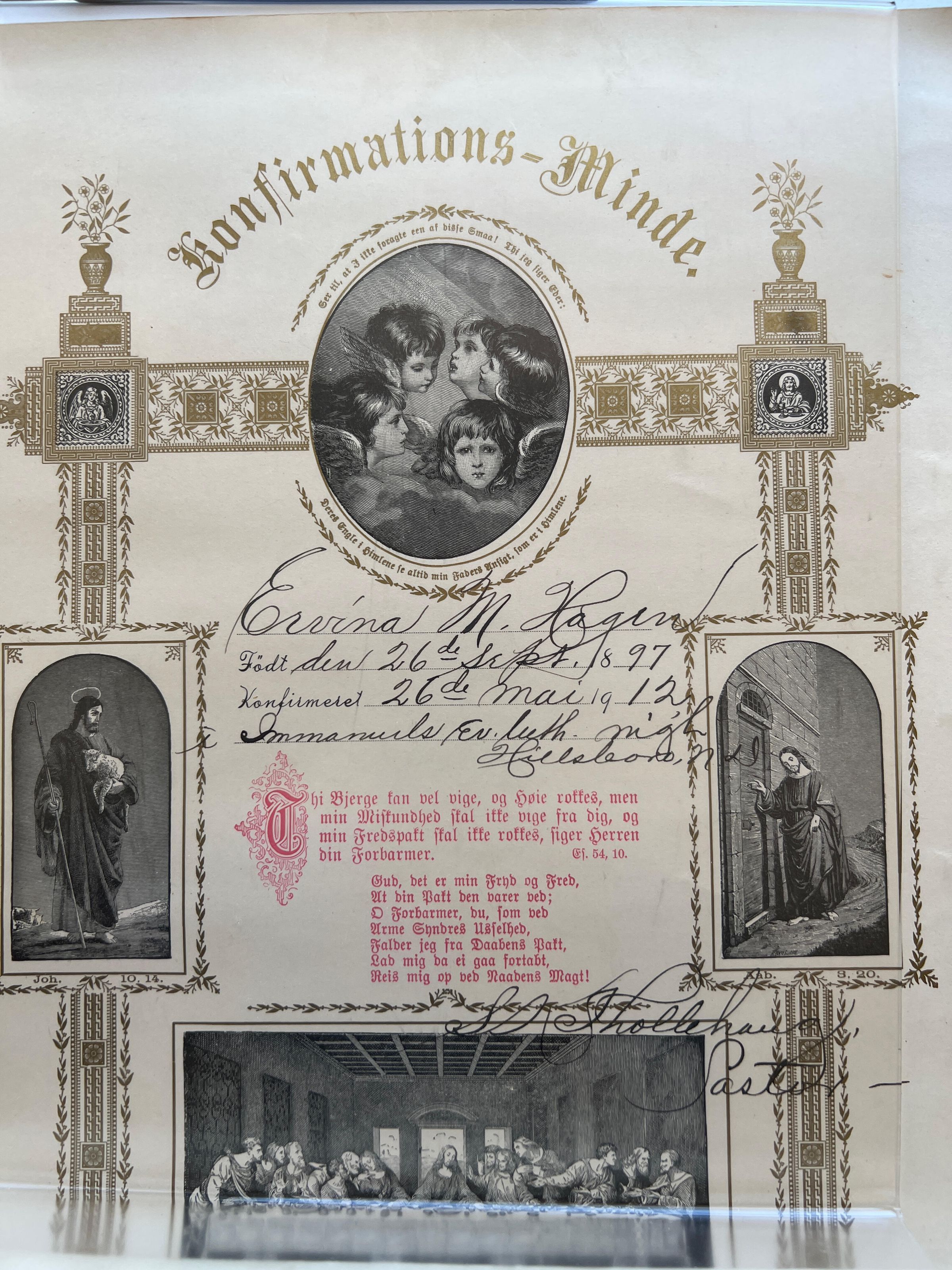 This family folder includes baptism and confirmation certificates for Ervina M. Hagen, who was born on 26 September 1897 to parents Erik and Maria (Manger) Hagen, who farmed in Bloomfield Township in Traill County. Her baptism is dated 14 November 1897, and her confirmation is dated 26 May 1912 in the Immanuel Church of Hillsboro.