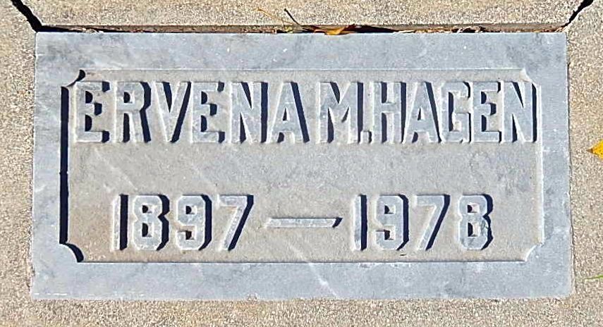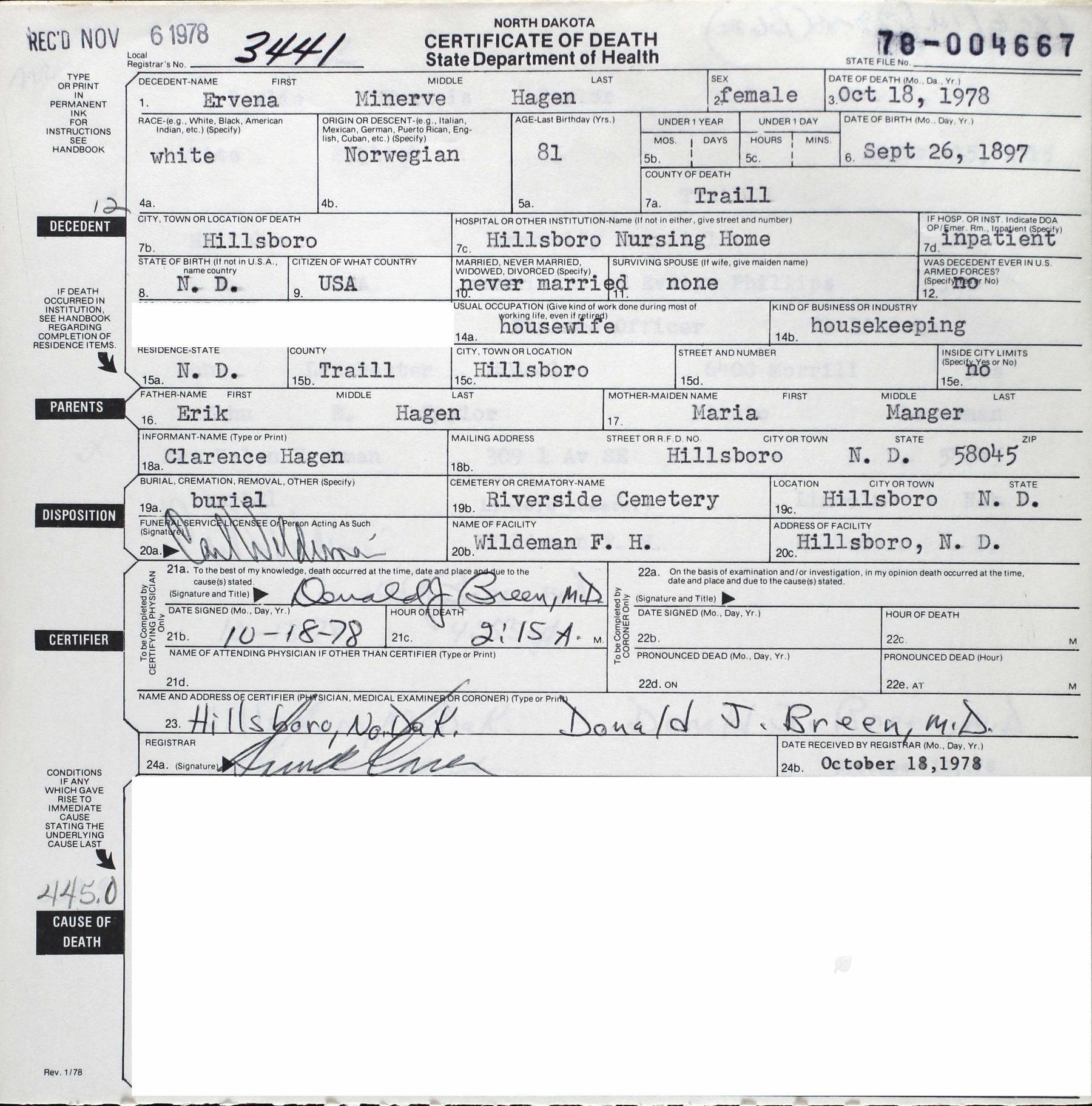 Ervina Minerve Hagen died, age 81, on 18 October 1978 in Hillsboro's Nursing Home [ND Death Certif., below]. Ervina was buried in the Hillsboro Cemetery [US FaG grave-marker, below].Acquisition