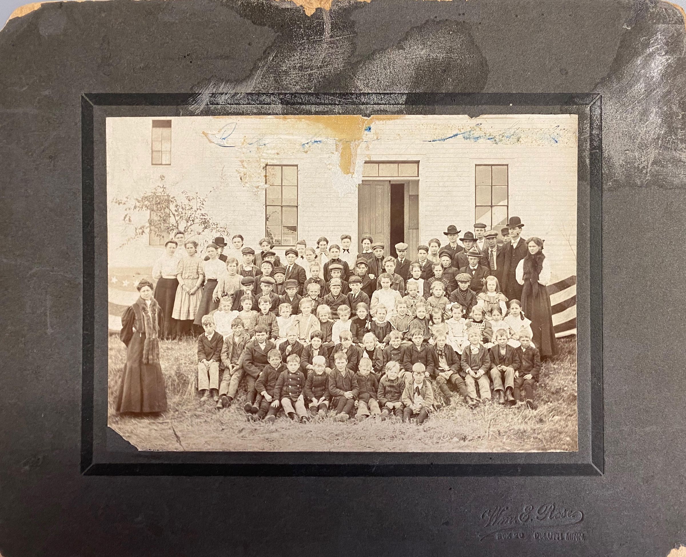Photo of Caledonia School before 1909. Teacher in photo - May (Huus) Vettel