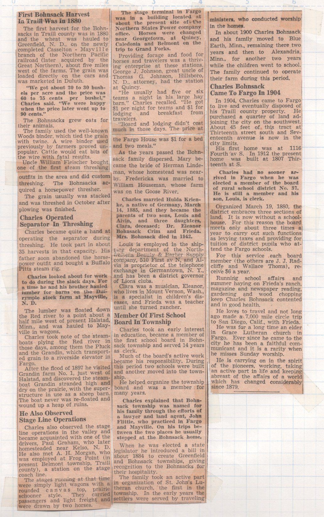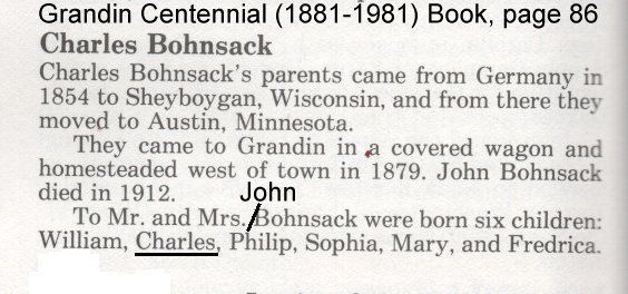 The life of Charles and Hulda, and their children, was briefly described on page 86 in the Grandin Centennial (1881-1981) book (below). A more thorough description is in Chapters 5 & 6 in a document on Bohnsack family history compiled and written by Dorothy (Bohnsack) Odlaug, a granddaughter of Charles Bohnsack. Dorothy was born in 1914 and died in 2016 at the age of 102. Her chapter pages are included in this file. Also, the lives of Charles and Hulda Bohnsack are described on pages 11 & 15 in the 37-pages of a family history document written by Walt Bohnsack (see Walt Bohnsack's Catalogit entry; these pages are also included in this file).