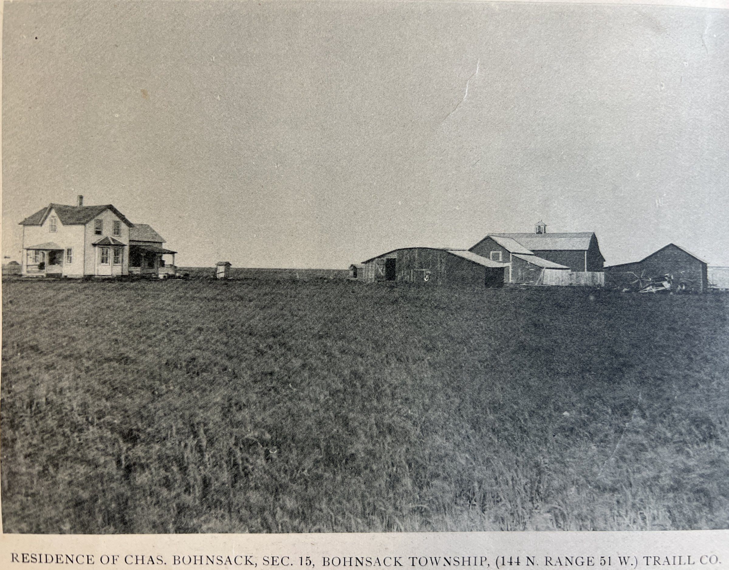 In 1886, Charles (Chas) Bohnsack married Hulda Krienke in Hillsboro, Traill County, DT. Chas and Hulda had five children in Traill County that survived to adulthood, including two sons, Louis Bohnsack (b. 3 April 1886, m. Elsa Schwalbe, d. 1960) & Alvin Bohnsack (b. 21 May 1890, m. Lavina Hardy, d. 1958) and three daughters, Clara Bohnsack (b. 15 June 1887, m. George Bohlig, d. 1916), Eleanor Bohnsack (b. 18 May 1892, m.Dr. Crim, d. 1968), & Frieda Bohnsack (b. 30 April 1896, m. Orville Colb, d. 1959).