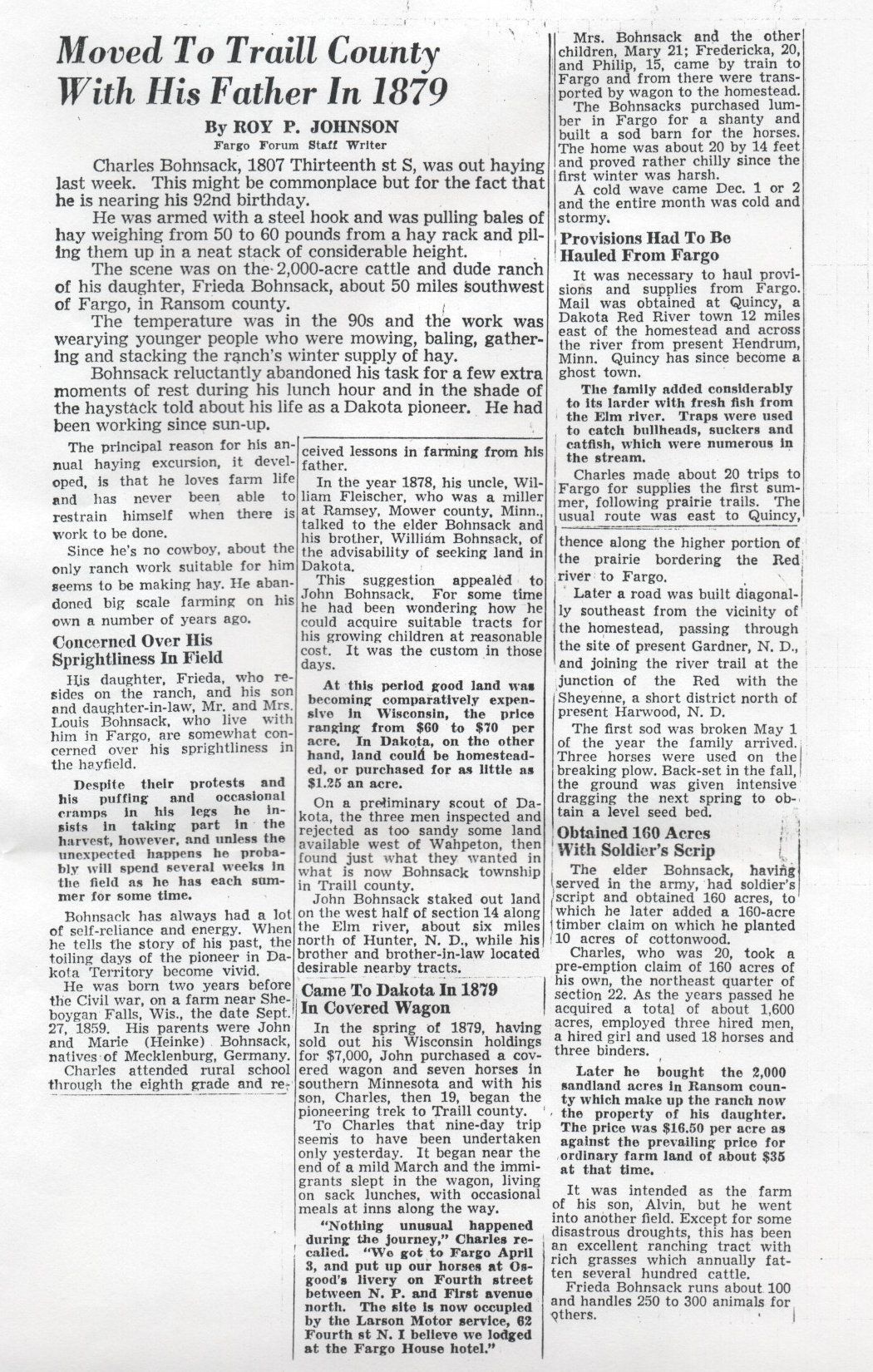 Chas Bohnsack lived to 98, dying in 1957 in Fargo, ND, leaving two son, Louis and Alvin, and two daughters, Frieda and Eleanor, and 13 grandchildren and 20 great-grandchildren (see Charles' children document). Charles was interred in the Bohnsack Cemetery located in the SE Qtr. of Sect. 10 in Bohnsack Township.Acquisition