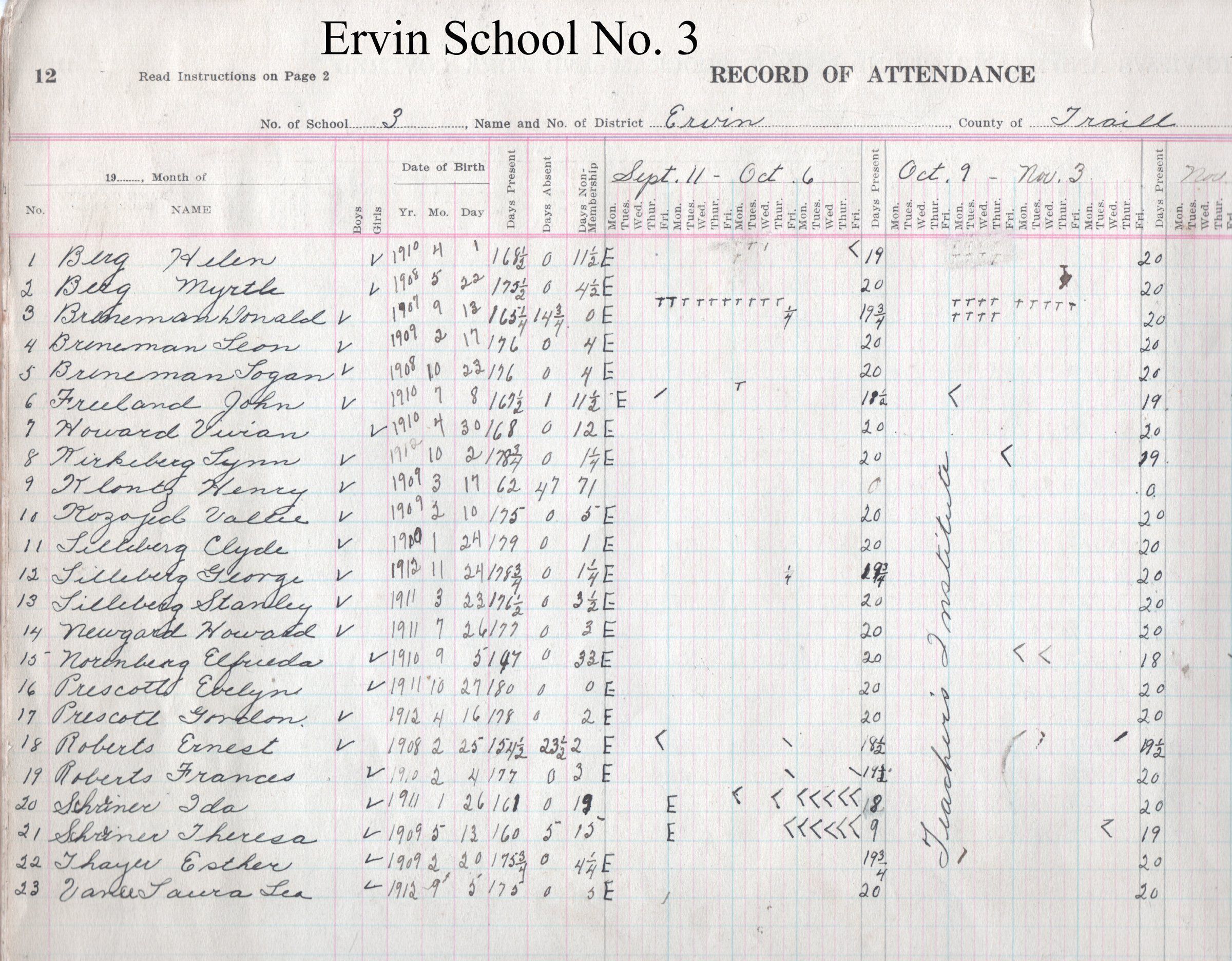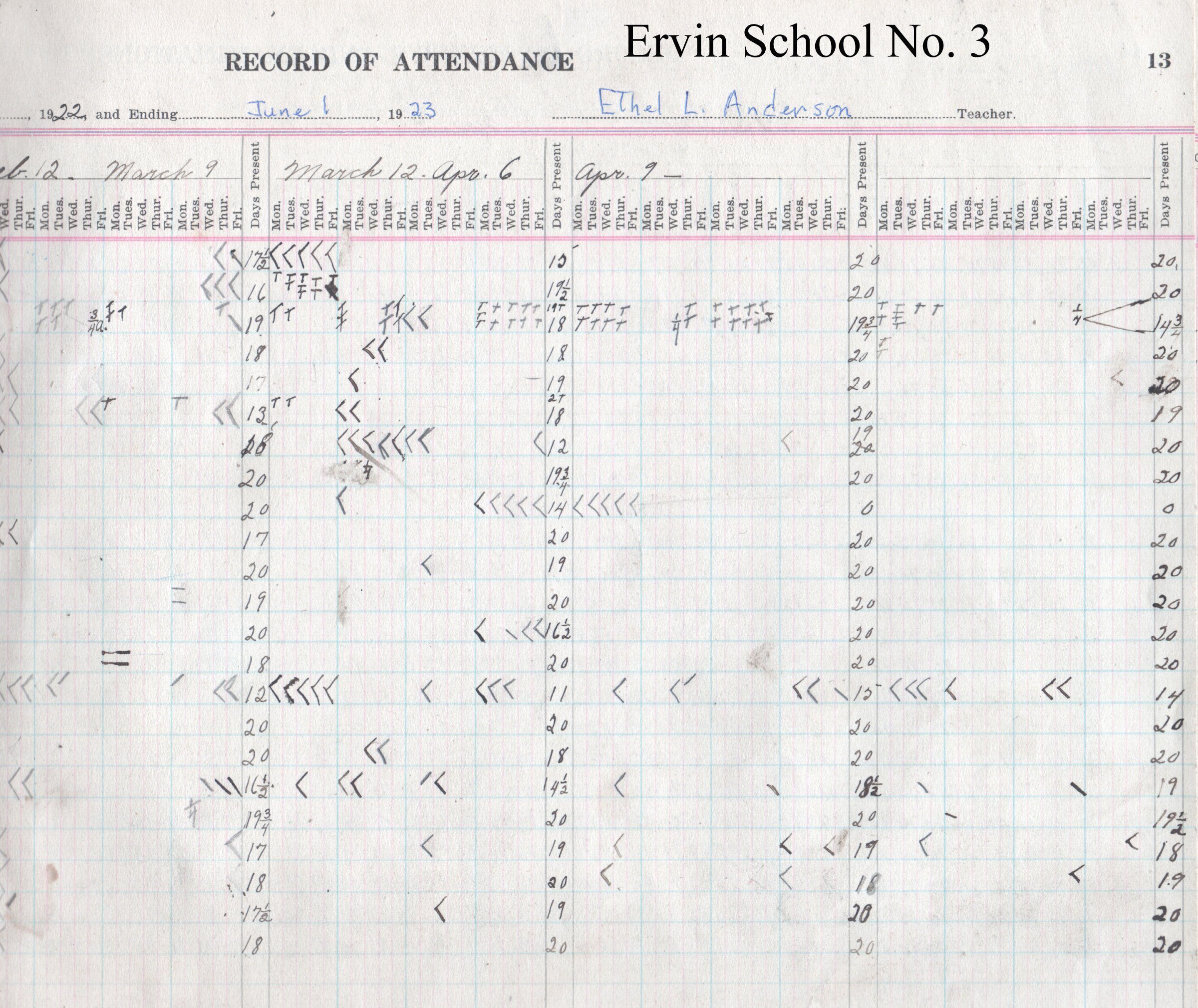 During the 1922-1923 school year, Ervin School No. 3 teacher, Ethel L. Anderson, kept attendance records for 23 students including Helen Berg, Myrtle Berg, Donald Breneman, Leon Breneman, Logan Breneman, John Freeland, Vivian Howard, Lynn Kirkeberg, Henry Klontz, Vallie Kozojed, Clyde Lilleberg, George Lilleberg, Stanley Lilleberg, Howard Newgard, Elfrieda Noronberg, Evelyn Prescott, Gordon Prescott, Ernest Roberts, Francis Roberts, Ida Scheiner, Theresa Scheiner, Esther Thayer, and Laura Lee Vance.