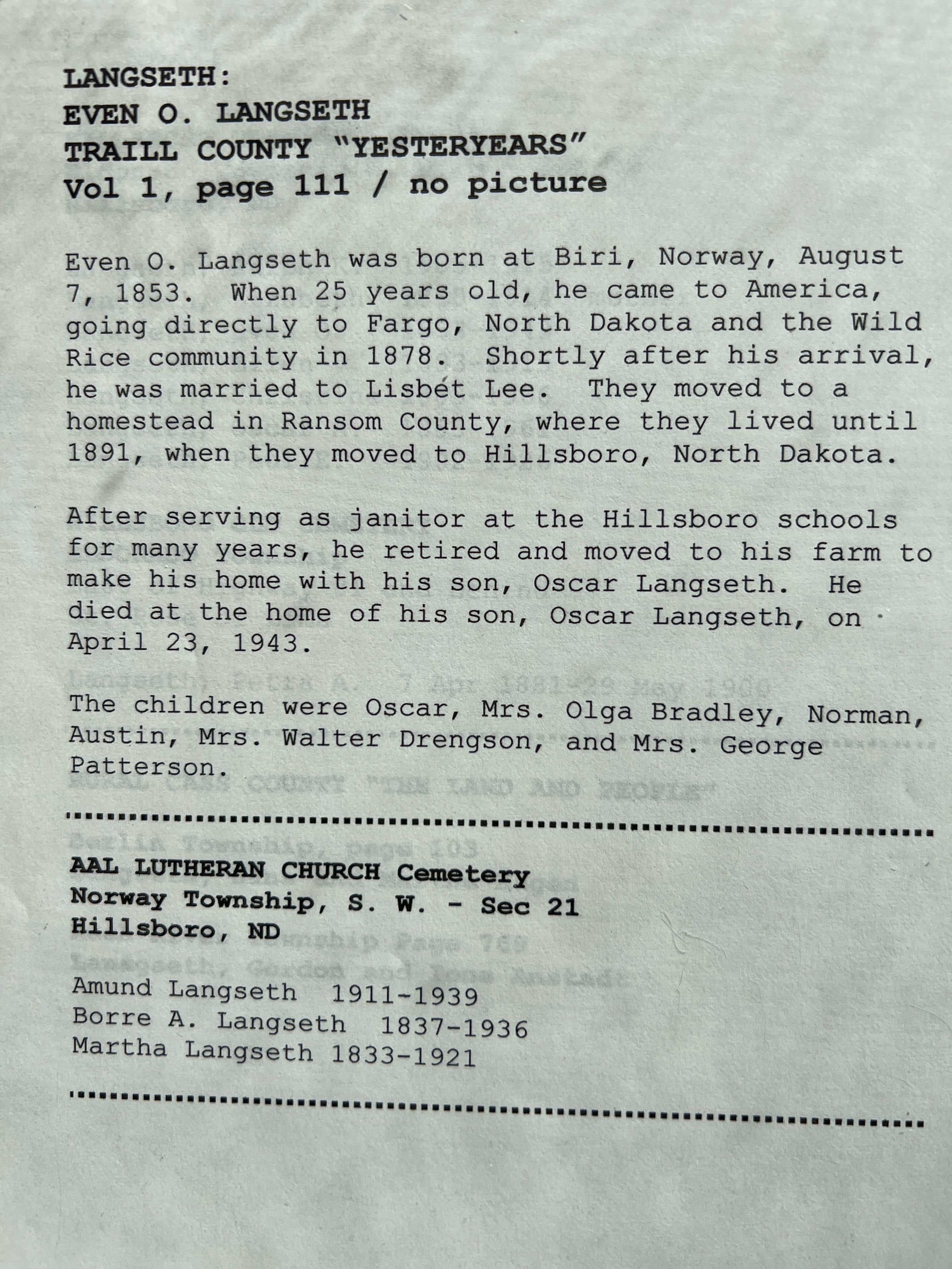This folder contains extensive searches on Even O. and Lisbeth (Lee) Langseth, and their descendants, conducted by TCHS volunteer Gerry Mohn for Mr. Jan Habberstad of Trondhiem, Norway. Even O. and Lisbeth had five children: Oscar Langseth, Olga (Langseth) Bradley, Norman Langseth, Mrs Walter Drengson, and Mrs. George Patterson. A number of other langesth family are buried in the AAL Lutheran Chruch Cemetery in Norway Township, Traill County, and in the Hillsboro Cemetery.Cataloged By