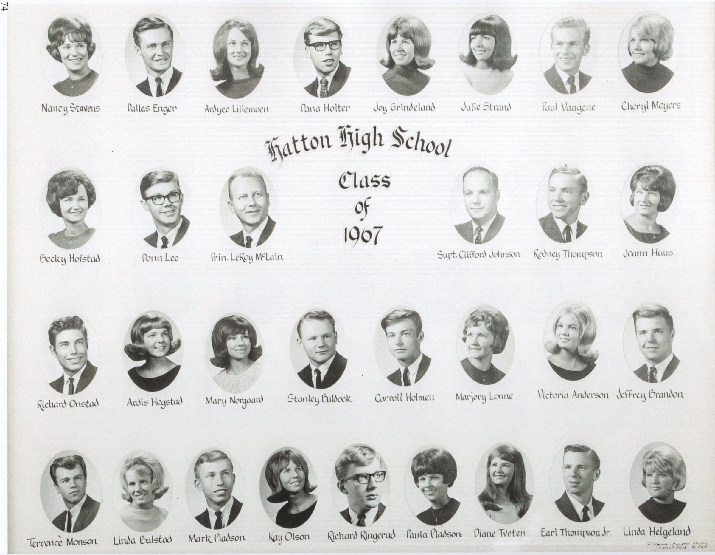 A photograph of the Hatton High School Class of 1967 is included on page 74 in the All School Reunion book, "Hatton Flyers".