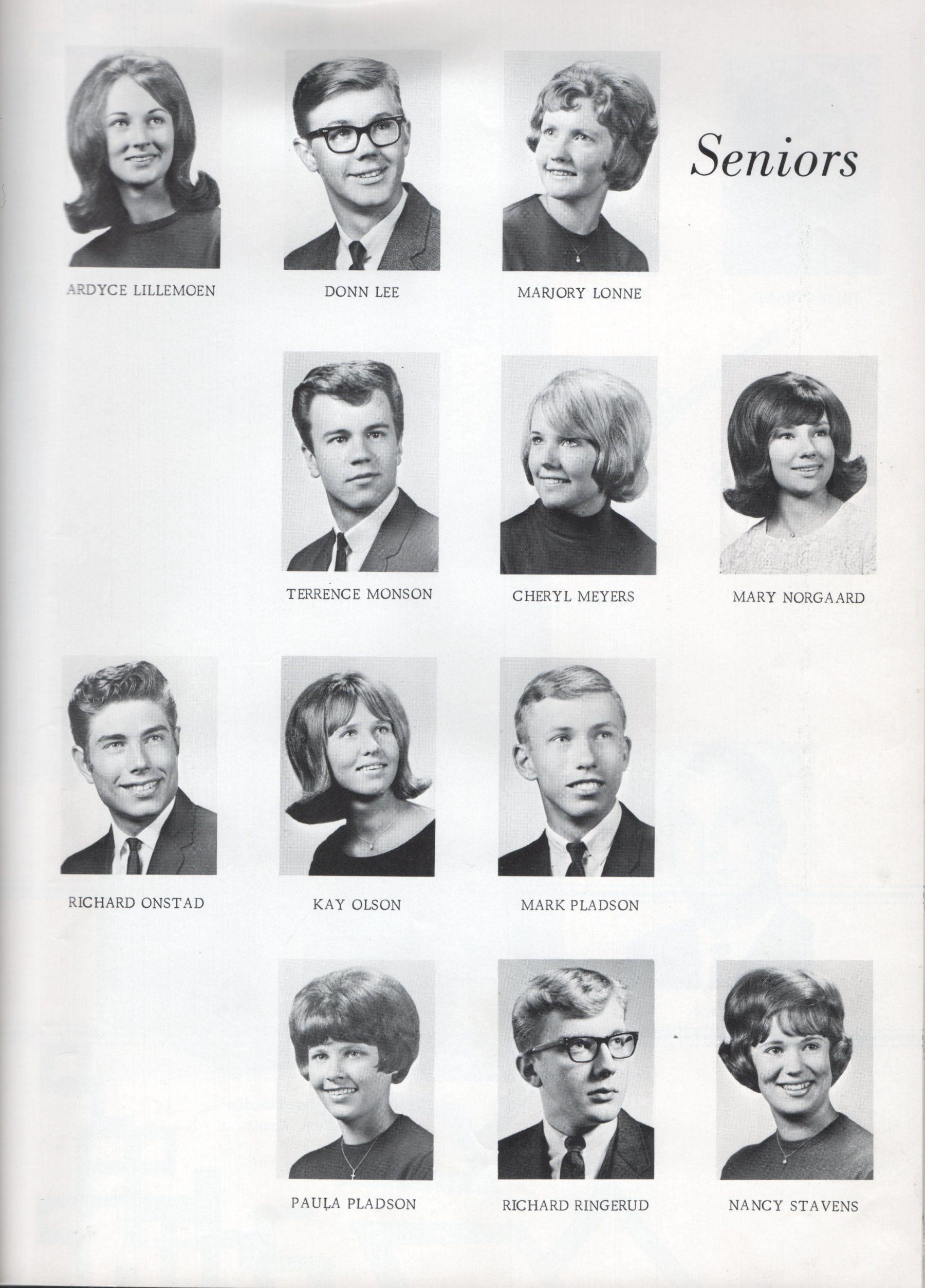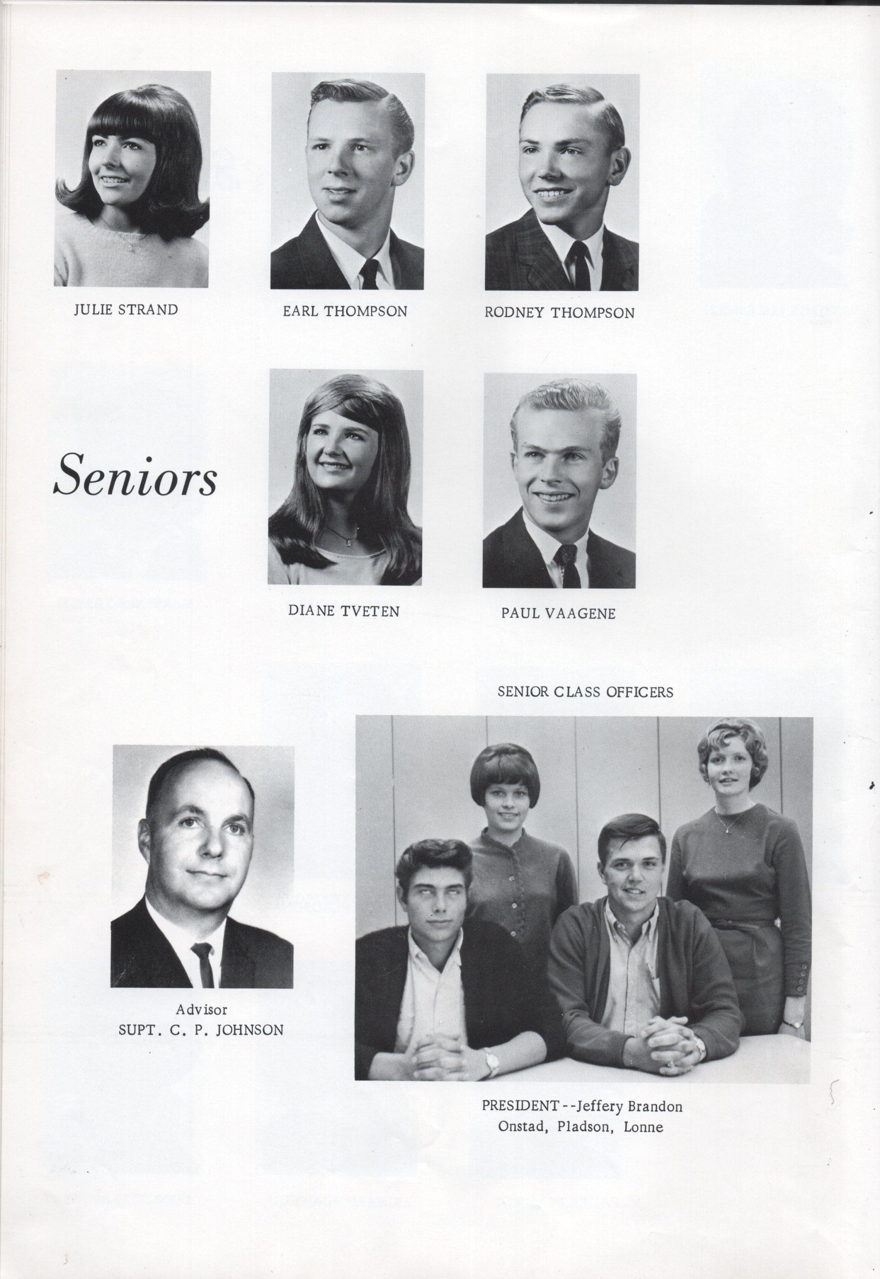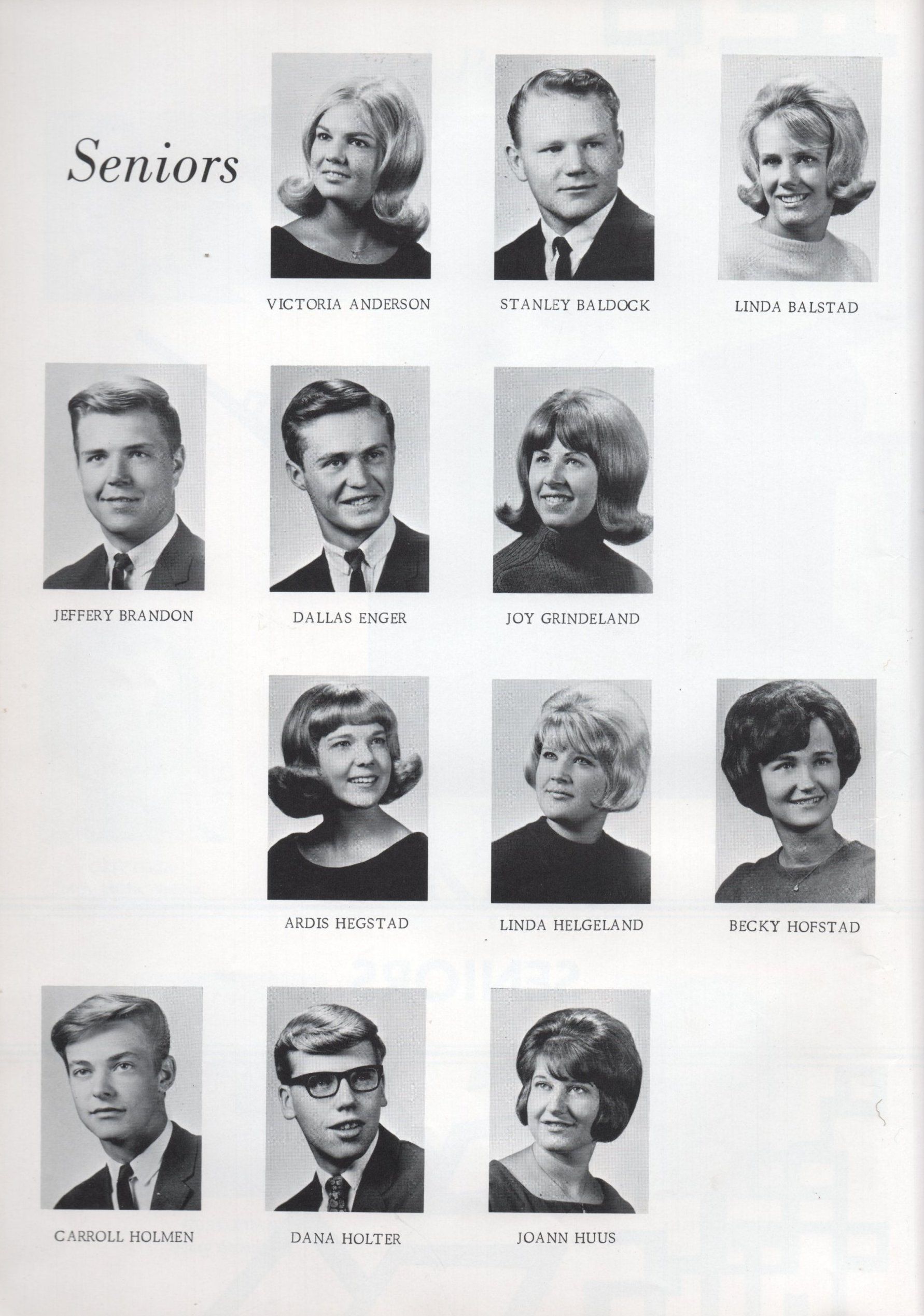 The 1967 yearbook includes three pages of Senior student photographs for: Victoria Anderson, Stanley Baldock, Linda Balstad, Jeffery Brandon, Dallas Enger, Joy Grindeland, Ardis Hegstad, Linda Helgeland, Becky Hofstad, Carroll Holmen, Dana Holter, Joann Huss, Donn Lee, Ardyce Lillemoen, Marjory Lonne, Cheryl Meyers, Terrence Monson, Mary Norgaard, Kay Olson, Richard Onstad, Mark Pladson, Paula Pladson, Richard Ringerud, Nancy Stavens, Julie Strand, Earl Thompson, Rodney Thompson, Diane Tveten, and Paul Vaagene.