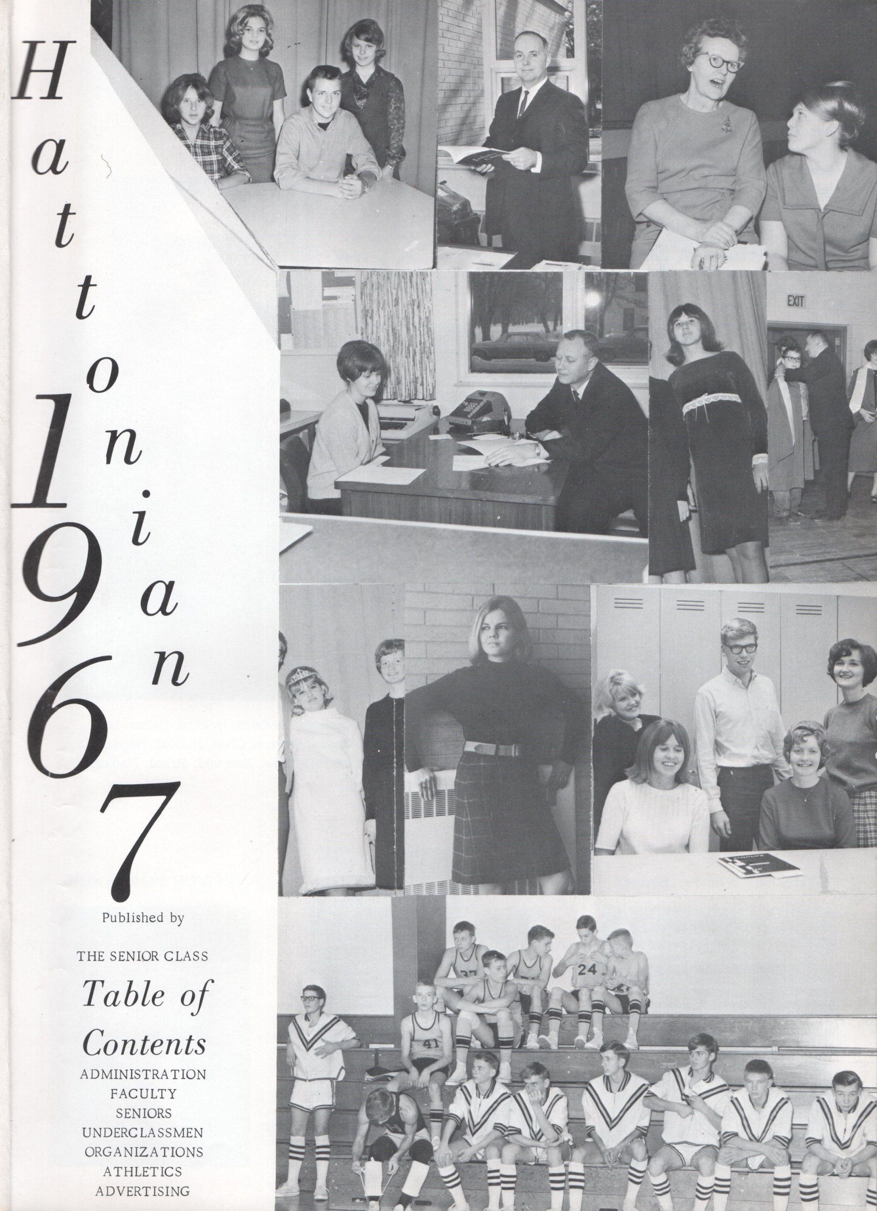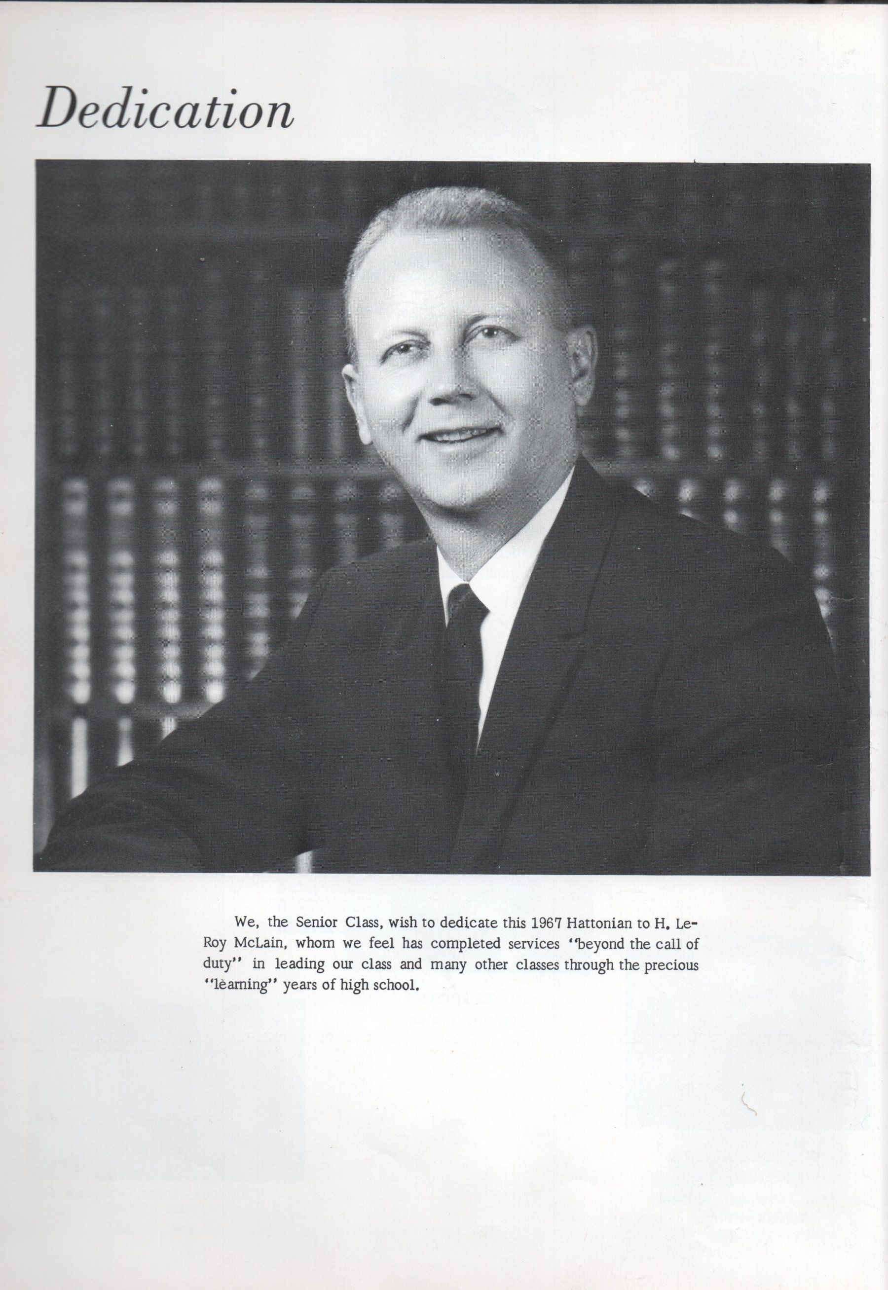 The Class of 1967 Hatton High School Yearbook, titled 1967 Hattonian, was dedicated to LeRoy McLain, teacher.