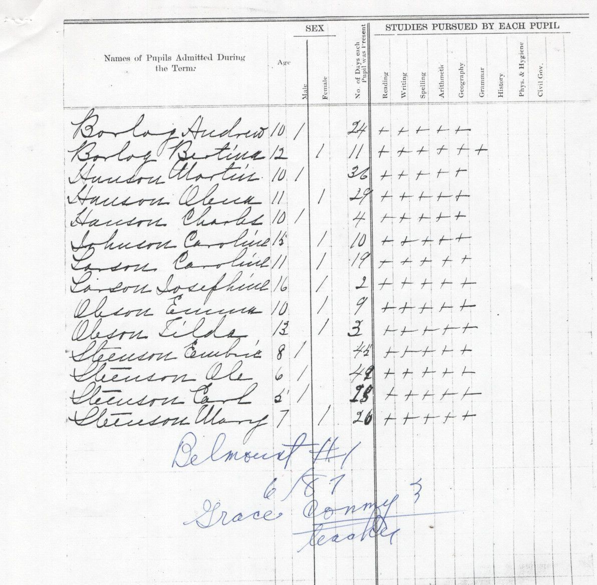 In June 1887, Belmont School No. 1 teacher Grace Conmy reported attendances and studies pursued for 14 students, including Andrew Borlog, Bertina Borlog, Charles Hanson, Martin Hanson, Olina Hanson, Caroline Johnson, Caroline Larson, Josephine Larson, Emma Olson, Tilda Olson, Carl Steenson, Embrie Steenson, Mary Steenson and Ole Steenson.