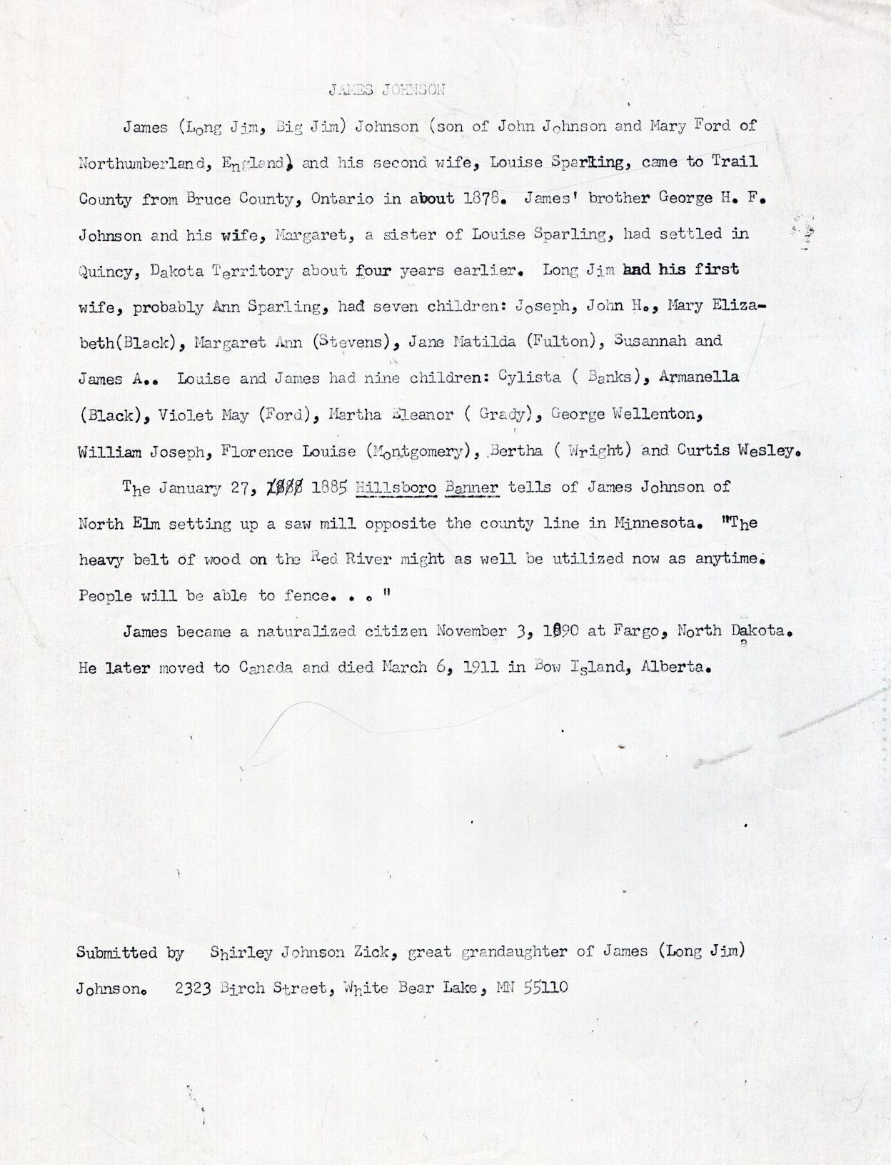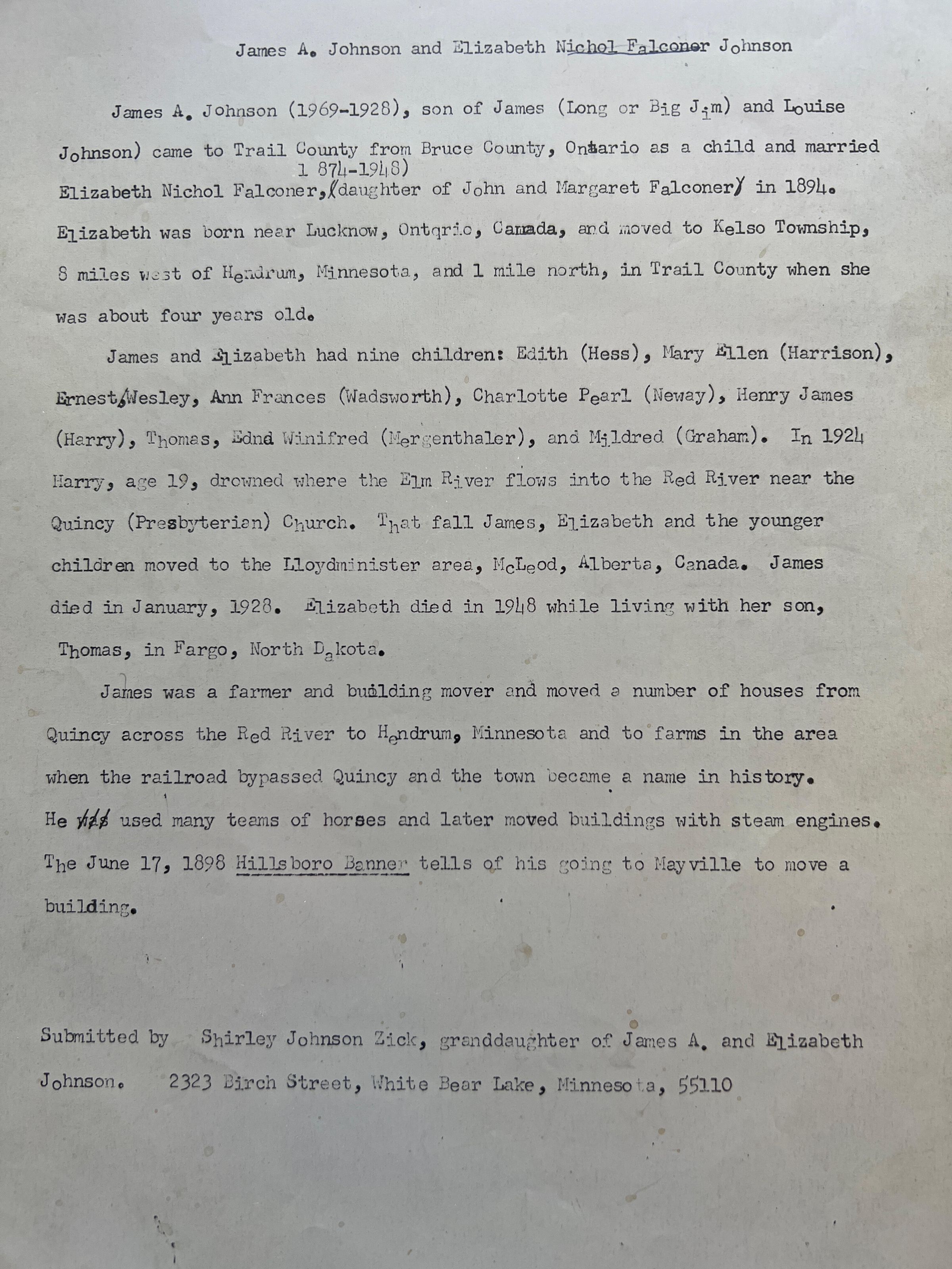 This folder has pages describing of the lives of James A. and Elizabeth (Falconer) Johnson, and their nine children. James A. Johnson was born in January 1870 in Varna, Huron County, Ontario Province, Canada, the seventh child of James and Ann (Sparling) Johnson. James A. Johnson's grandparents were John and Mary (Ford) Johnson of Huron County, Ontario. A chart of descendants of John and Mary (Ford) Johnson includes James and Ann (Sparling) Johnson as No. 5 under "Generation No. 2" and James A. and Elizabeth (Falconer) Johnson as No. 22 under "Generation No. 3" (see Catalogit Family History entry 2025.205.1).