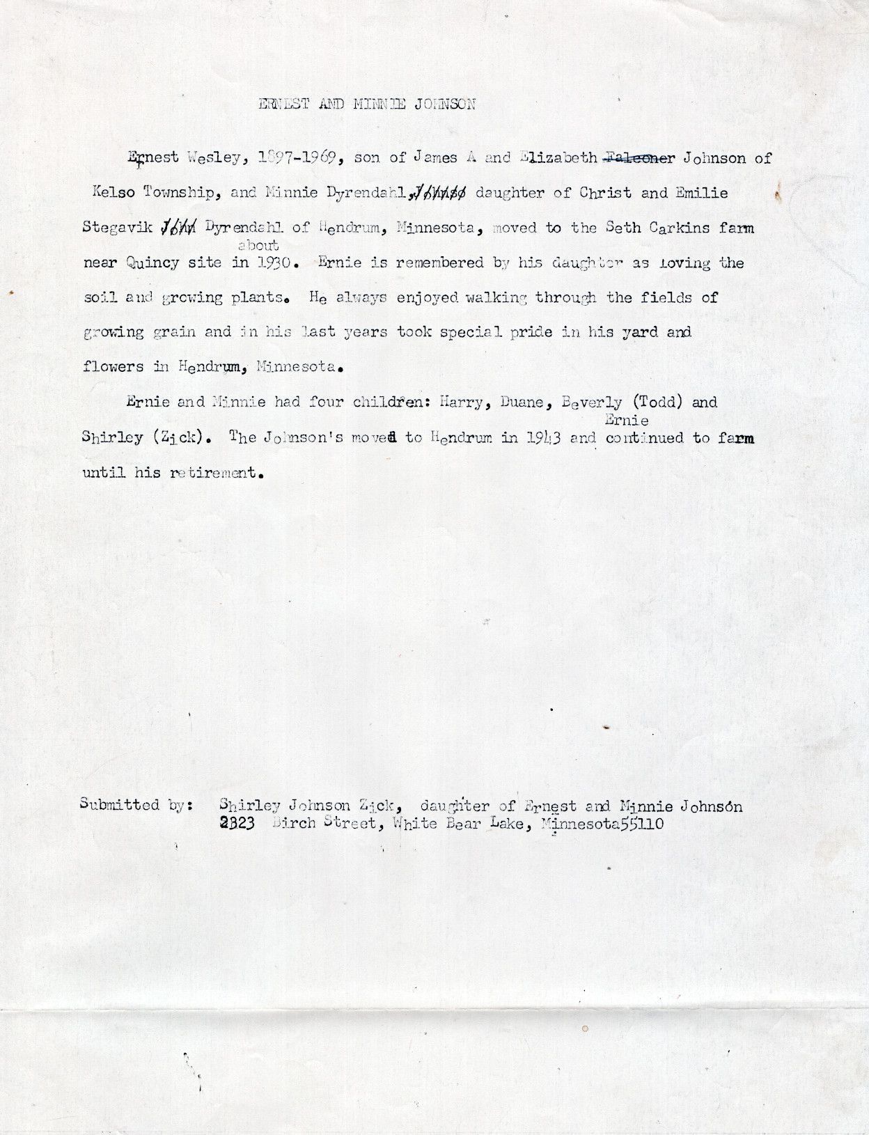 A page describing their son, Ernest & Minnie (Stegavik) Johnson is included in this folder.